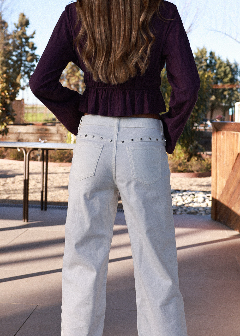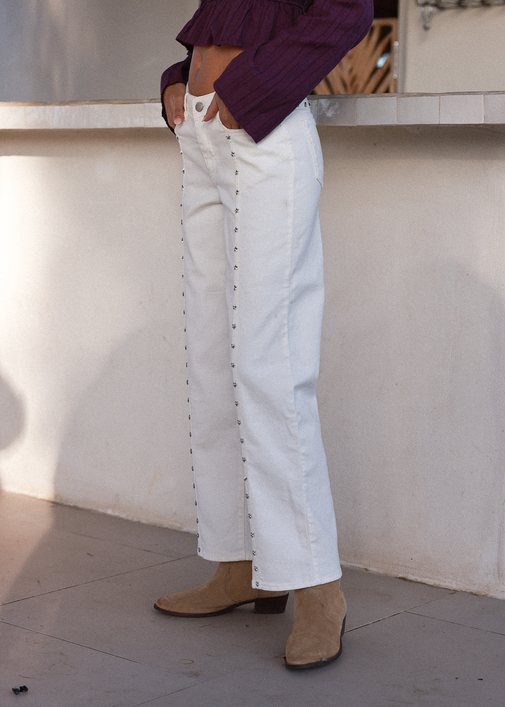 Pantalón recto color blanco hueso con detalle de tachuelas en forma de estrella.