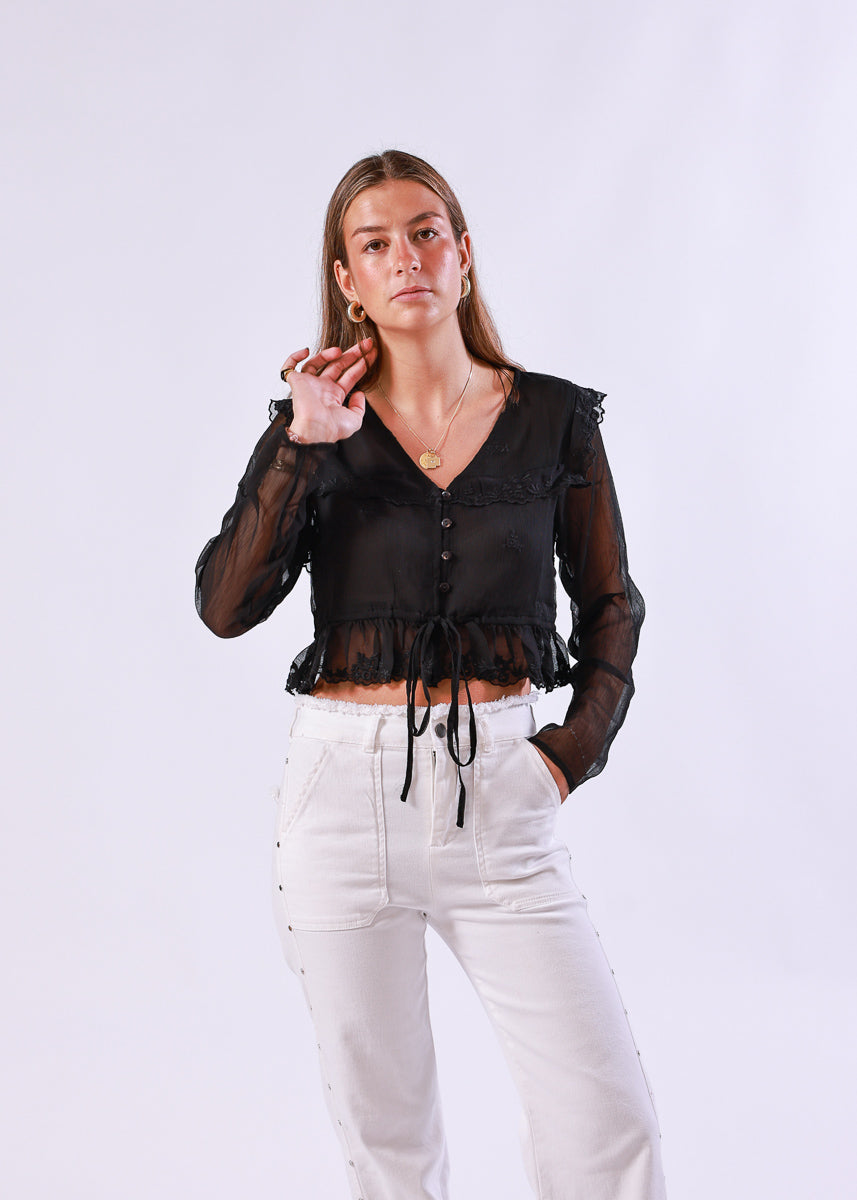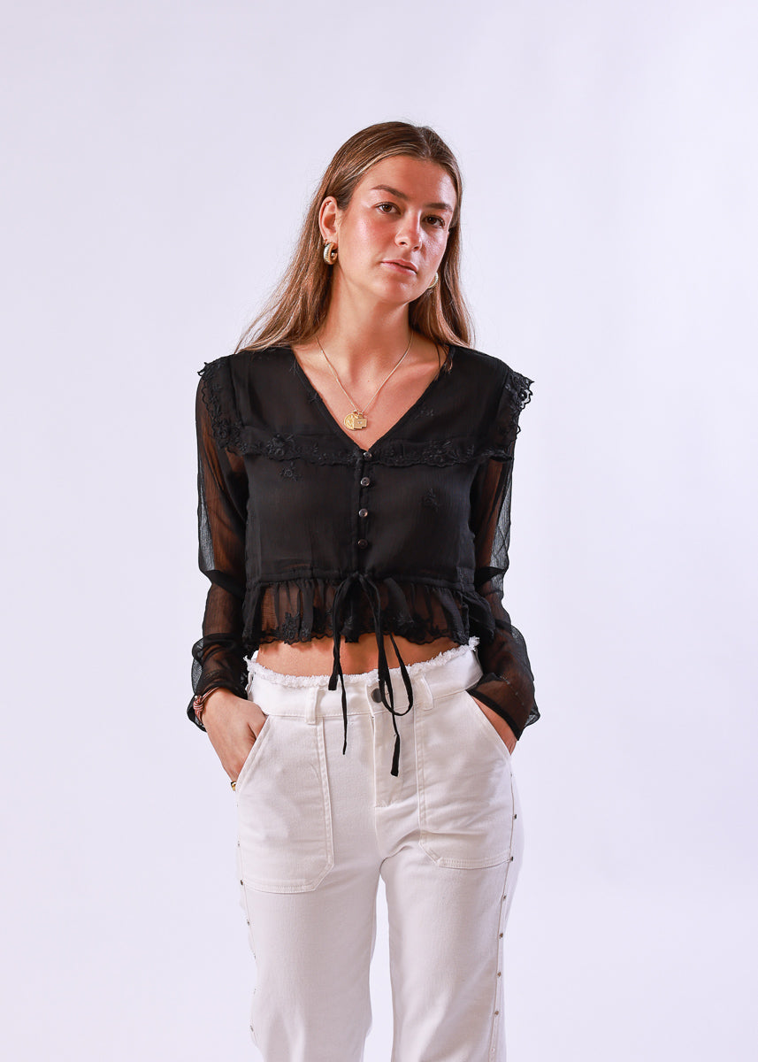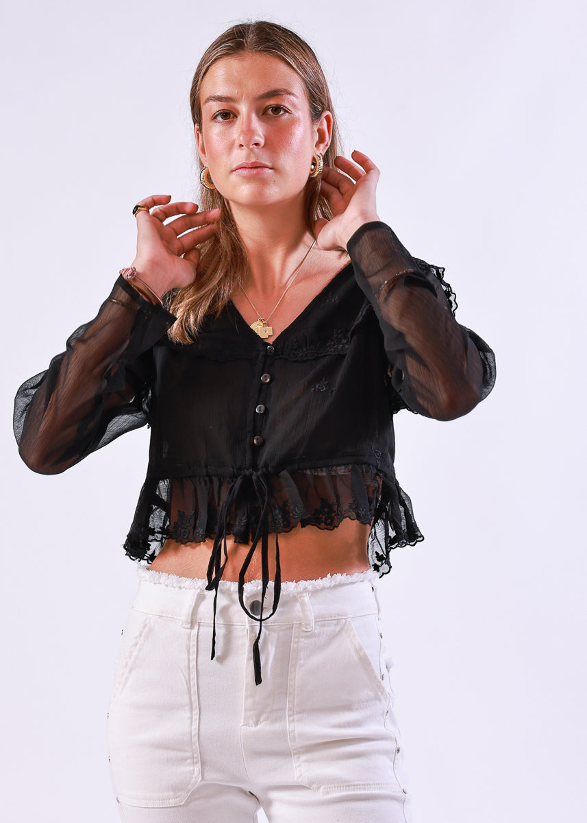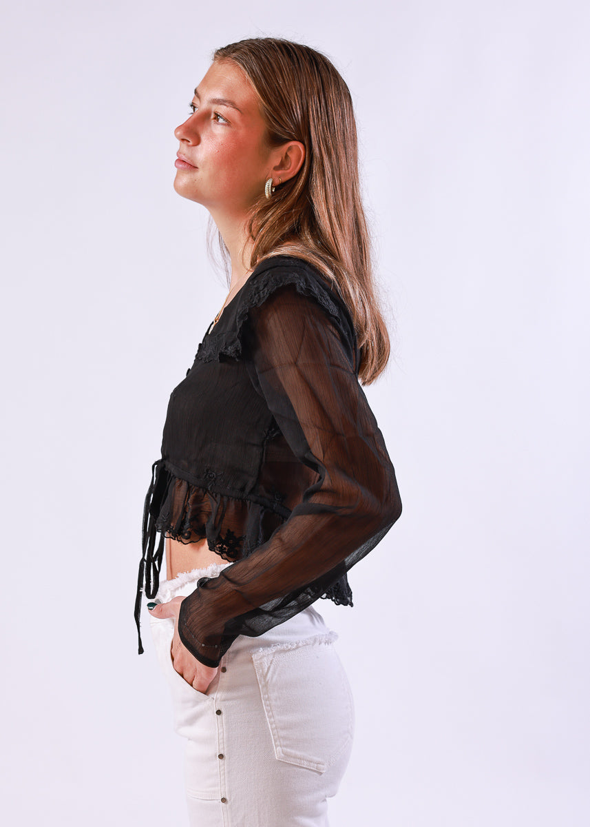 Blusa corta de manga larga en color negro de gasa semitransparente, con detalle de encaje floral y lazo ajustable en la cintura.