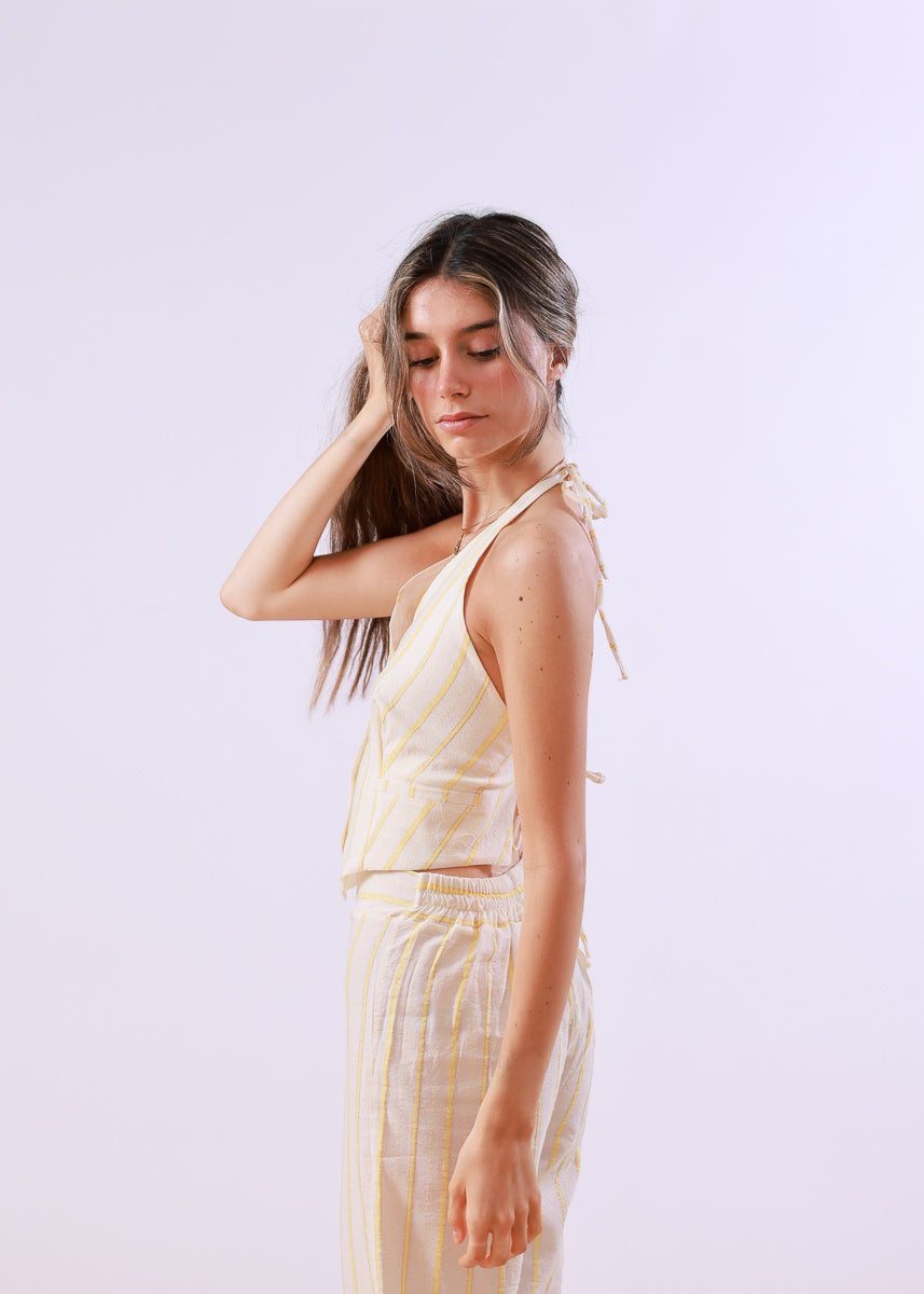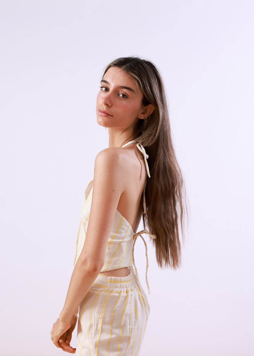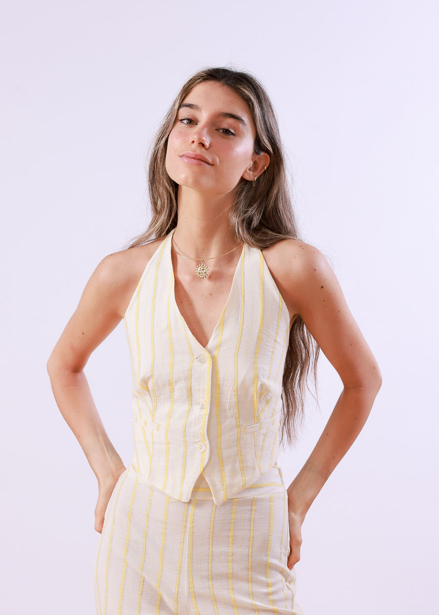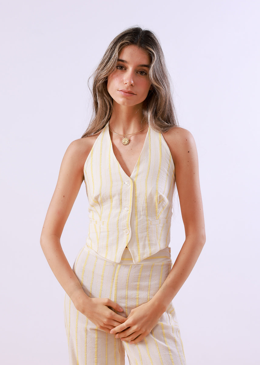 Chaleco de estampado en rayas color amarillo con brillo y detalle de botones.
