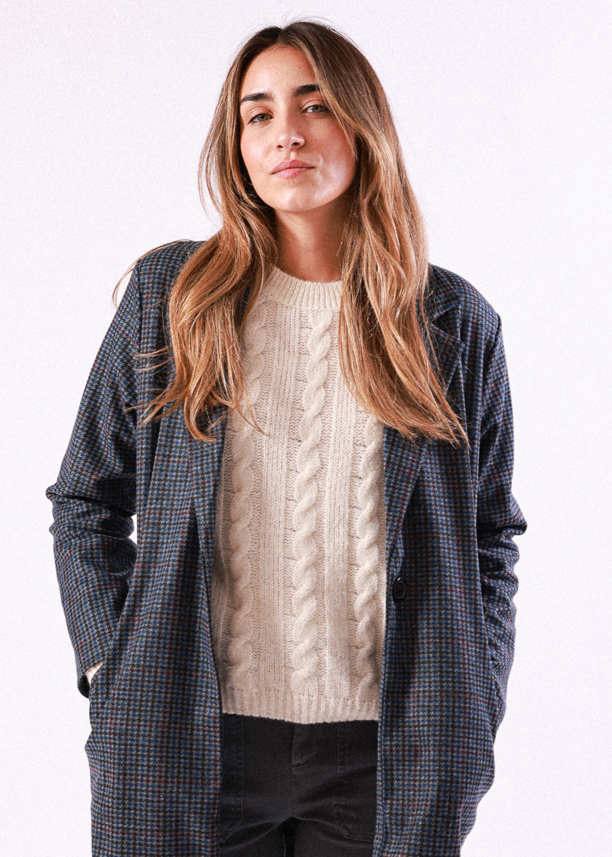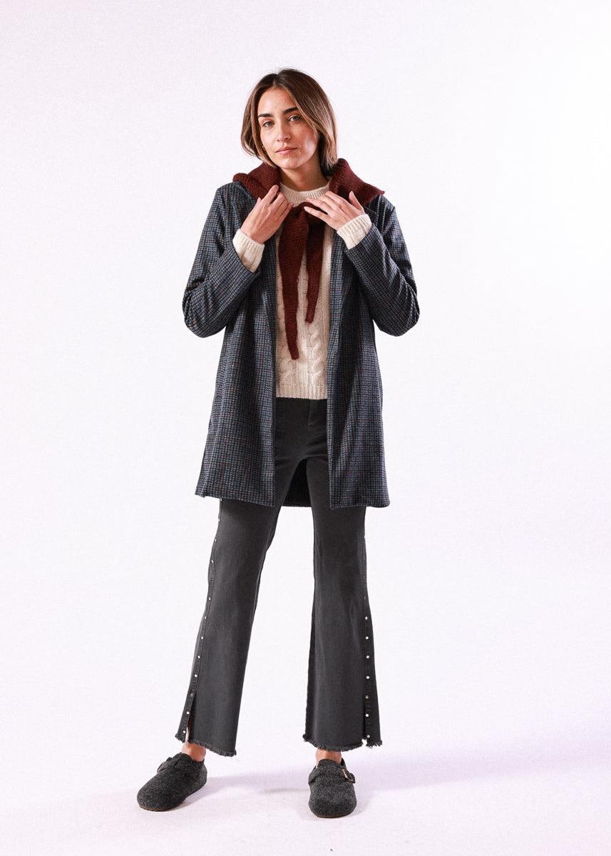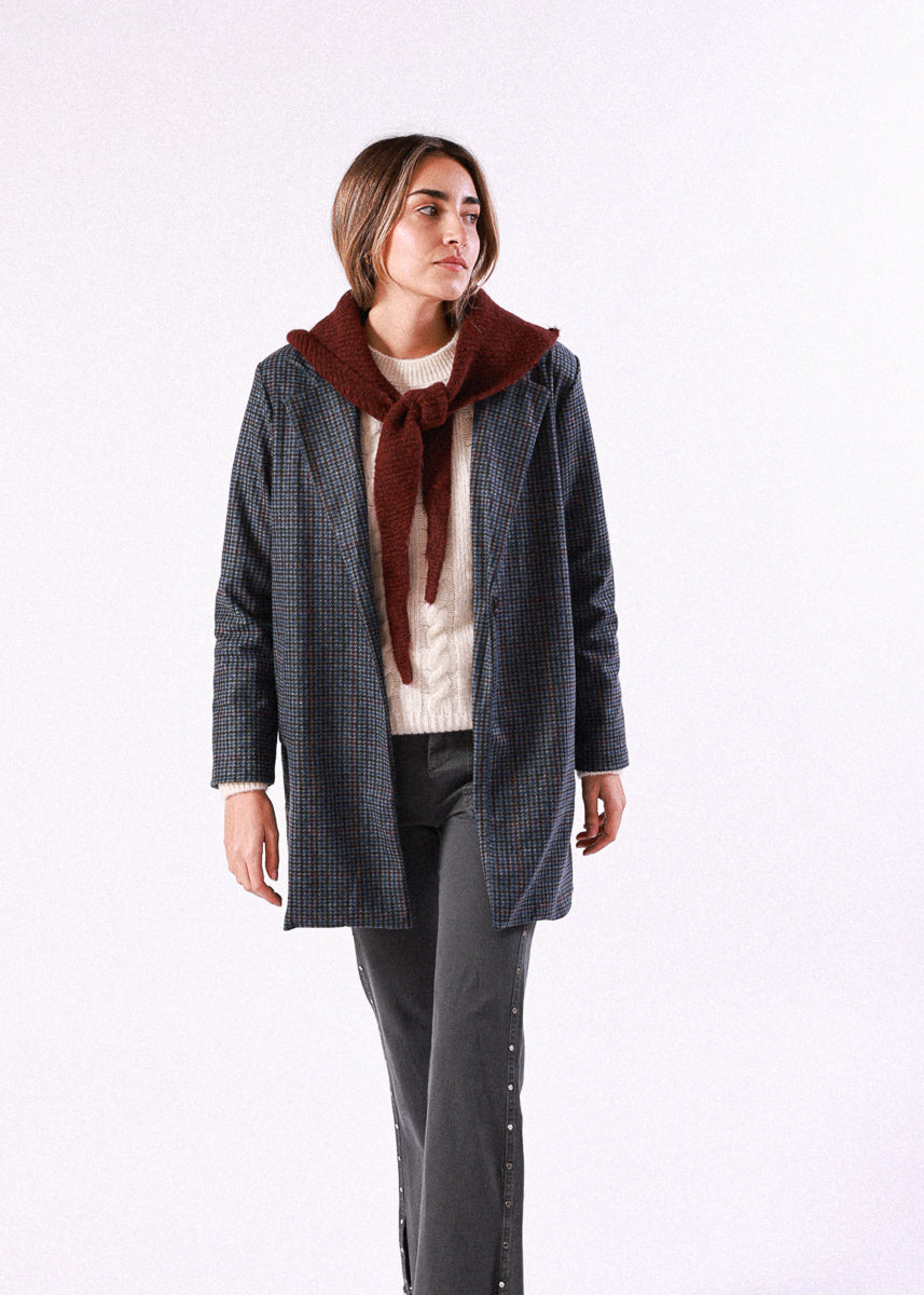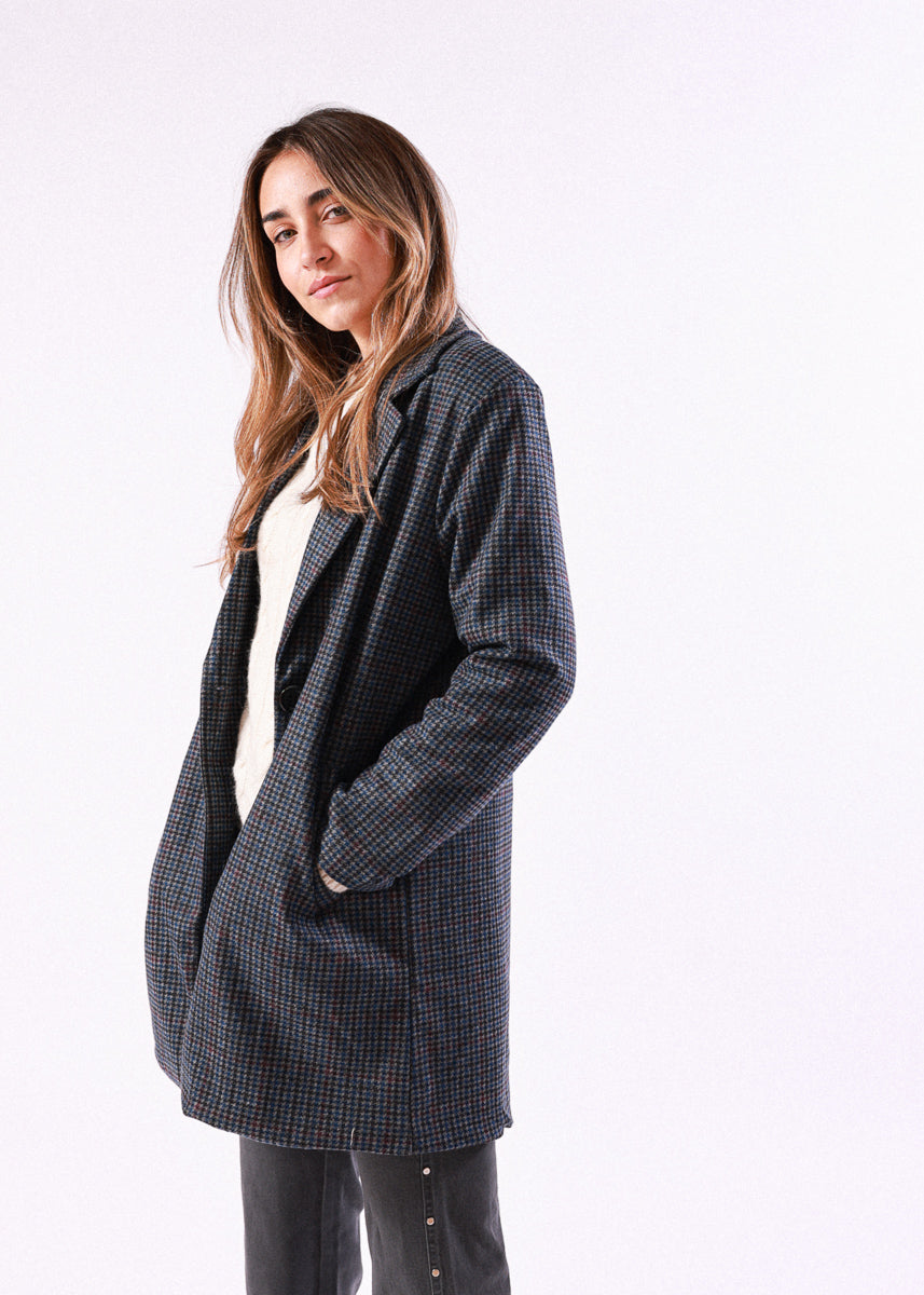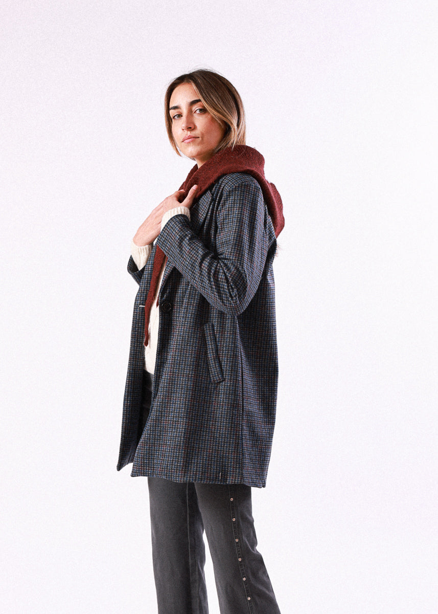 Abrigo de cuadros en tono azulado con cierre de botón y solapa clásica.