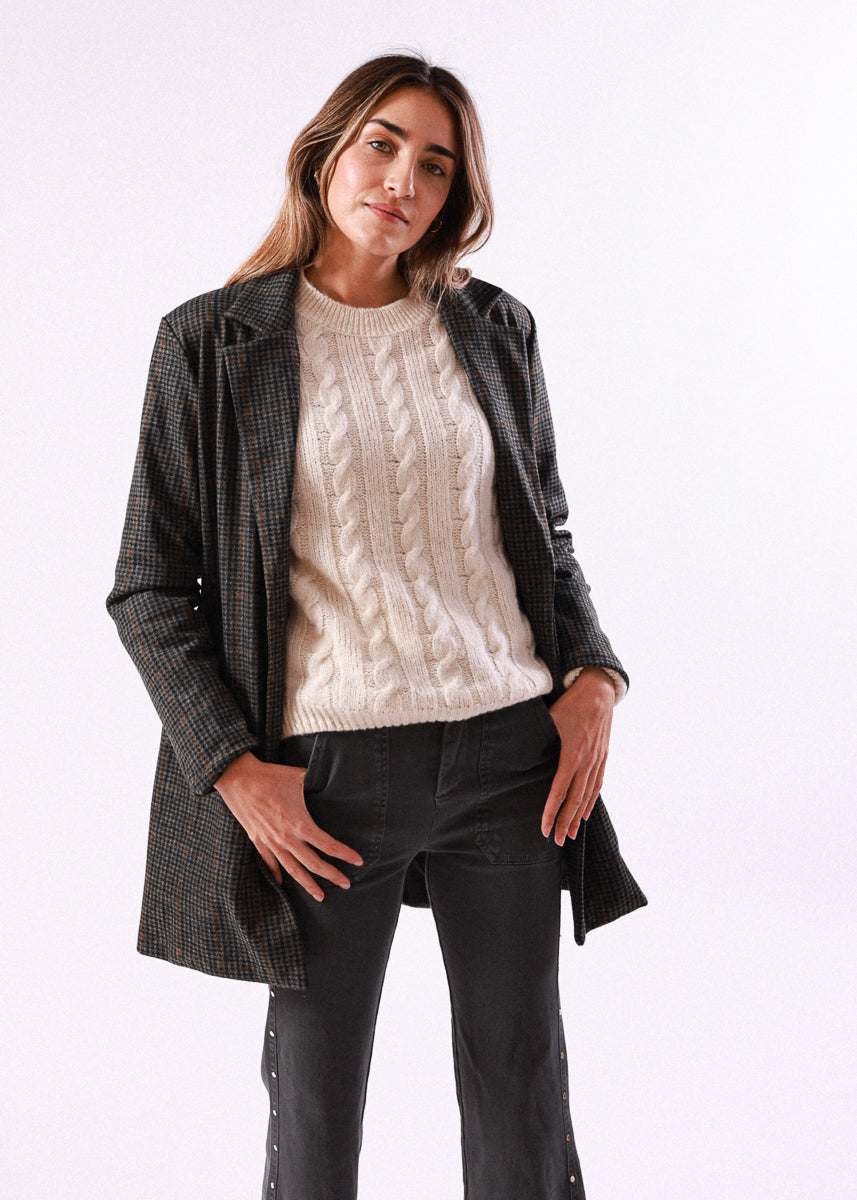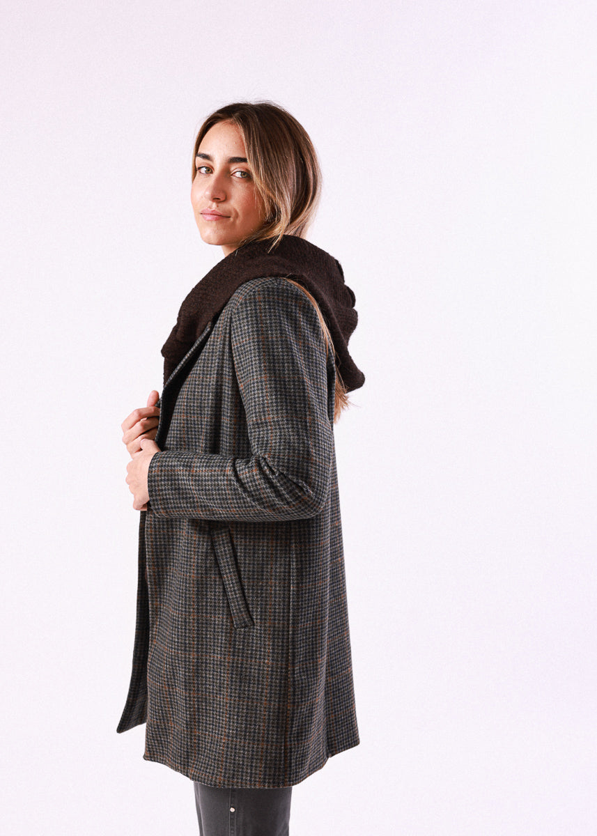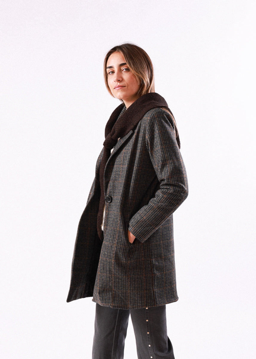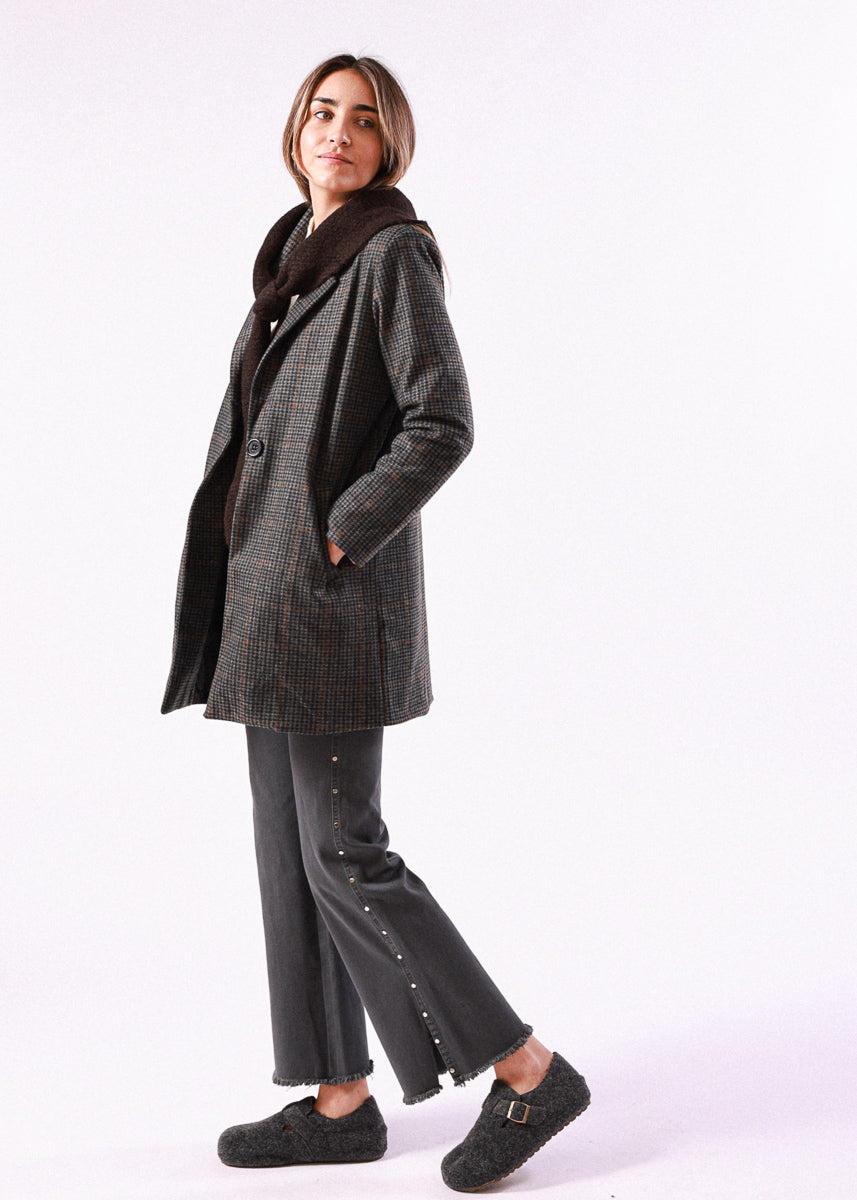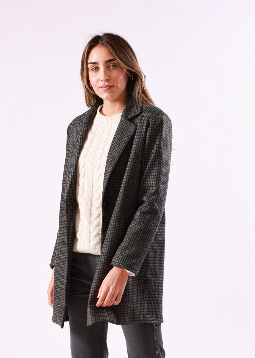 Abrigo de cuadros en tono gris con cierre de botón y solapa clásica.