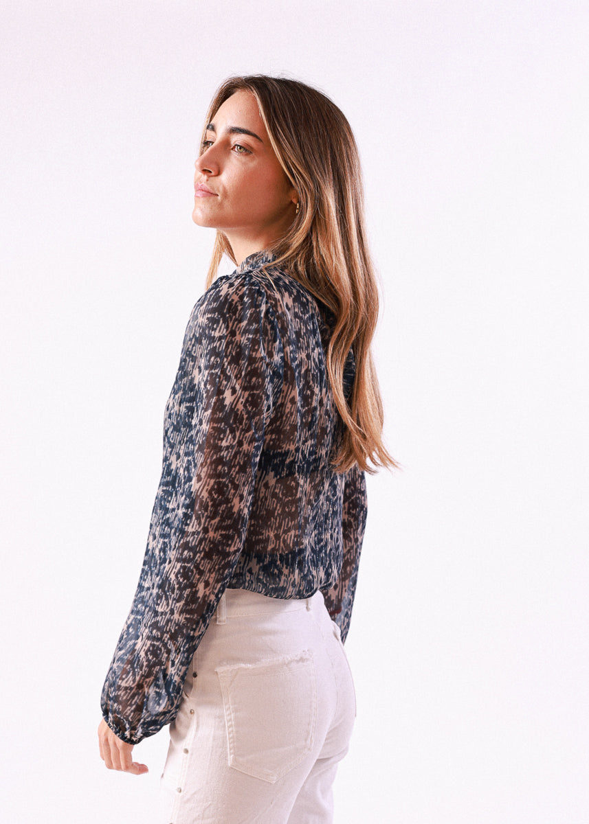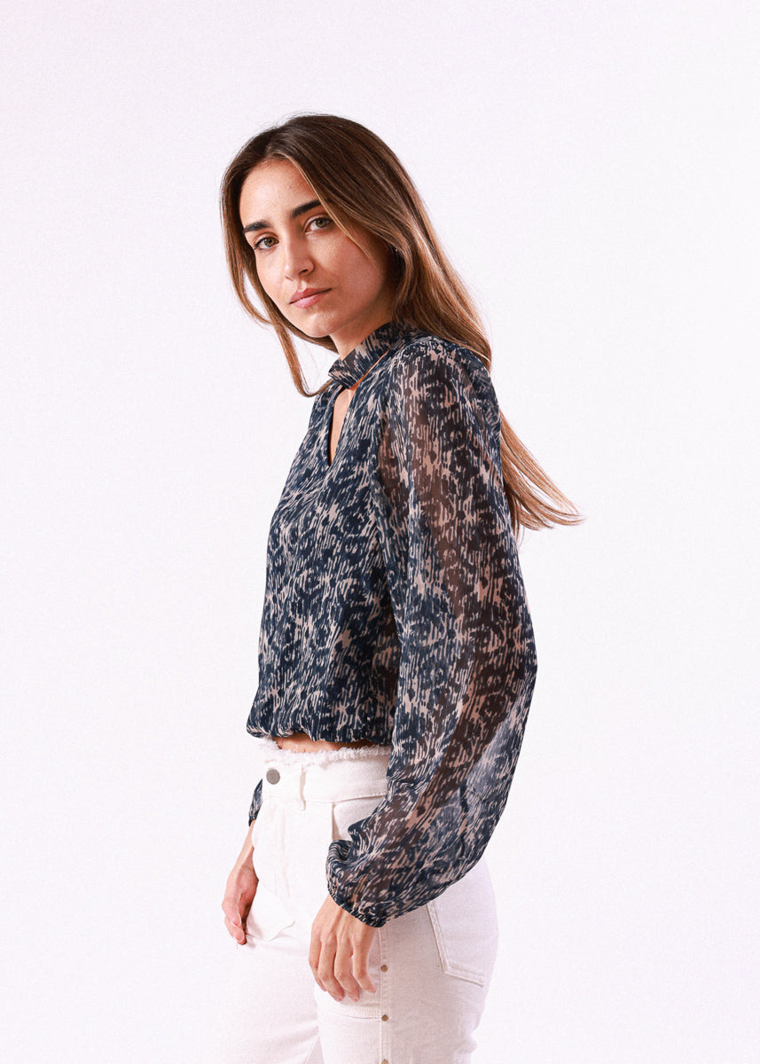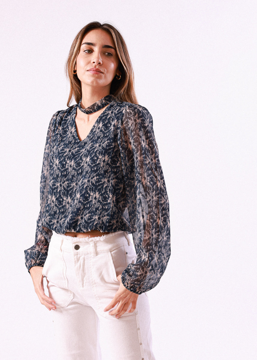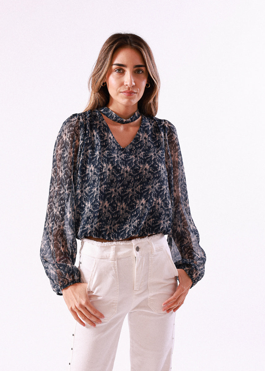 Blusa estampada en tonos azul y blanco crudo, de cuello tipo halter con tiras para anudar por detrás y escote en pico. Mangas largas con puños elásticos y caída fluida.