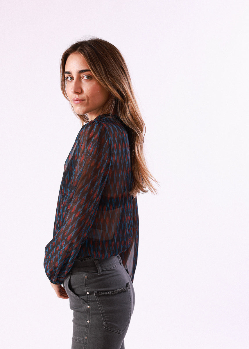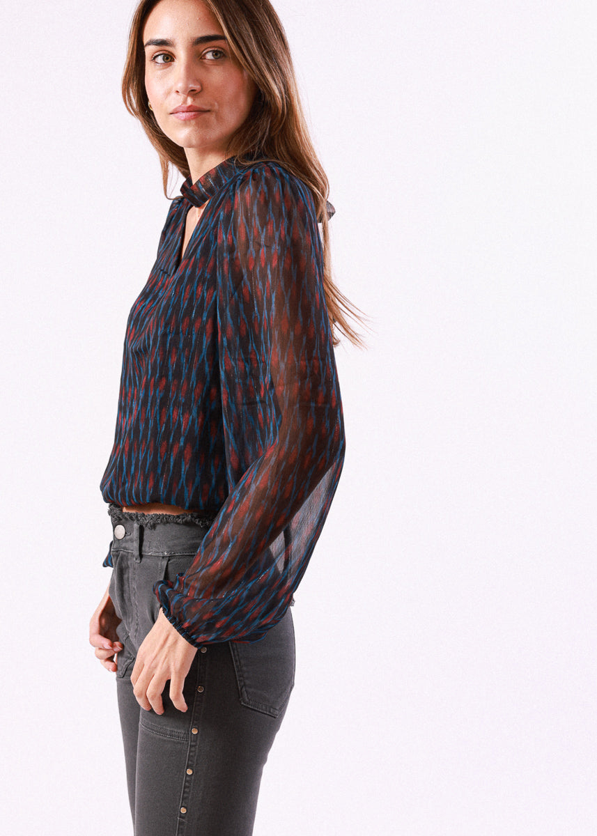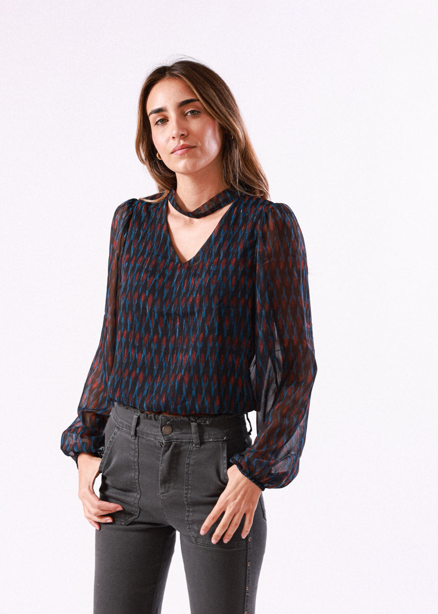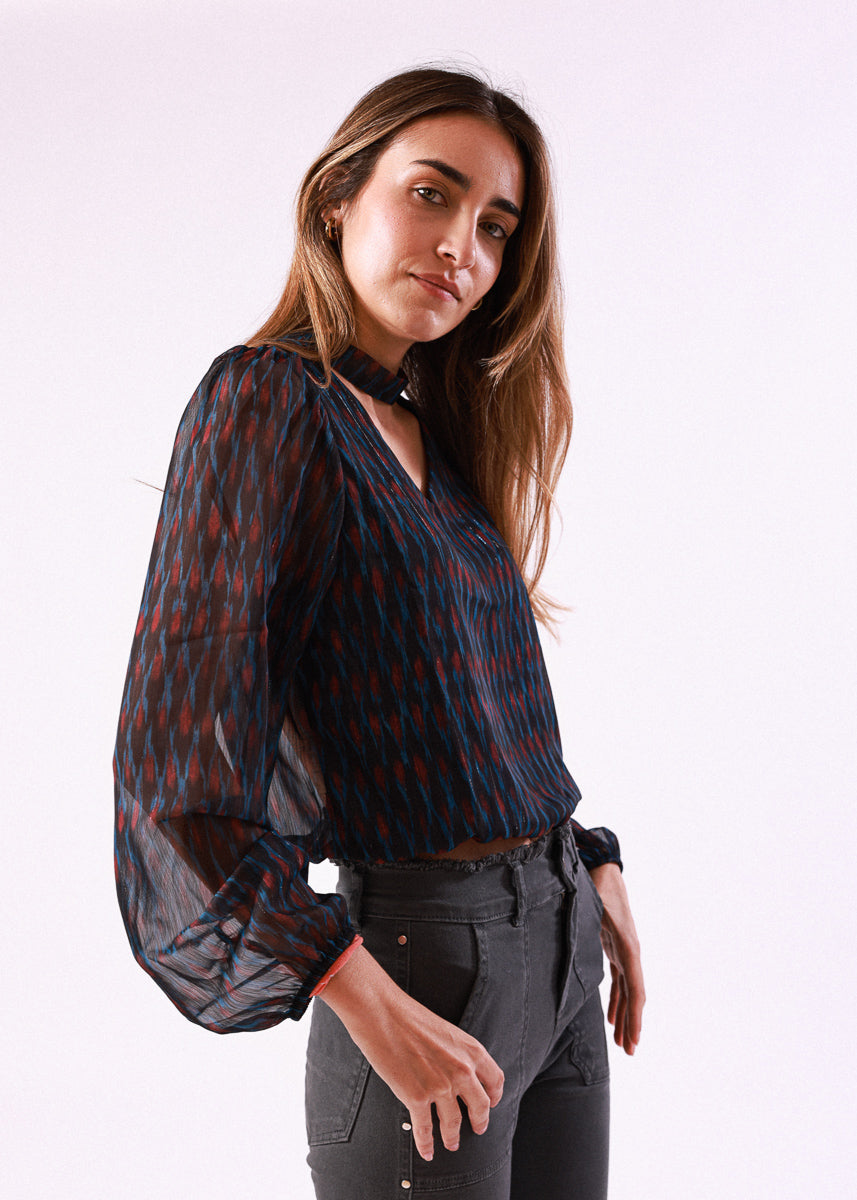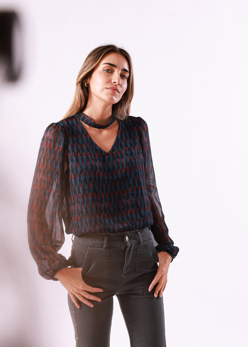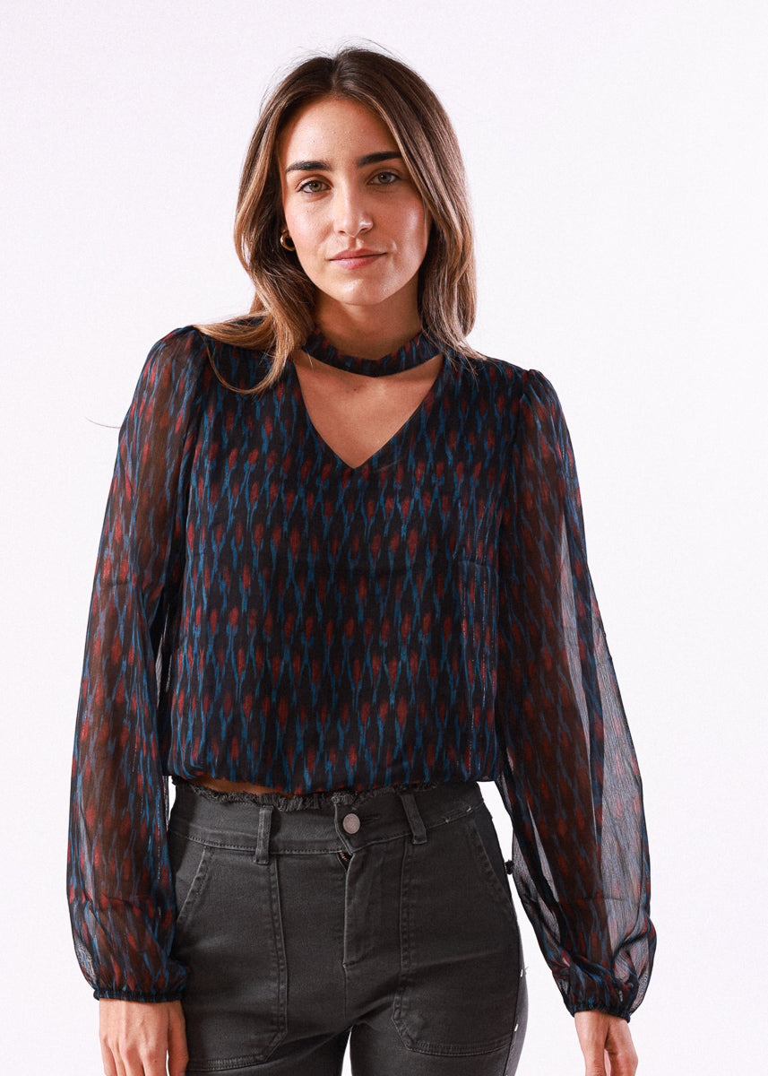 Blusa estampada en tonos azul azul y rosado oscuro, de cuello tipo halter con tiras para anudar por detrás y escote en pico. Mangas largas con puños elásticos y caída fluida.