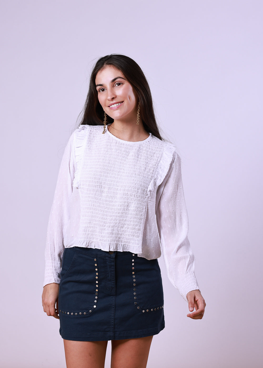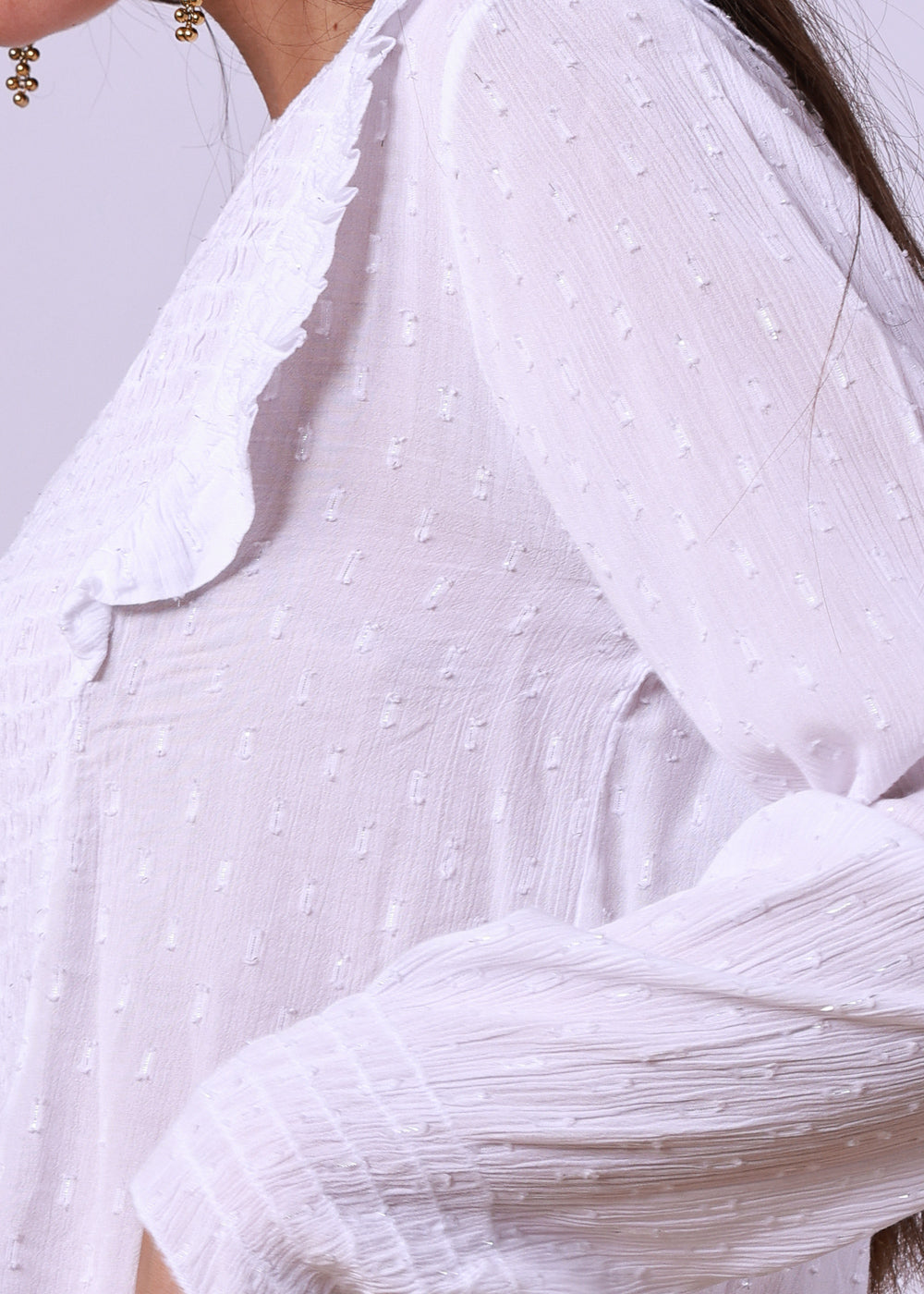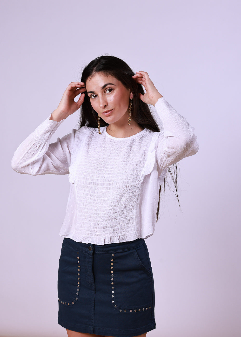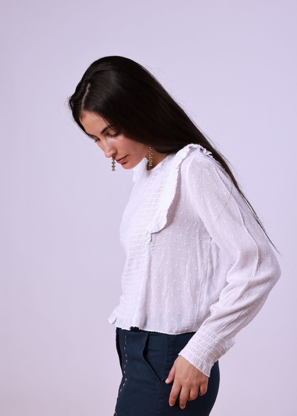 Blusa color blanco con detalle de brillos de manga larga, presenta una textura fruncida y volantes en los hombros. Perfecta para un estilo casual chic.