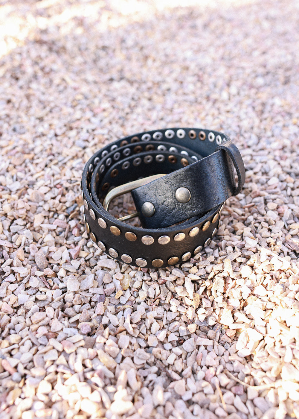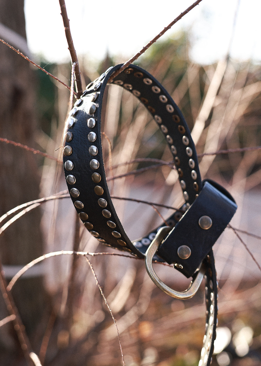 Cinturón de piel color negro con detalle de tachuelas redondas bicolor.