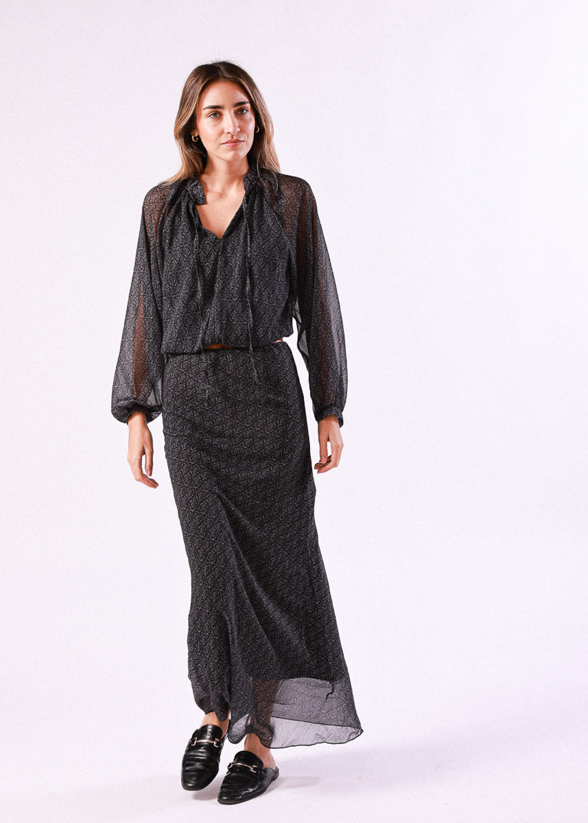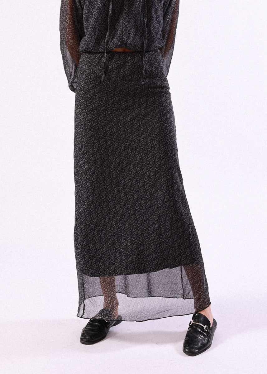 Falda larga estampada en color azul oscuro con goma elástica en la cintura y forro interior.