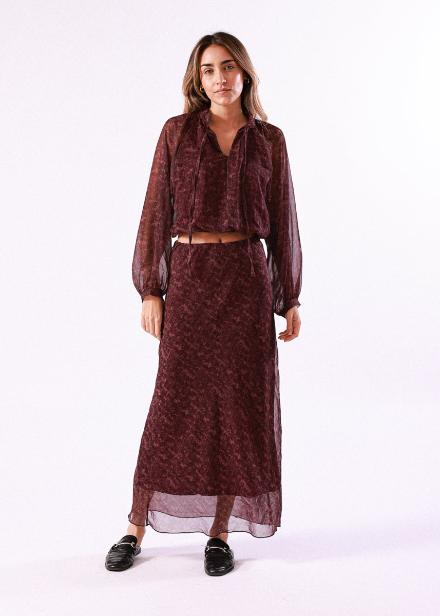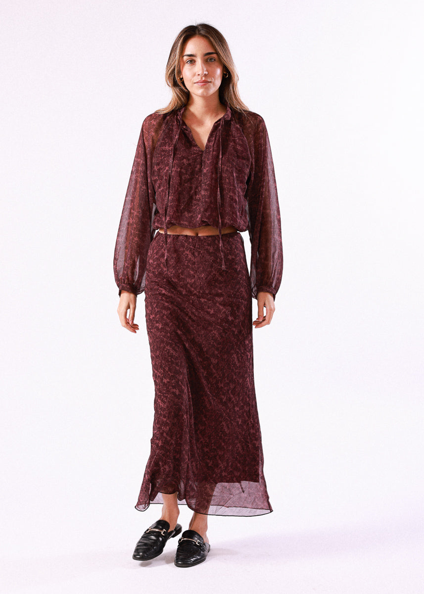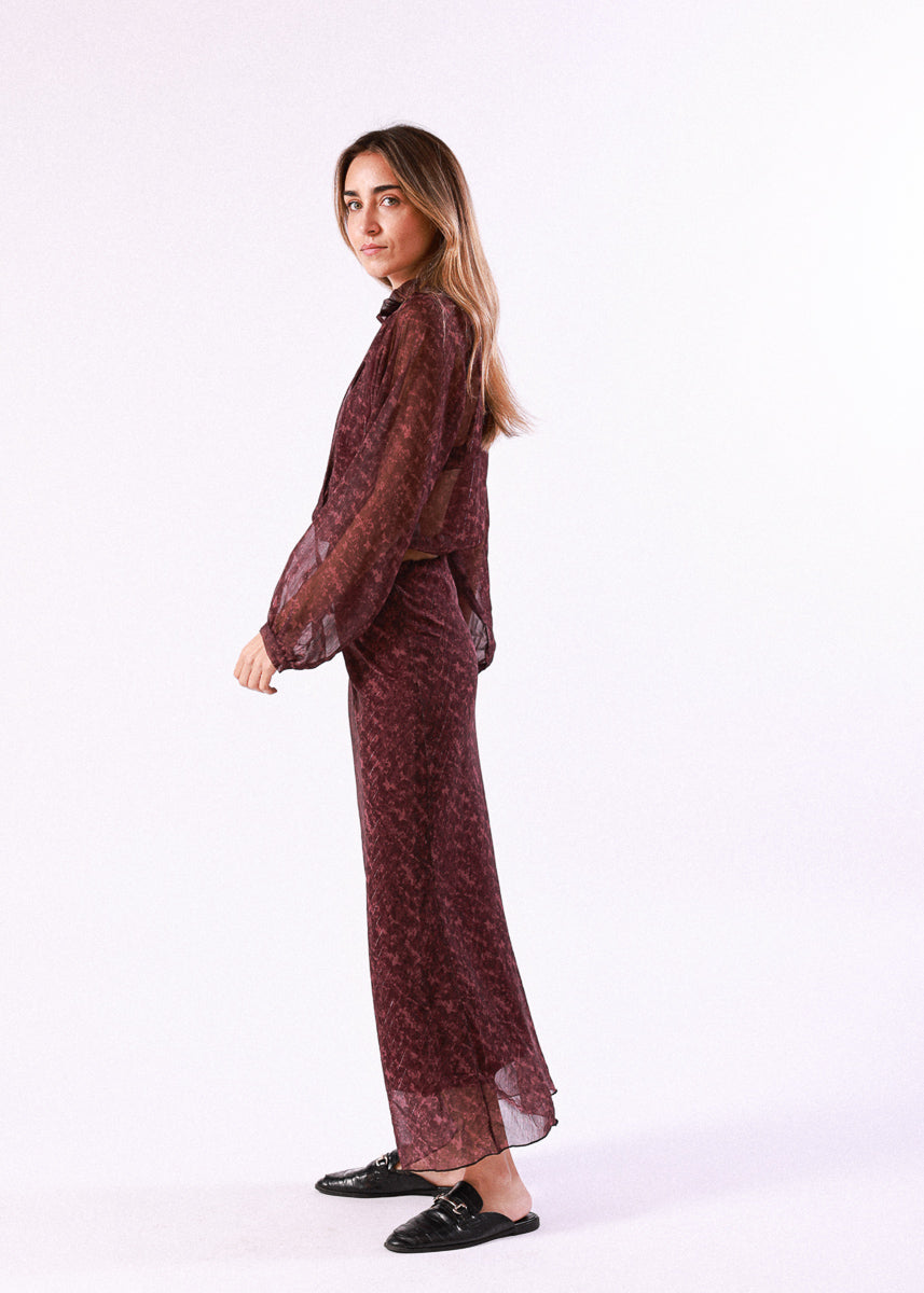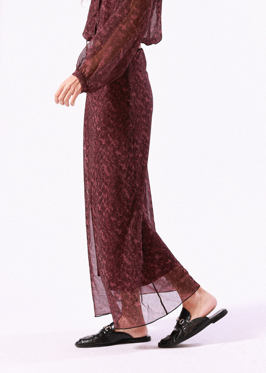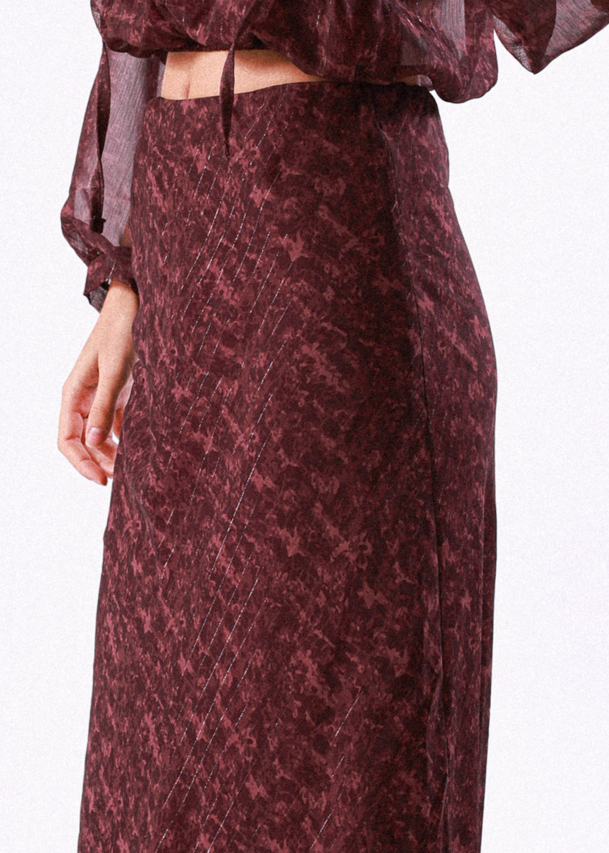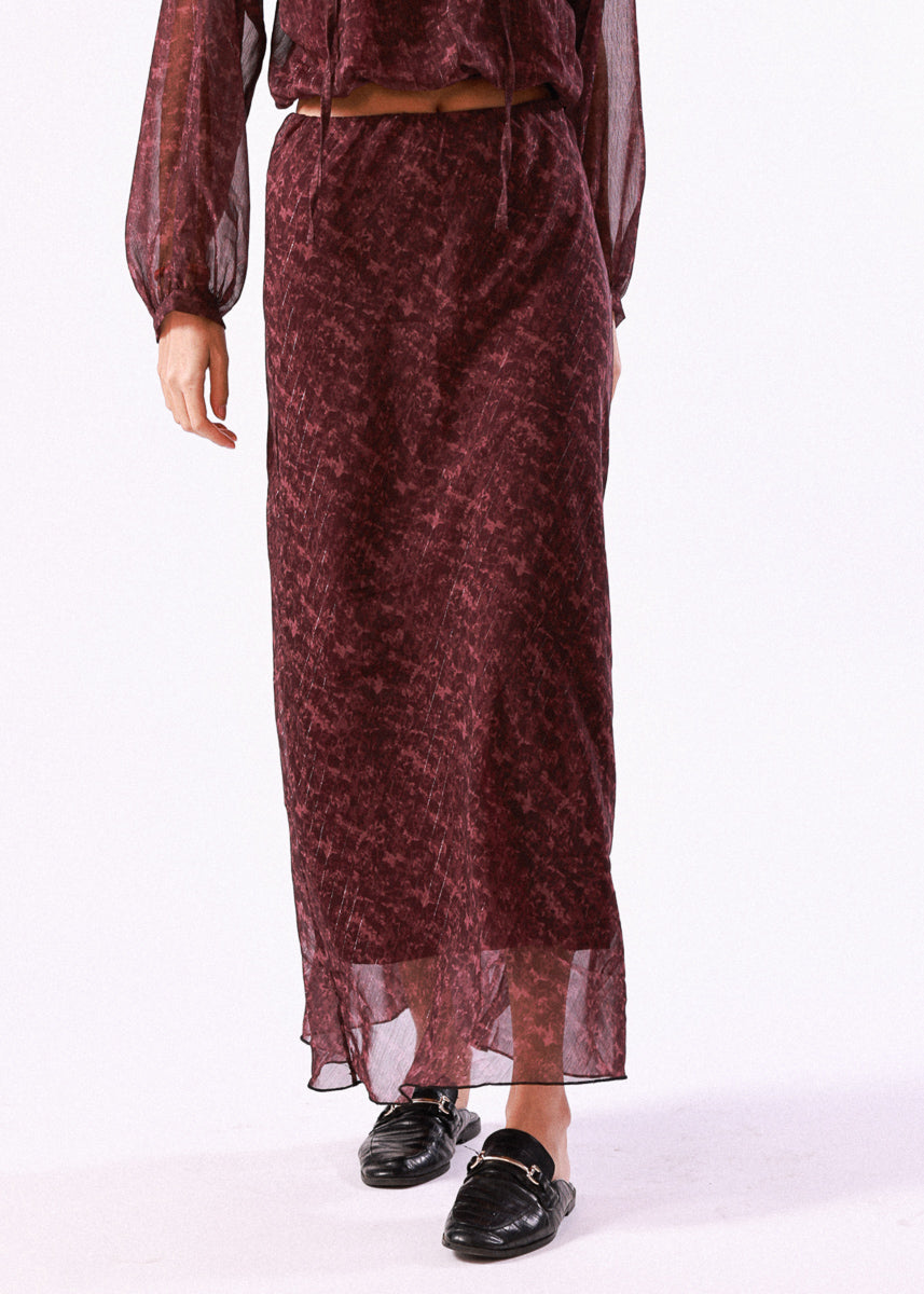 Falda larga estampada en color púrpura con goma elástica en la cintura y forro interior.
