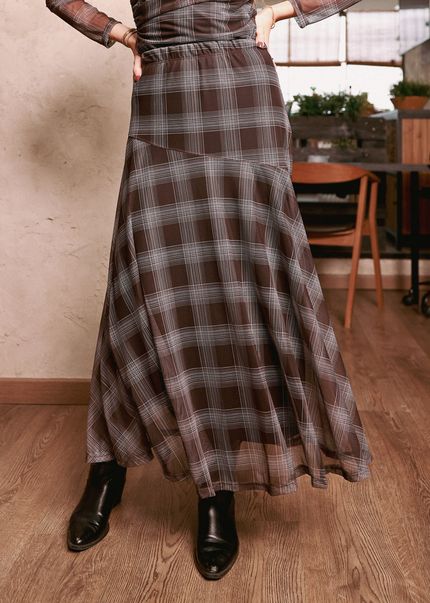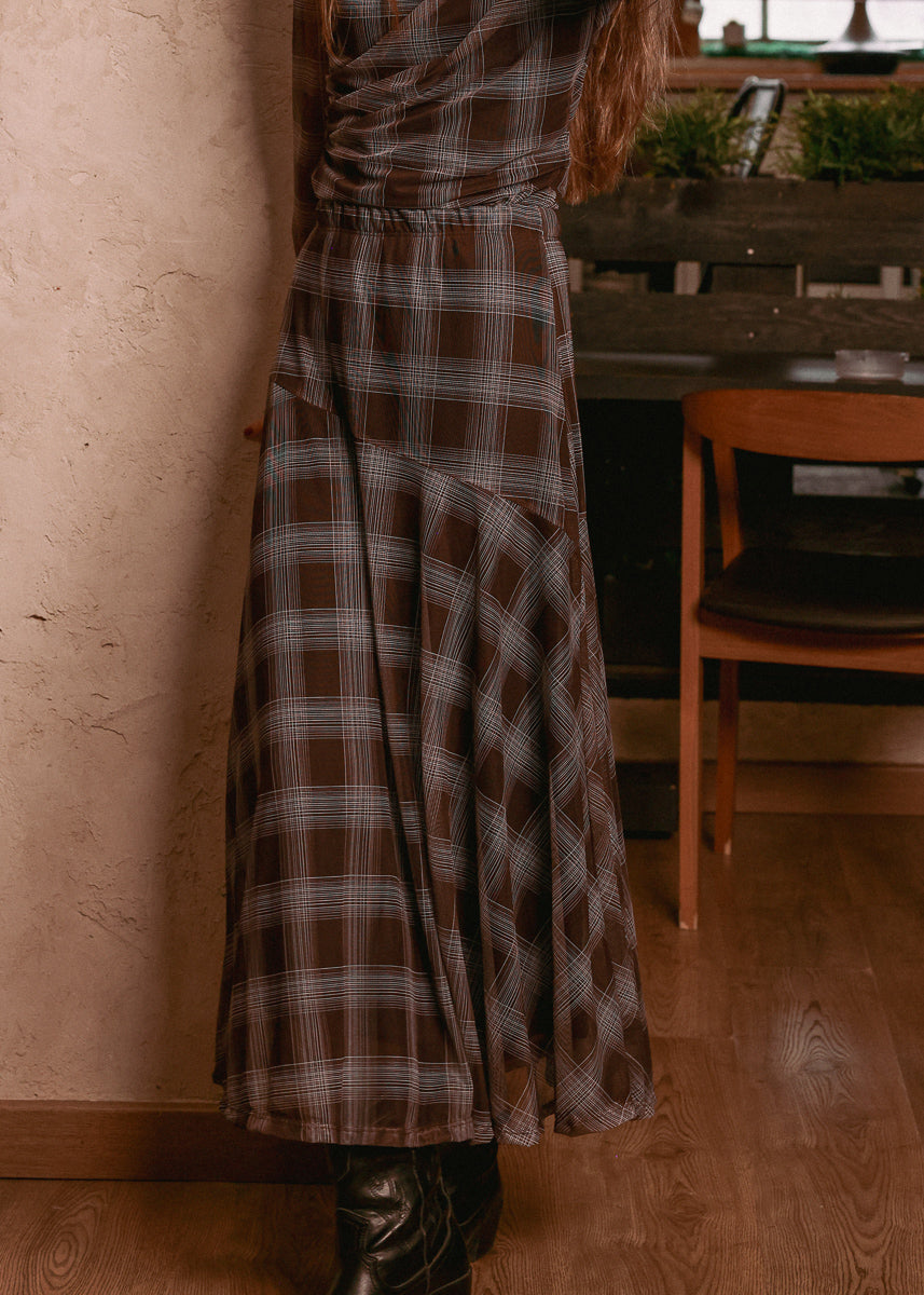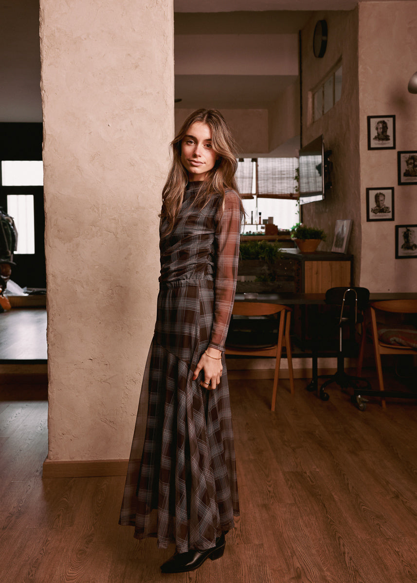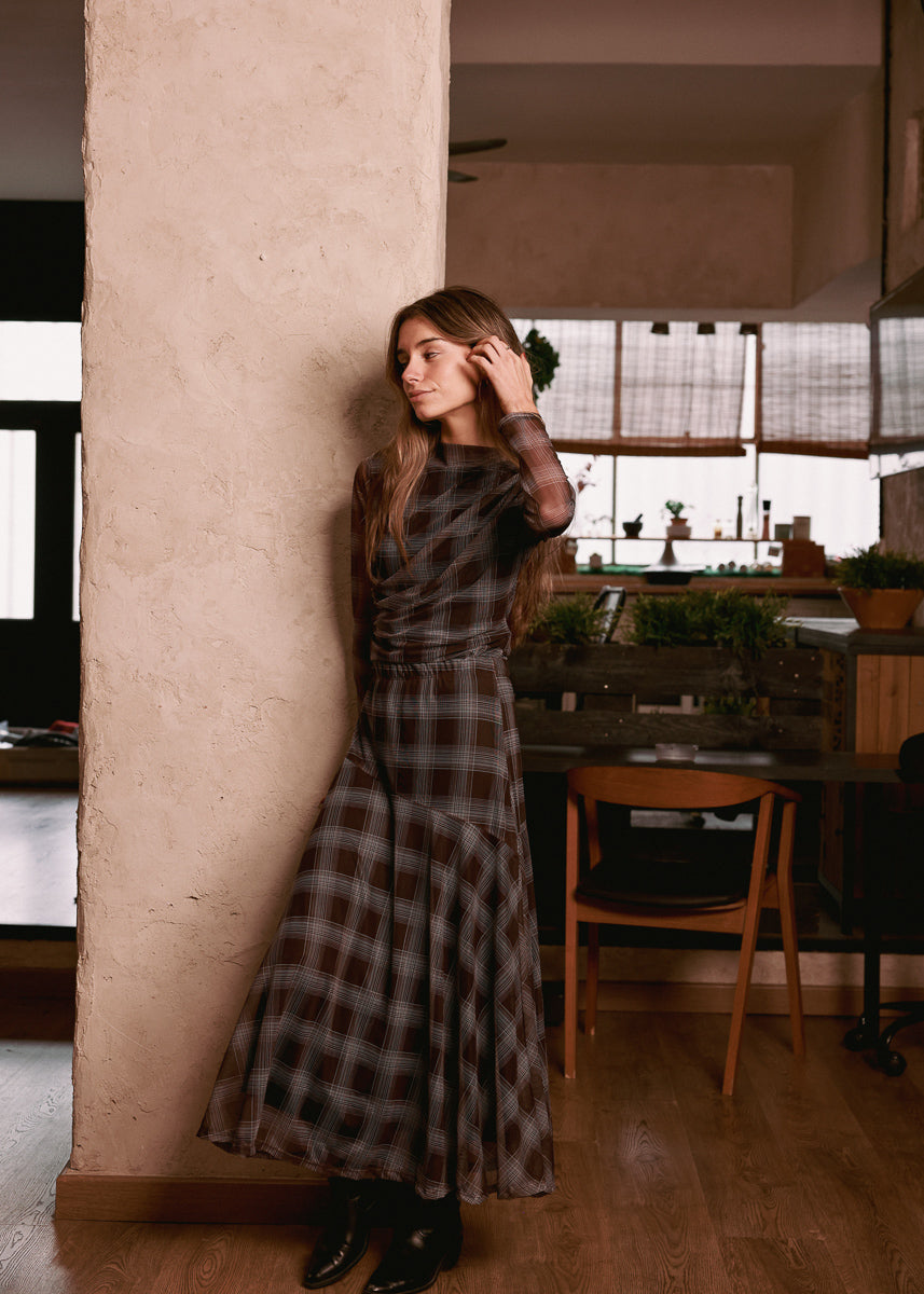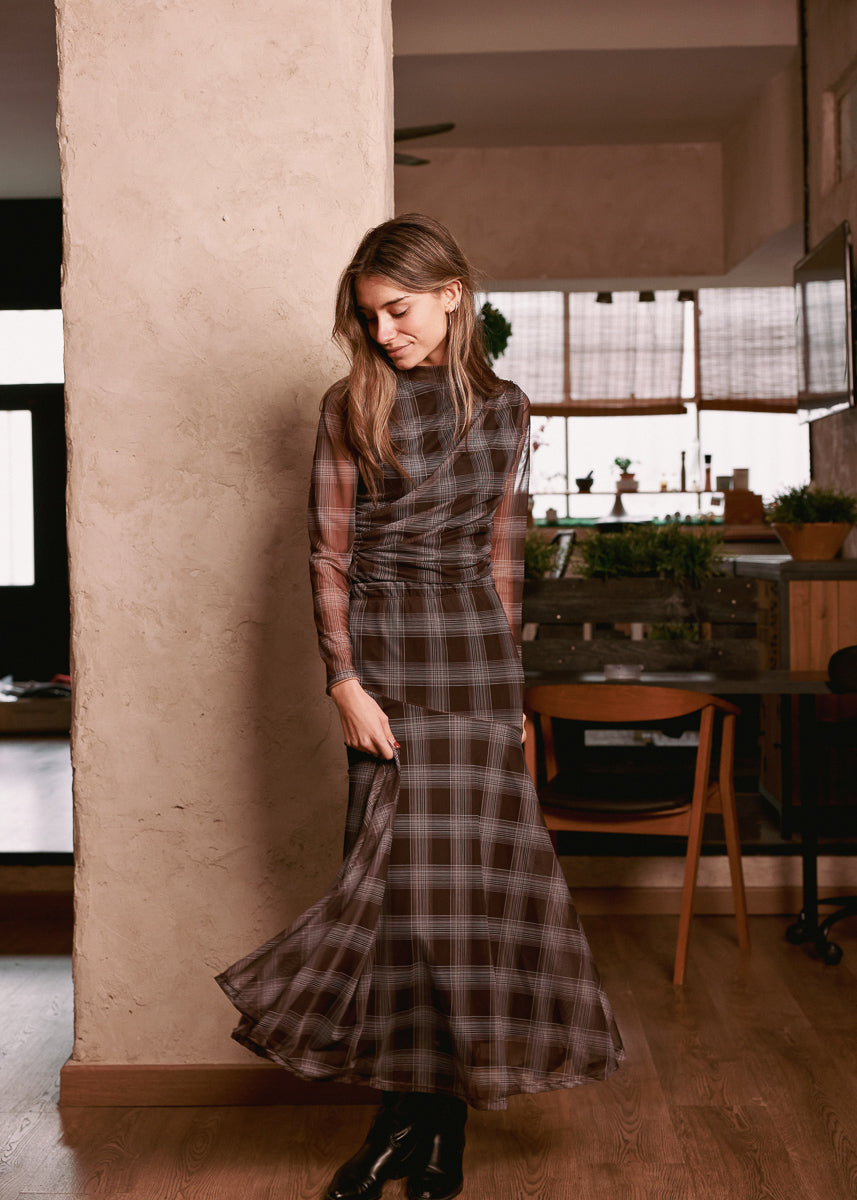 Falda larga de corte evasé con estampado de cuadros. Cintura elástica y tejido fluido que aporta movimiento.