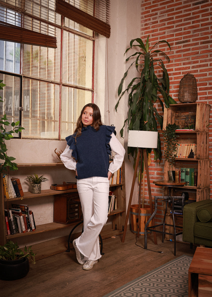 Chaleco en tono azul con detalle de volantes en los hombros y en el cuello.
