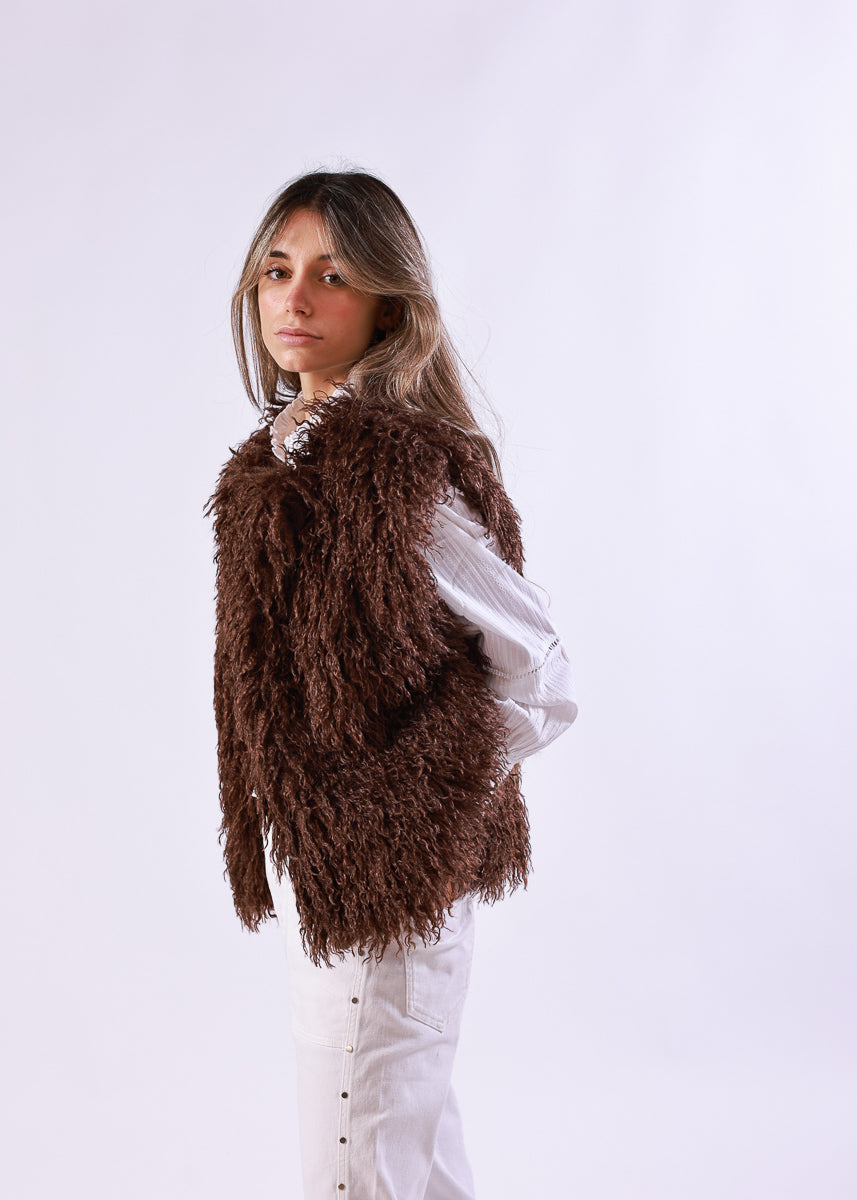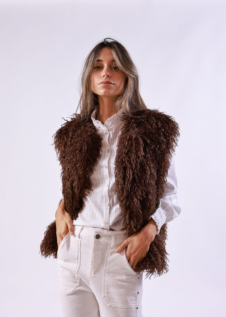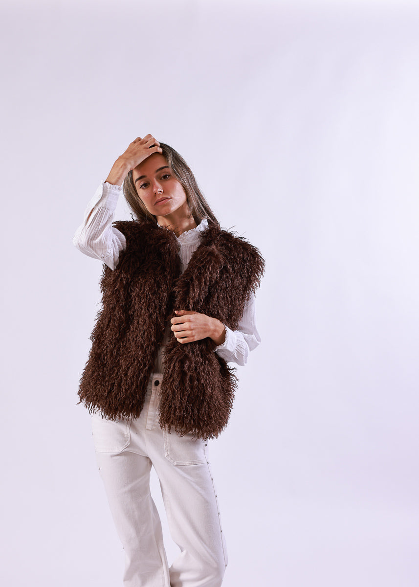 Chaleco sin mangas de pelo sintético largo en color marrón. De corte recto y sin cierre.