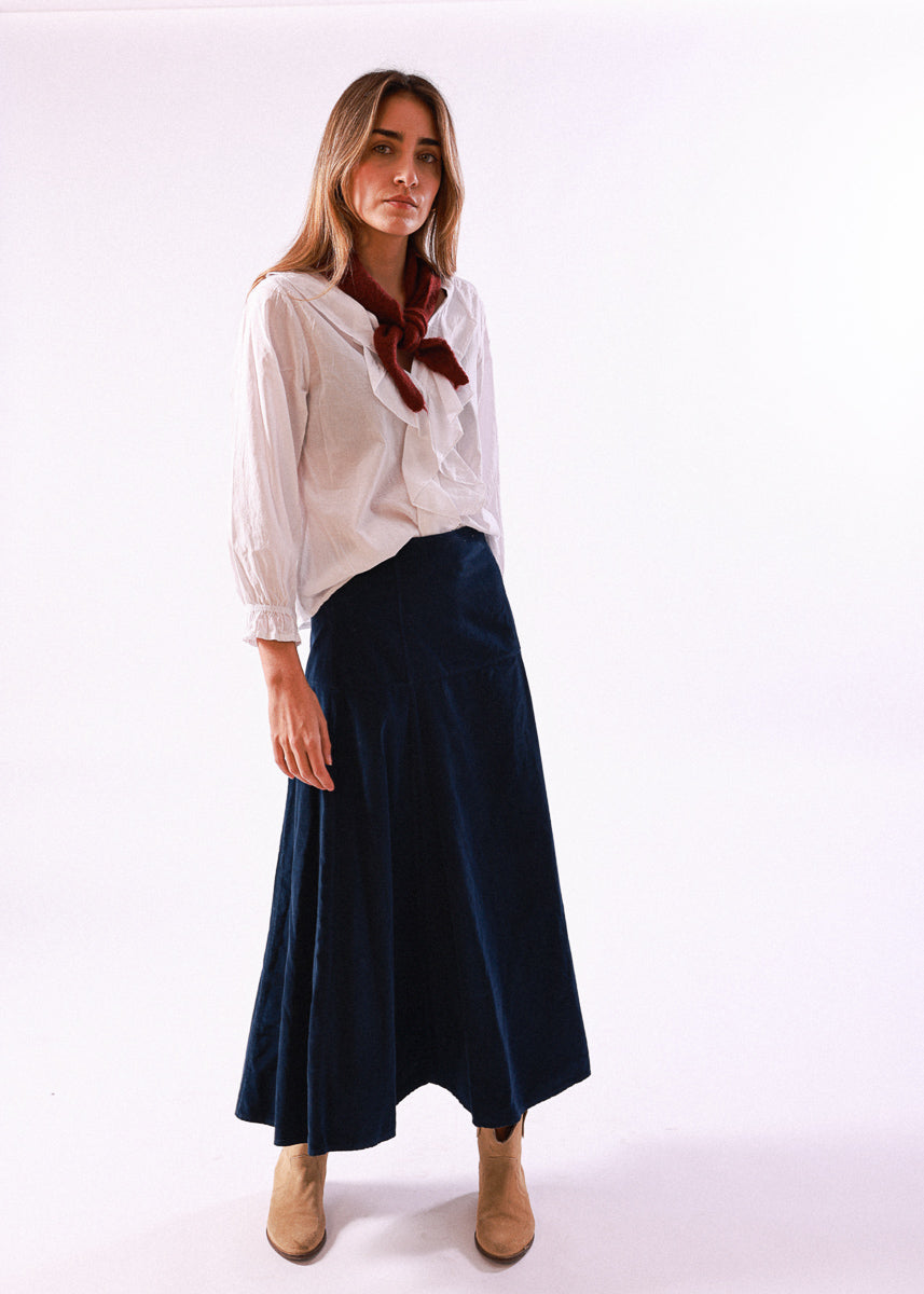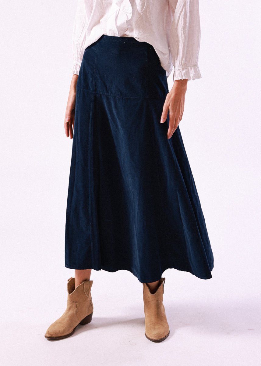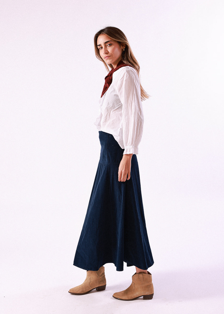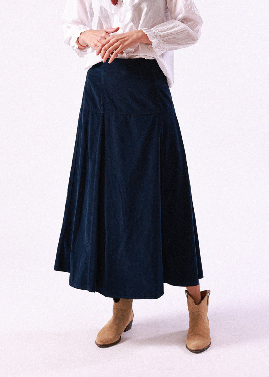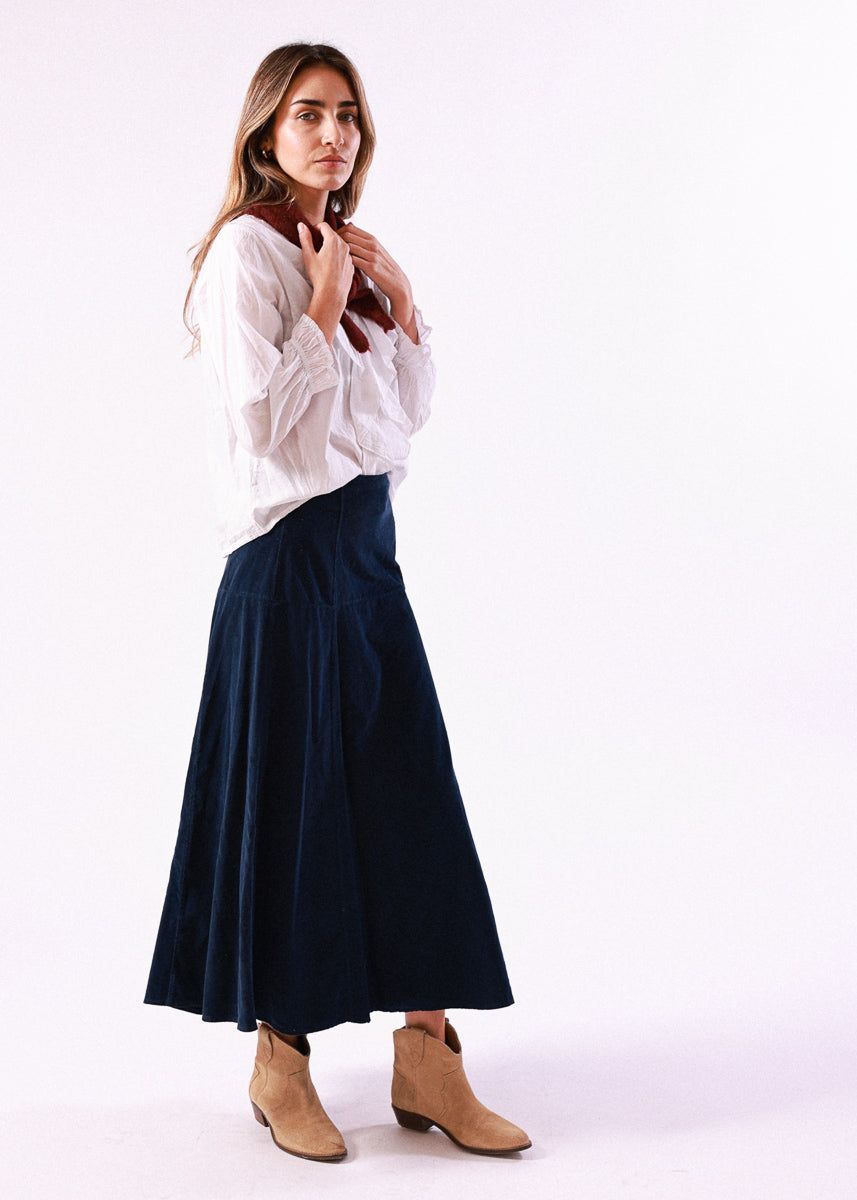 Falda larga de micropana en color azul marino, con corte evasé y cintura alta.