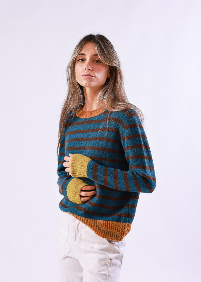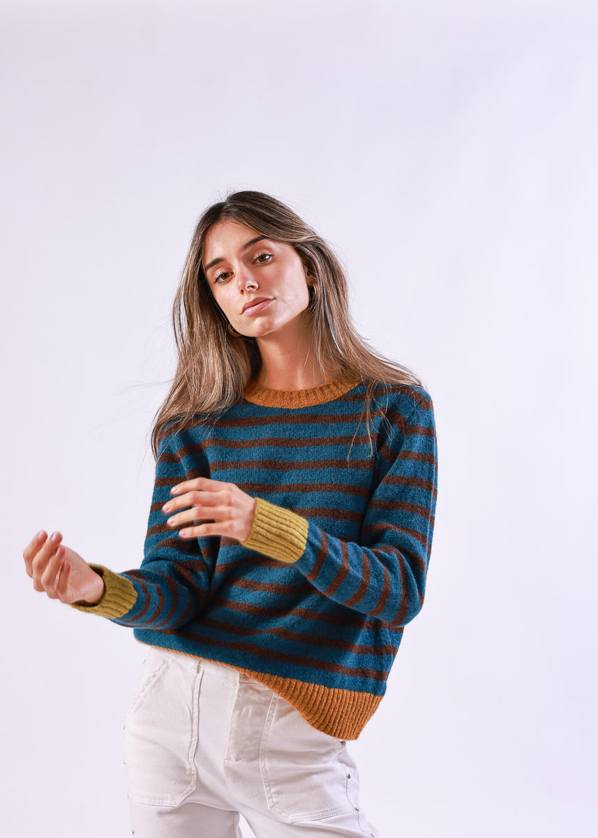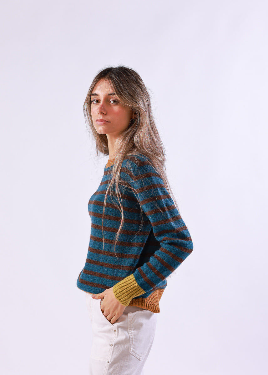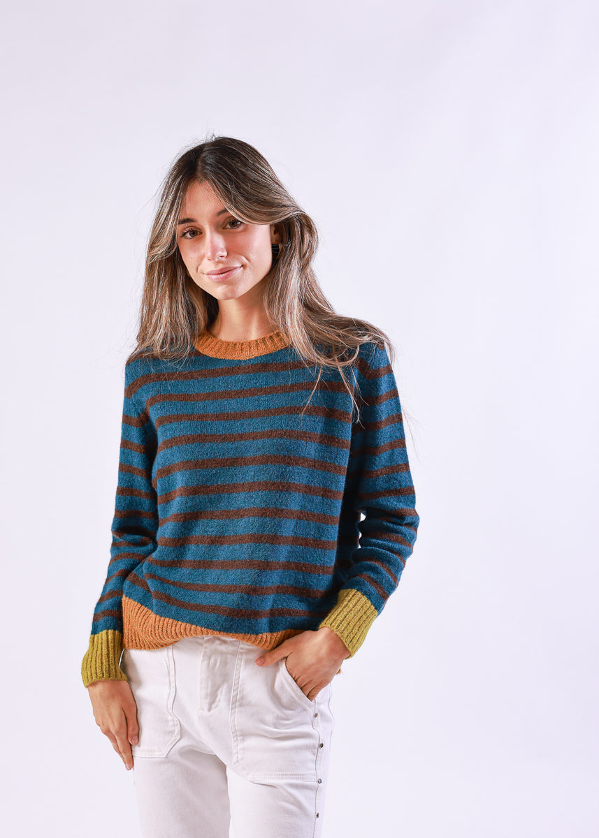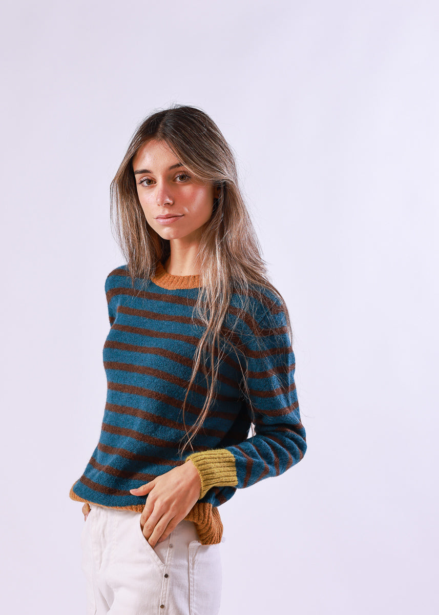 Jersey de punto suave con estampado de rayas en azul y marrón. Cuello redondo y puños en contraste color mostaza.