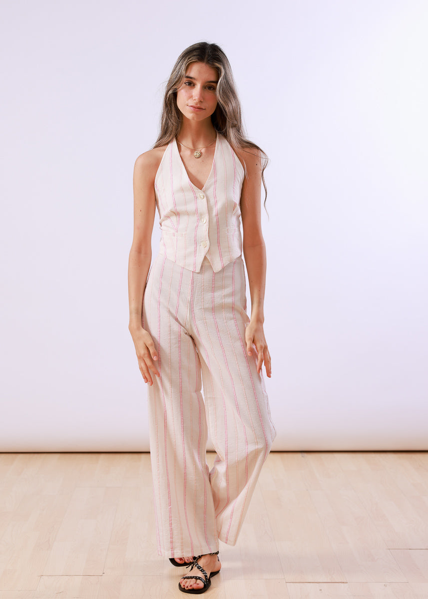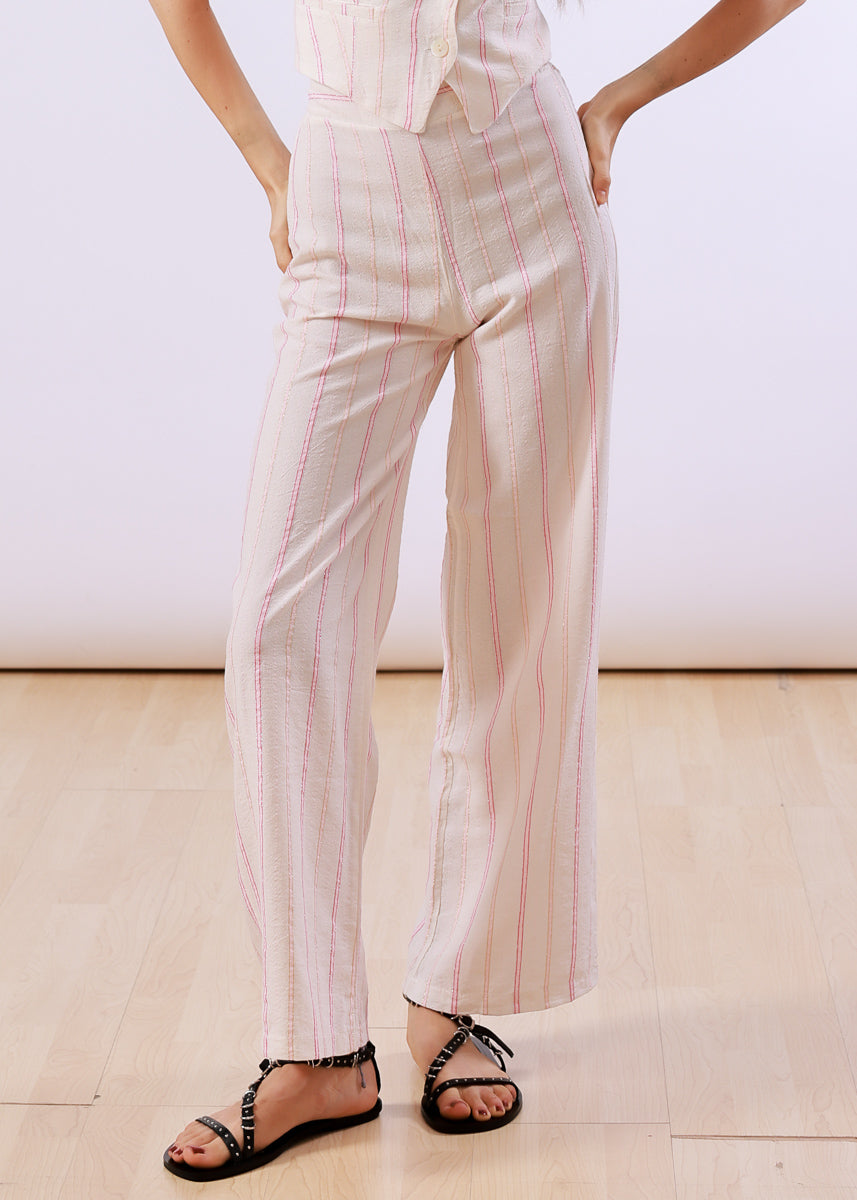 Long, loose-fitting trousers with a pink, shiny striped print and elastic at the back of the waist.