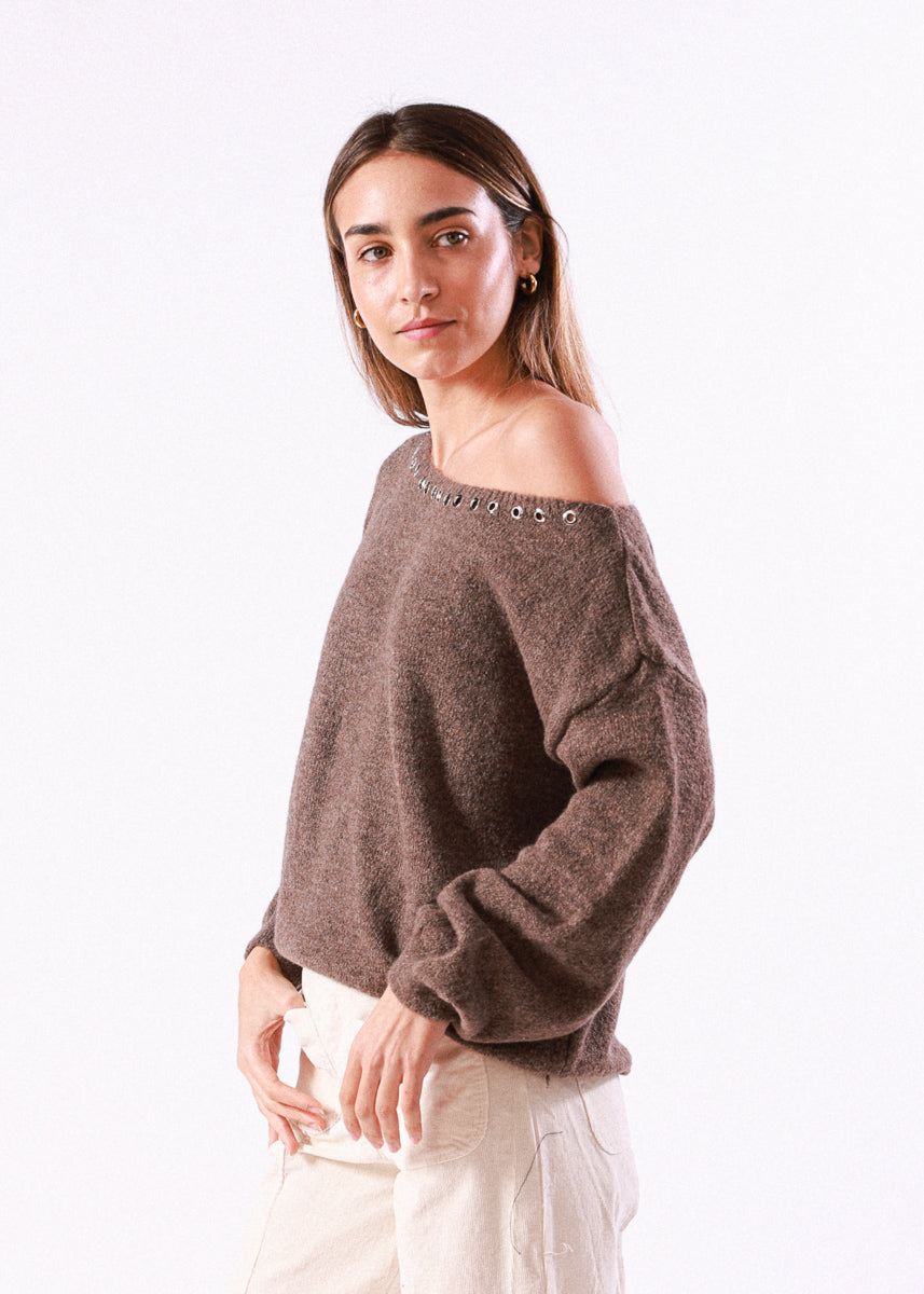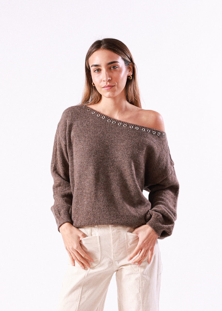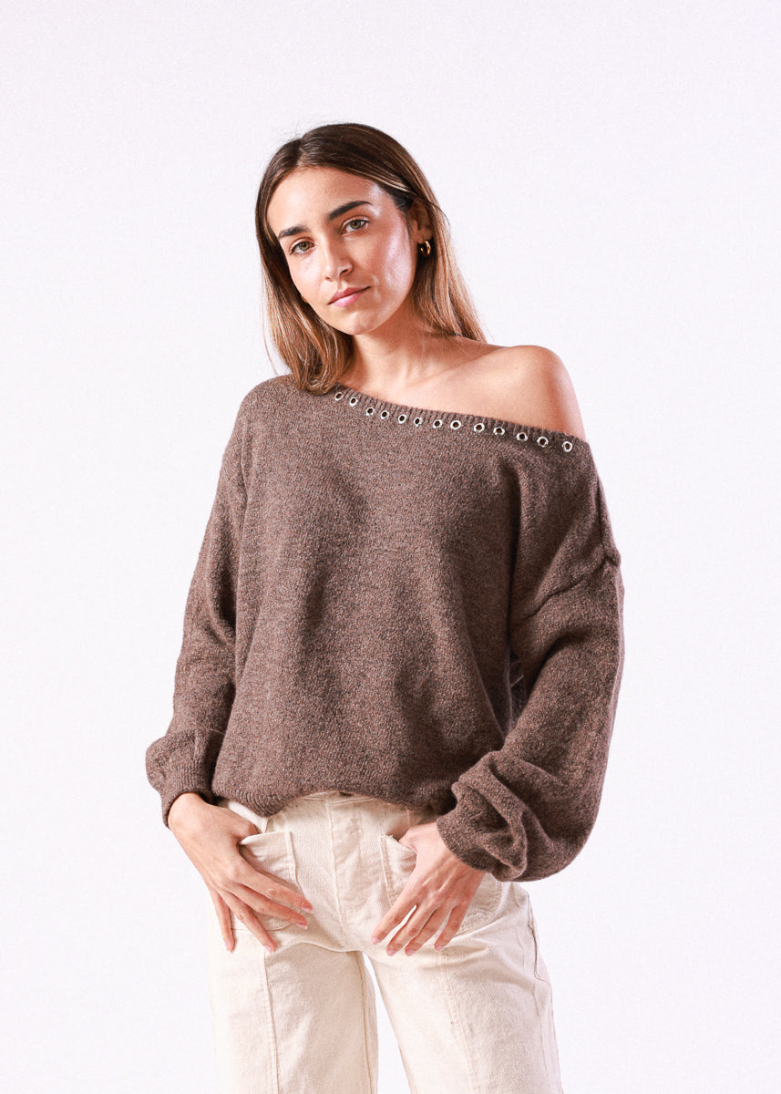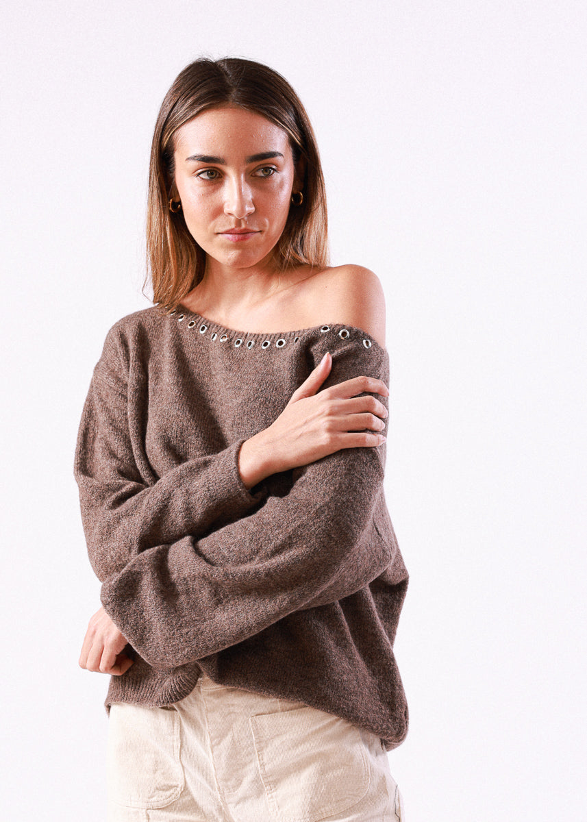 Jersey gris asimétrico en marrón con tachuelas redondas en el escote.