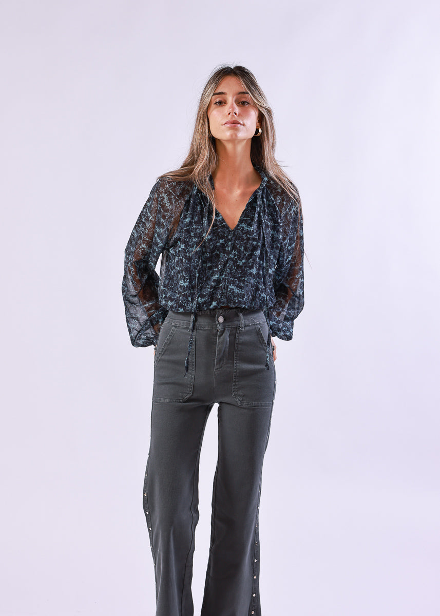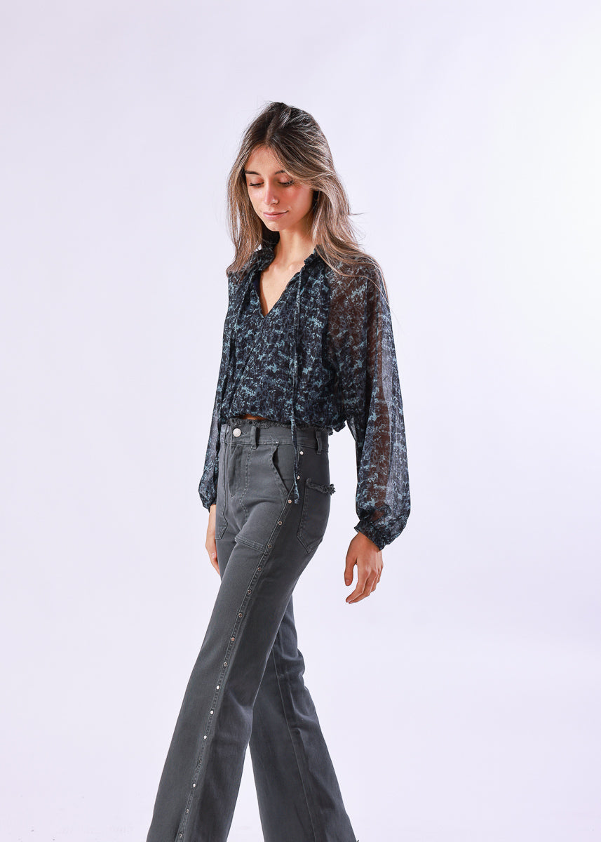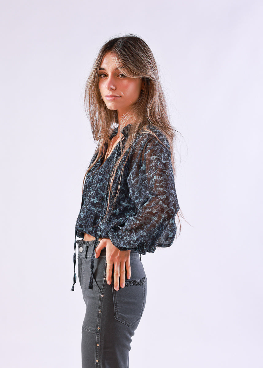 Blusa ligera de gasa semitransparente con estampado abstracto en tonos azules. Escote en pico con lazos ajustables y mangas largas abullonadas.