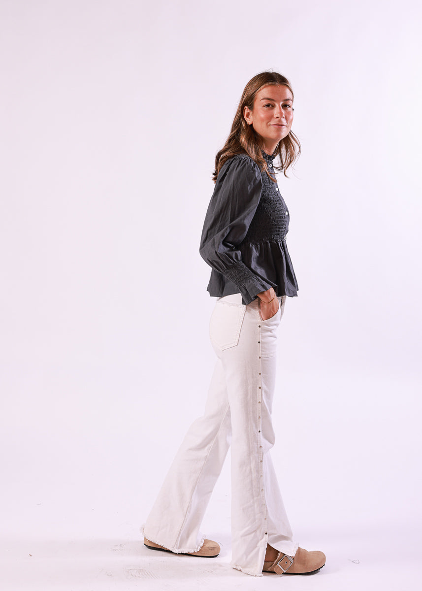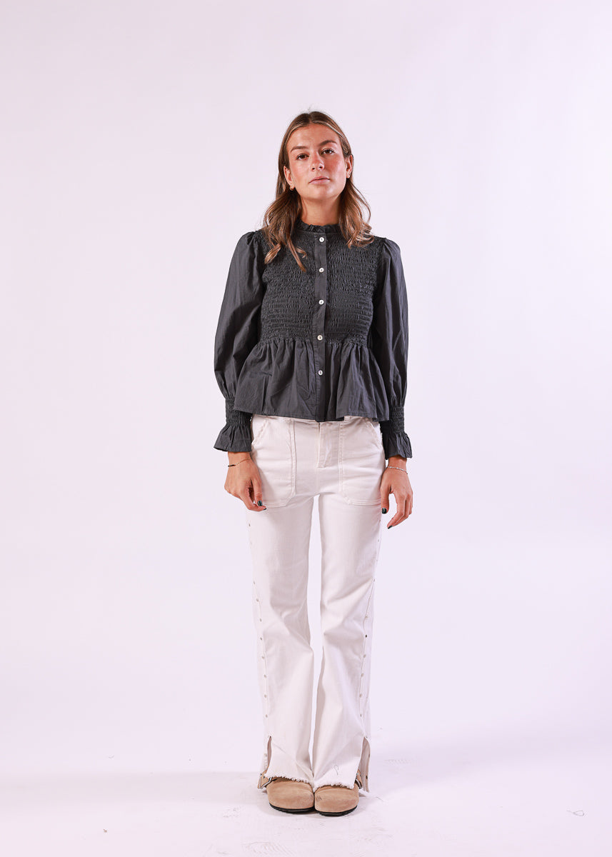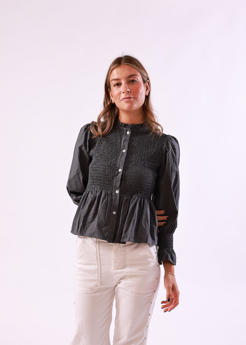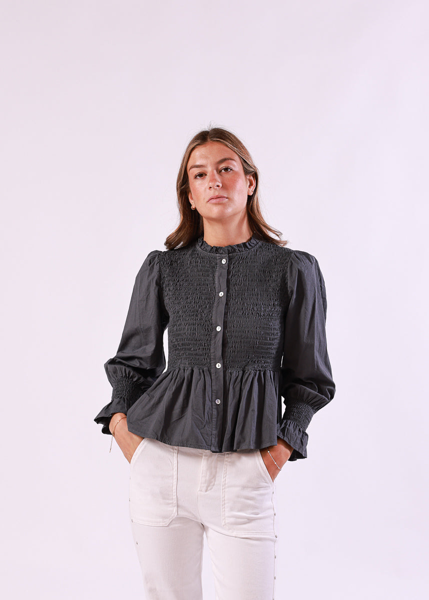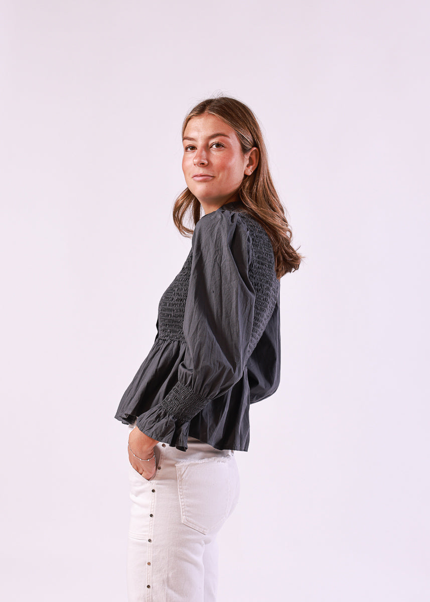 Blusa gris con frunce frontal estilo nido de abeja, de cuello redondo con pequeño volante y cierre delantero con botones. Tiene mangas largas abullonadas con puños fruncidos.