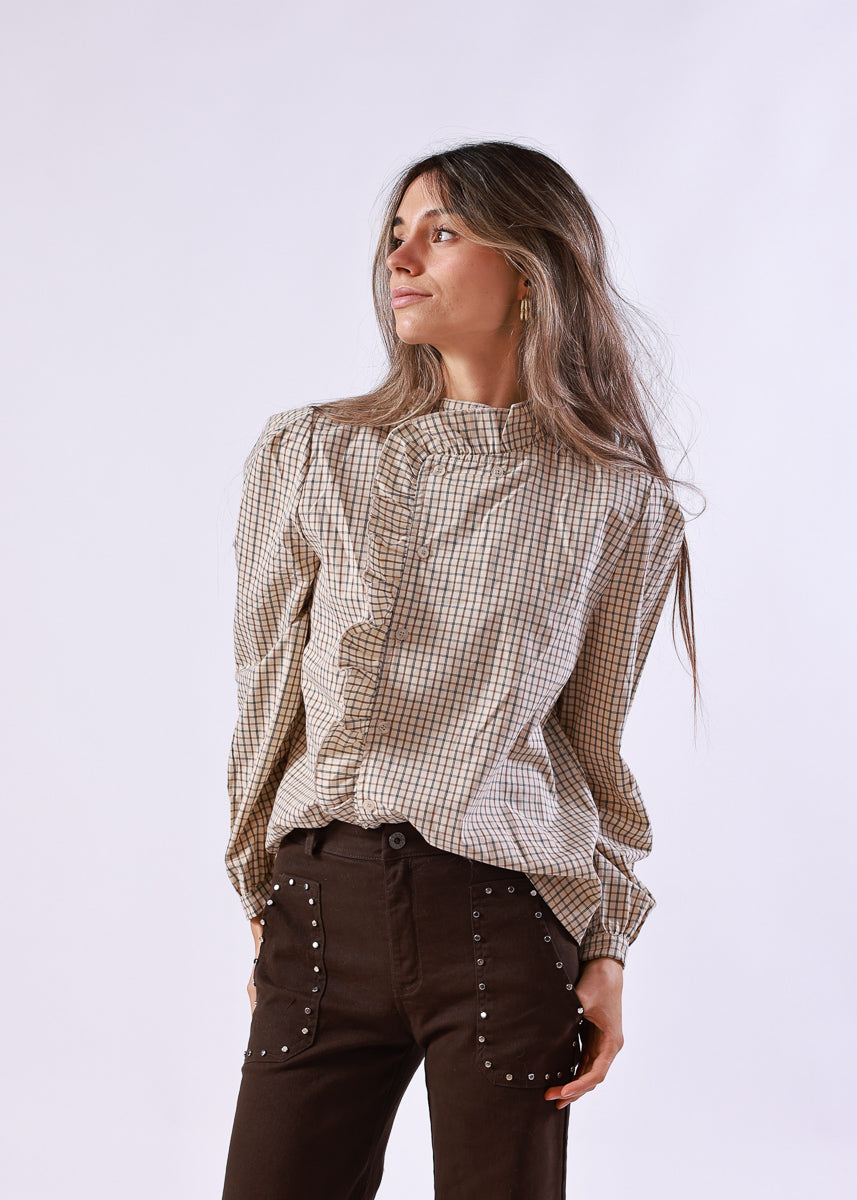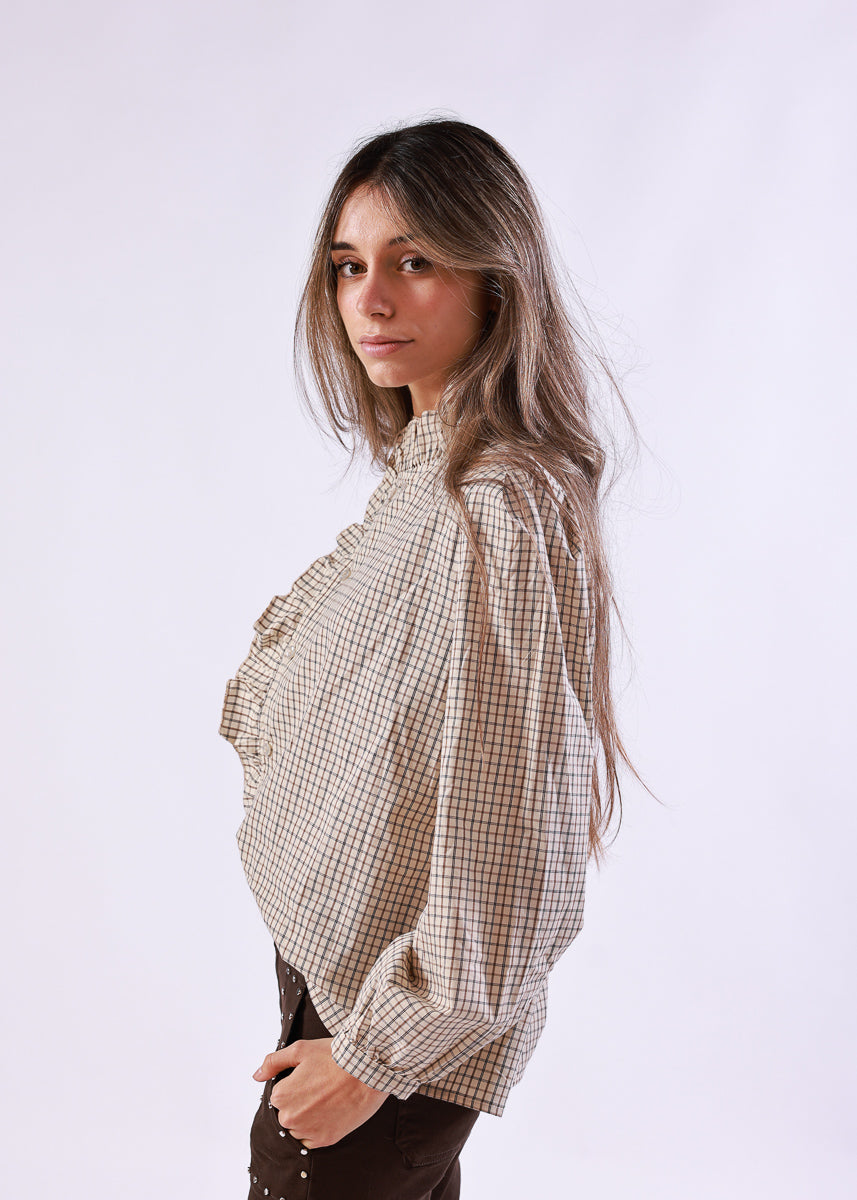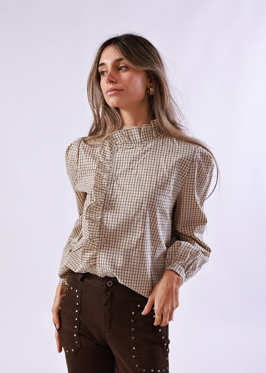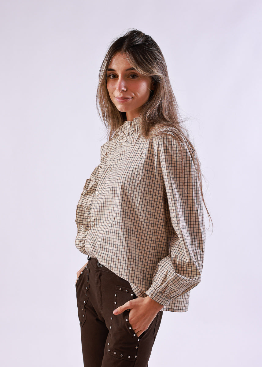 Camisa de manga larga con estampado de cuadros en tonos beige. Cuello alto con volantes y cierre frontal con botones.
