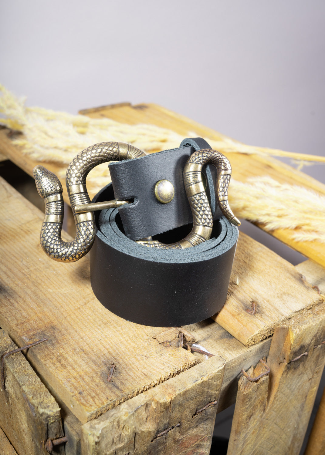 Leather belt with a snake figure.