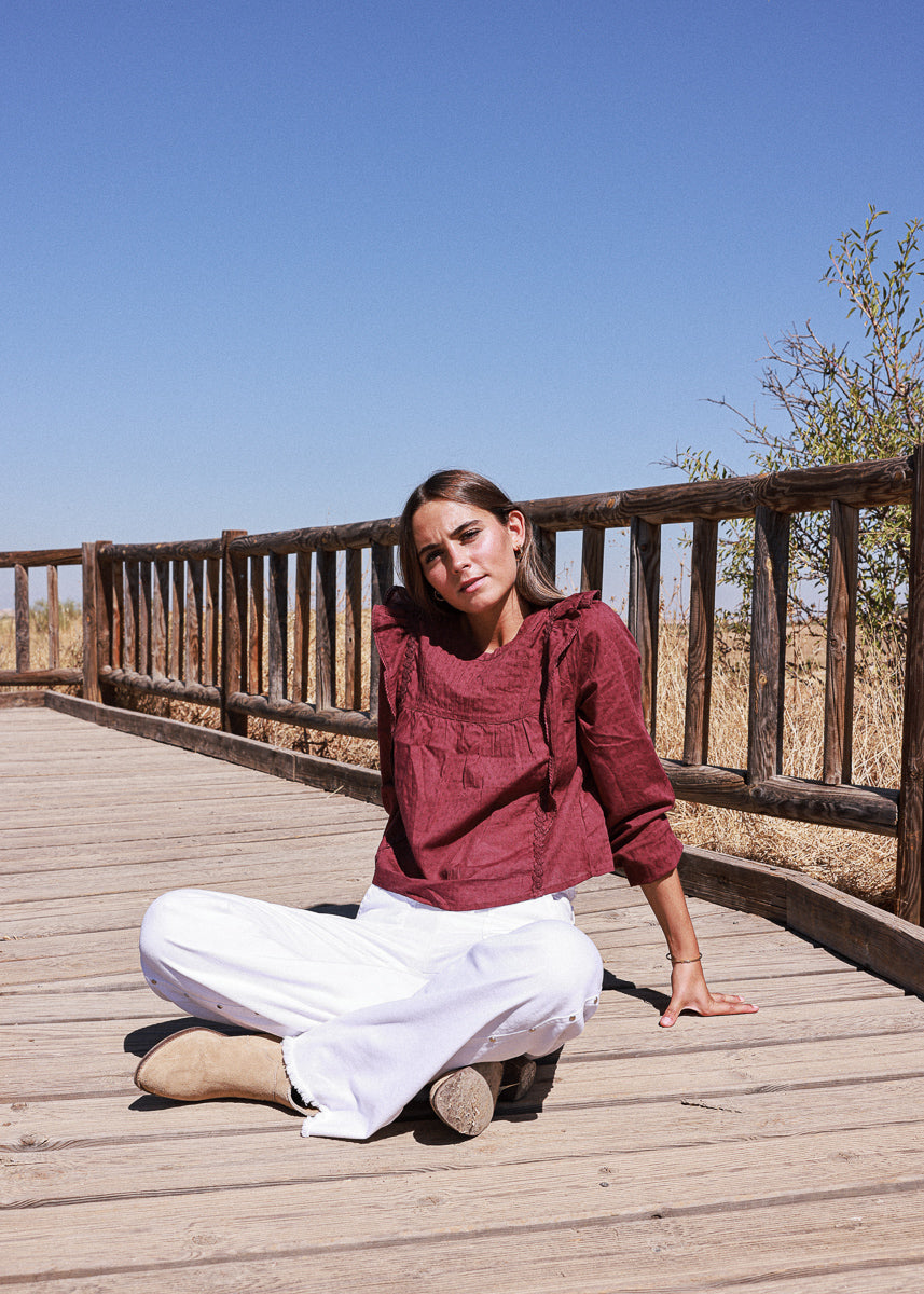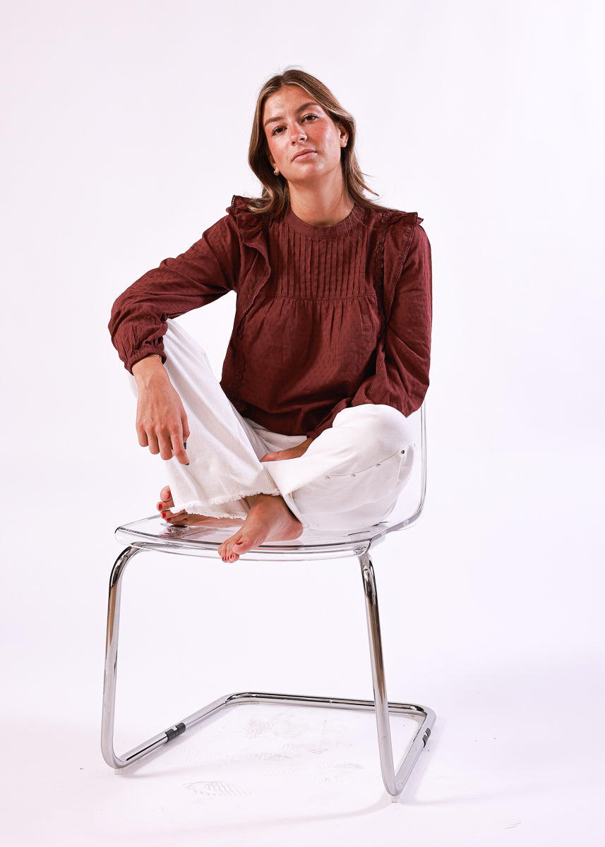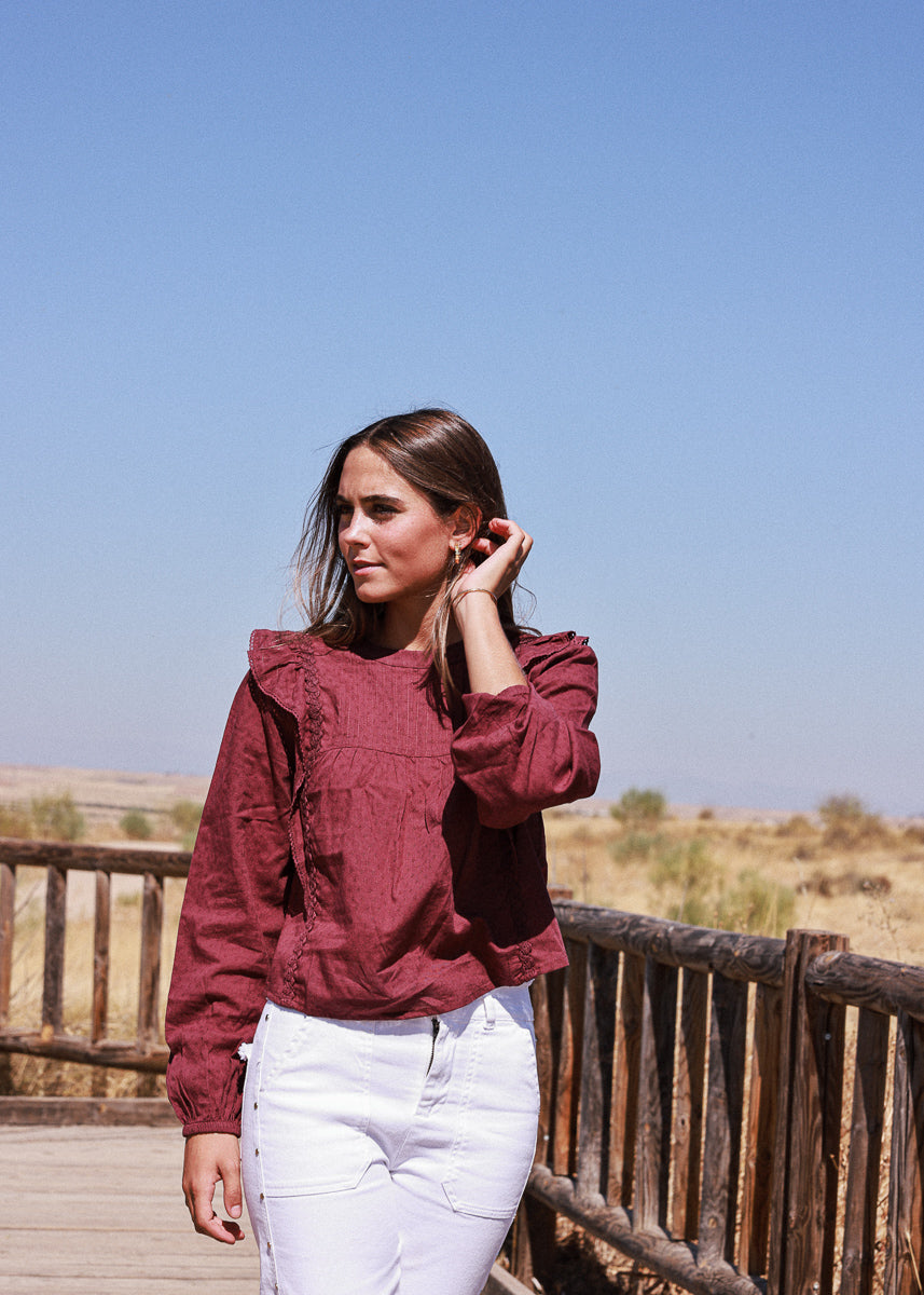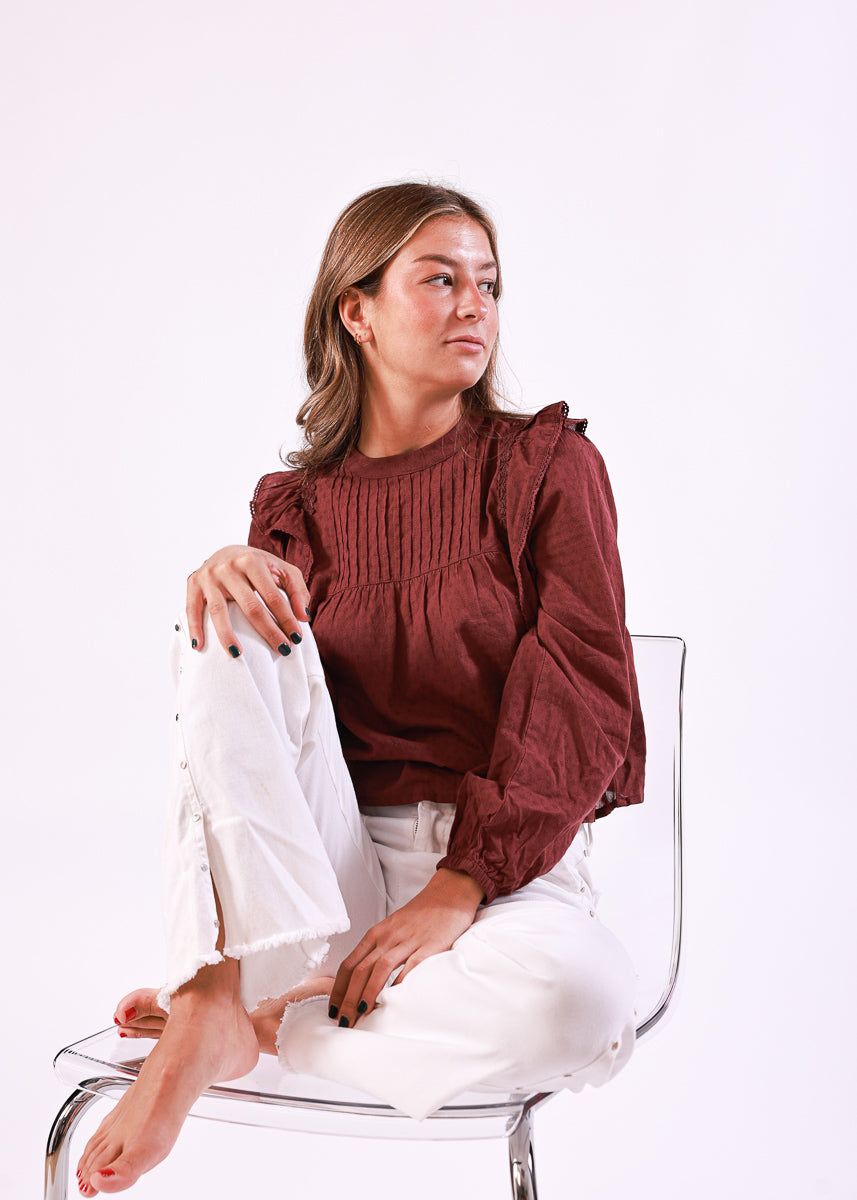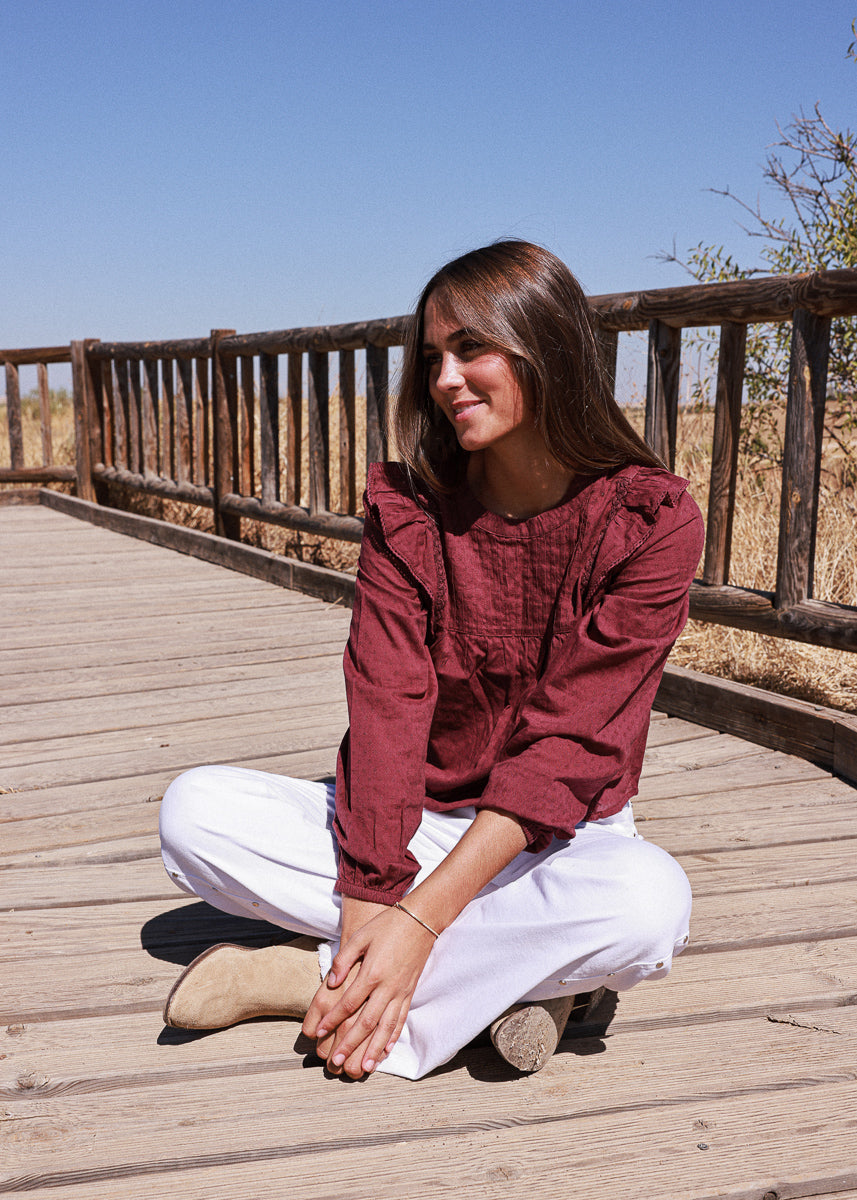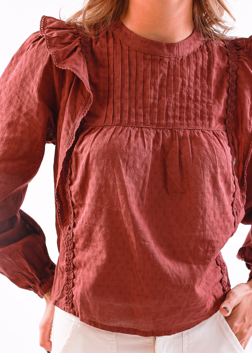 Blusa en color rosado de manga larga con texturas, volantes en los hombros, cuello redondo cerrado y puños fruncidos.