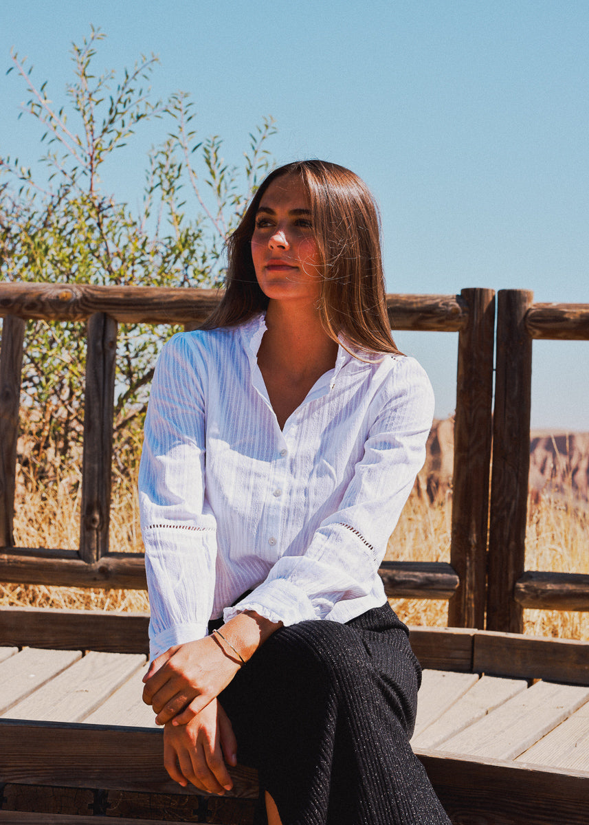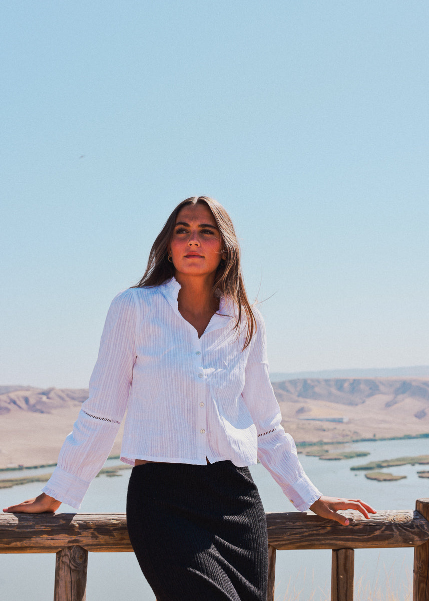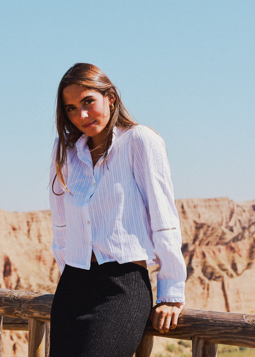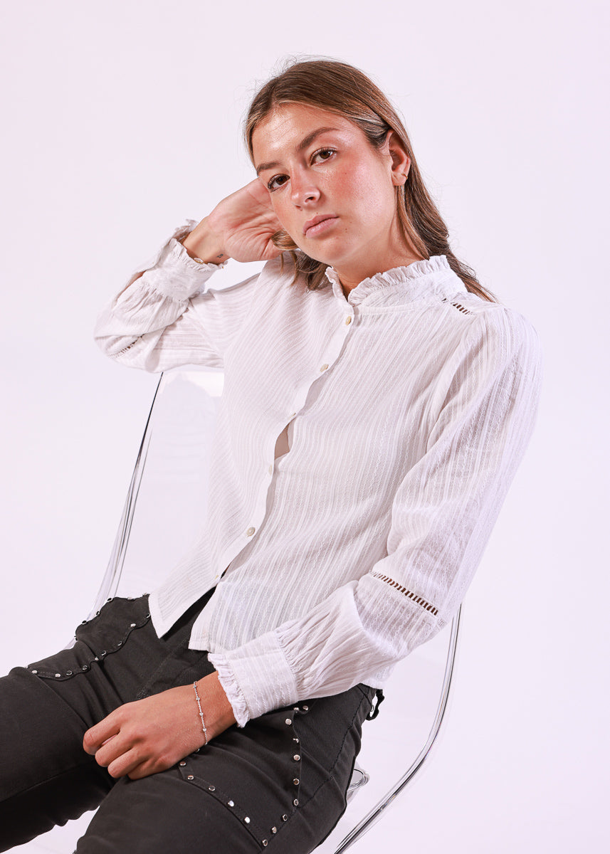 Blusa en color blanco de manga larga y estampado de textura de rayas, con botones frontales, de acabado recto y cuello con mini volantes.