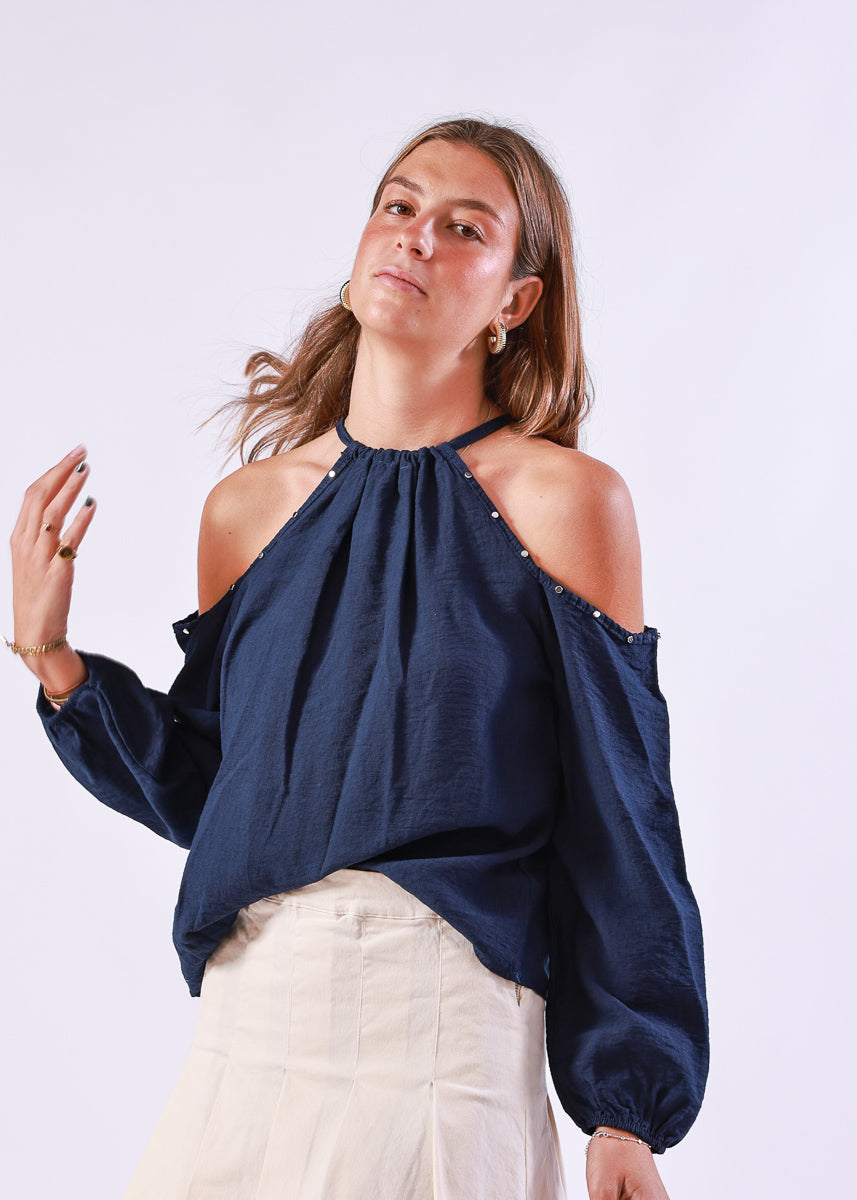 Blusa color azul de manga larga con escote halter y hombros descubiertos, decorados con tachuelas en los bordes.