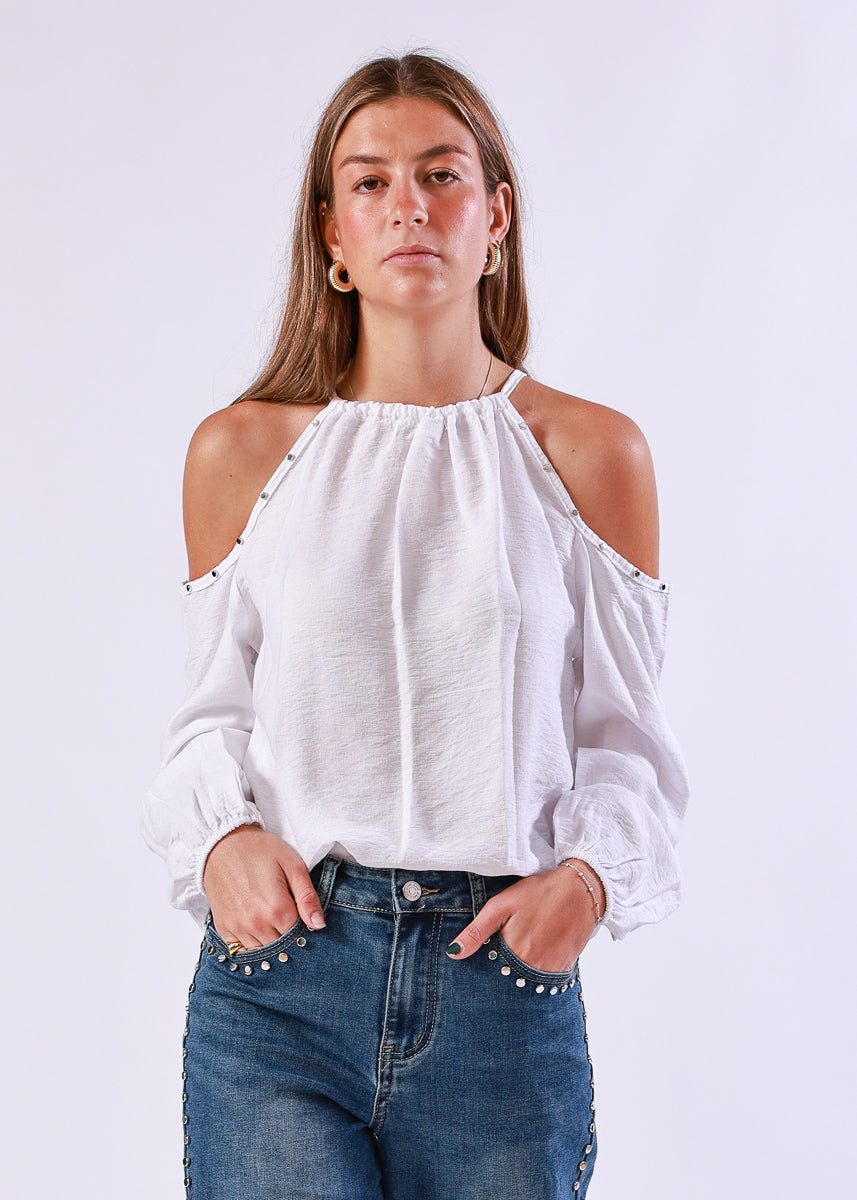 Blusa color blanco de manga larga con escote halter y hombros descubiertos, decorados con tachuelas en los bordes.