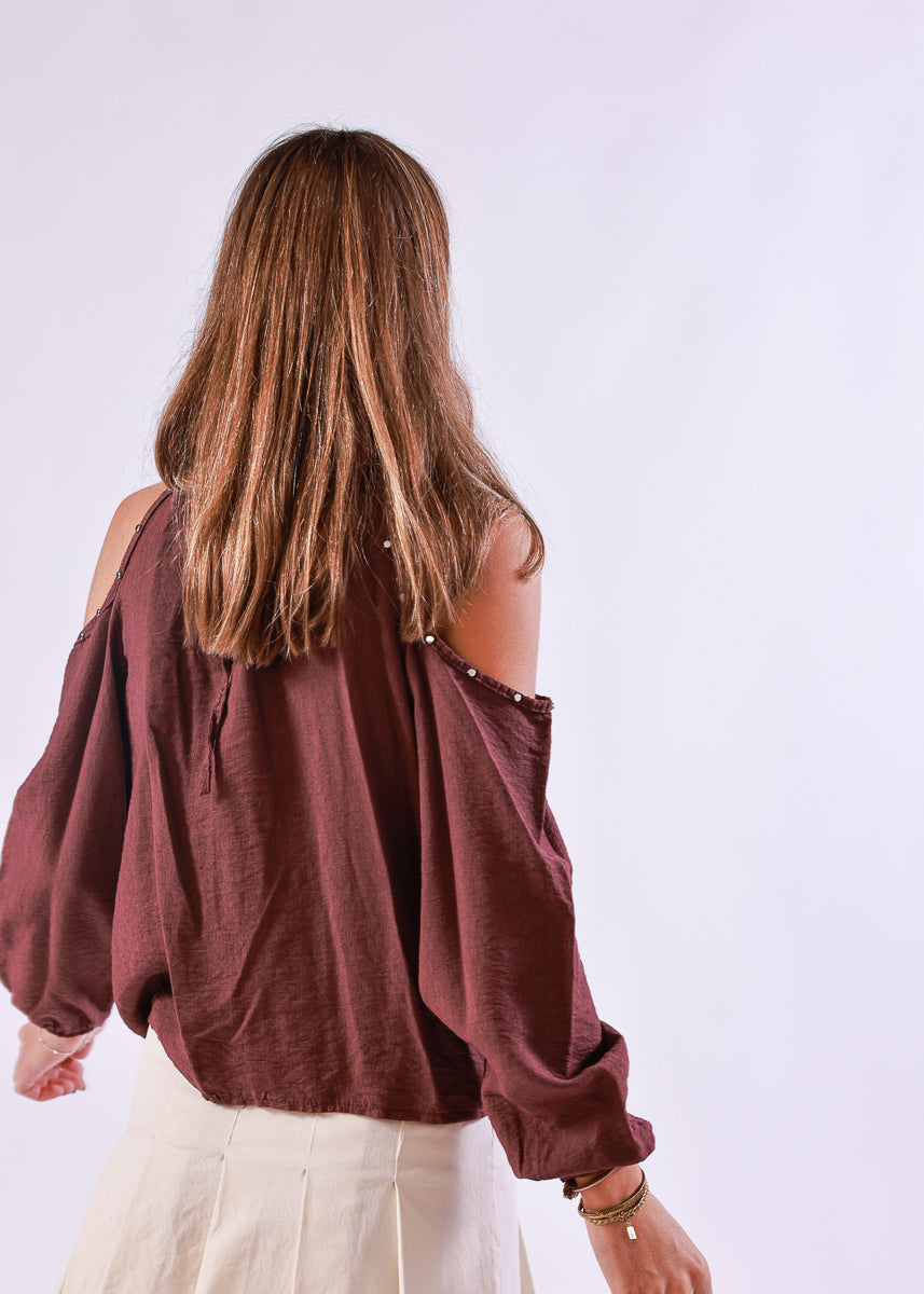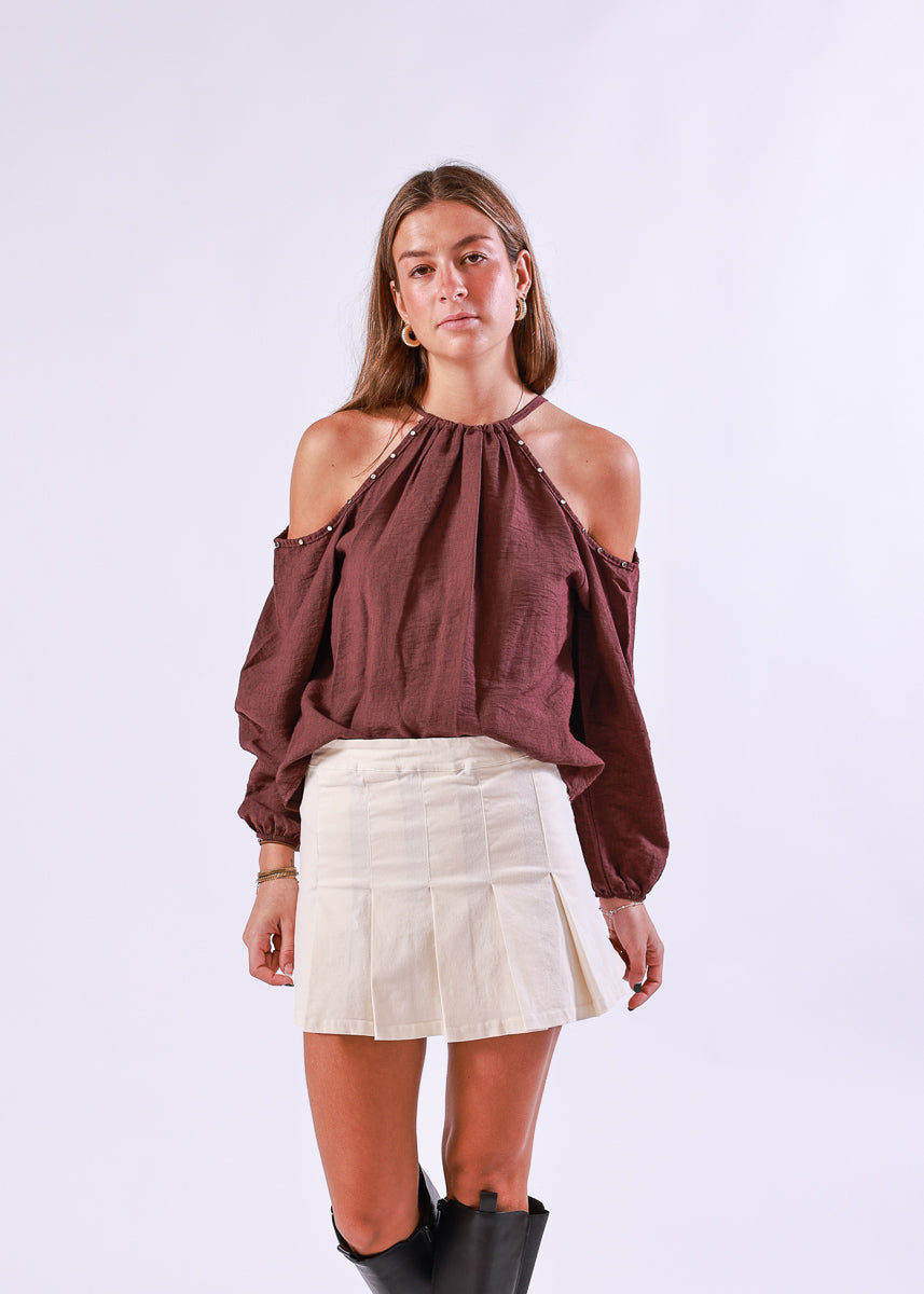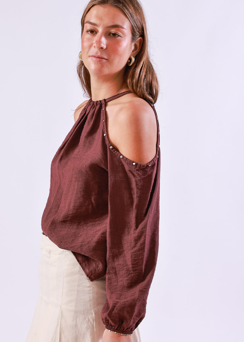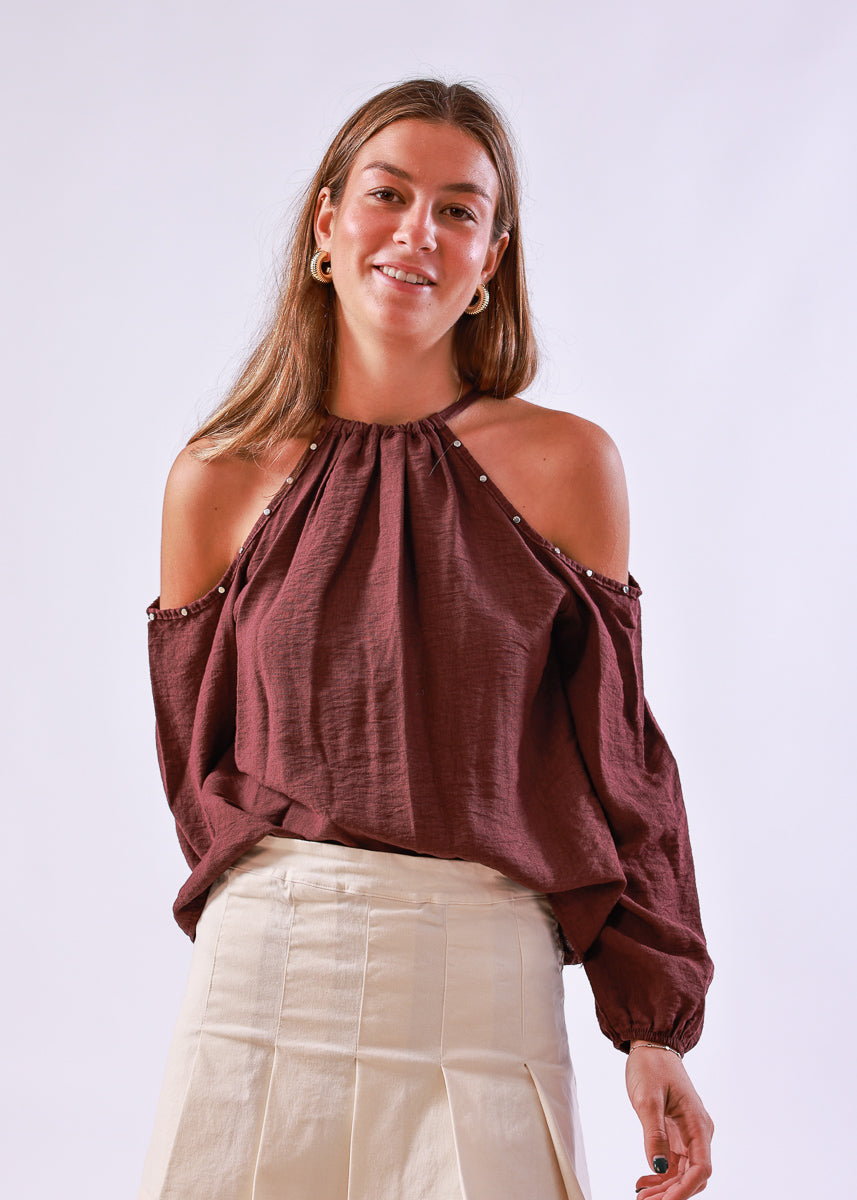 Blusa color rosado oscuro de manga larga con escote halter y hombros descubiertos, decorados con tachuelas en los bordes.