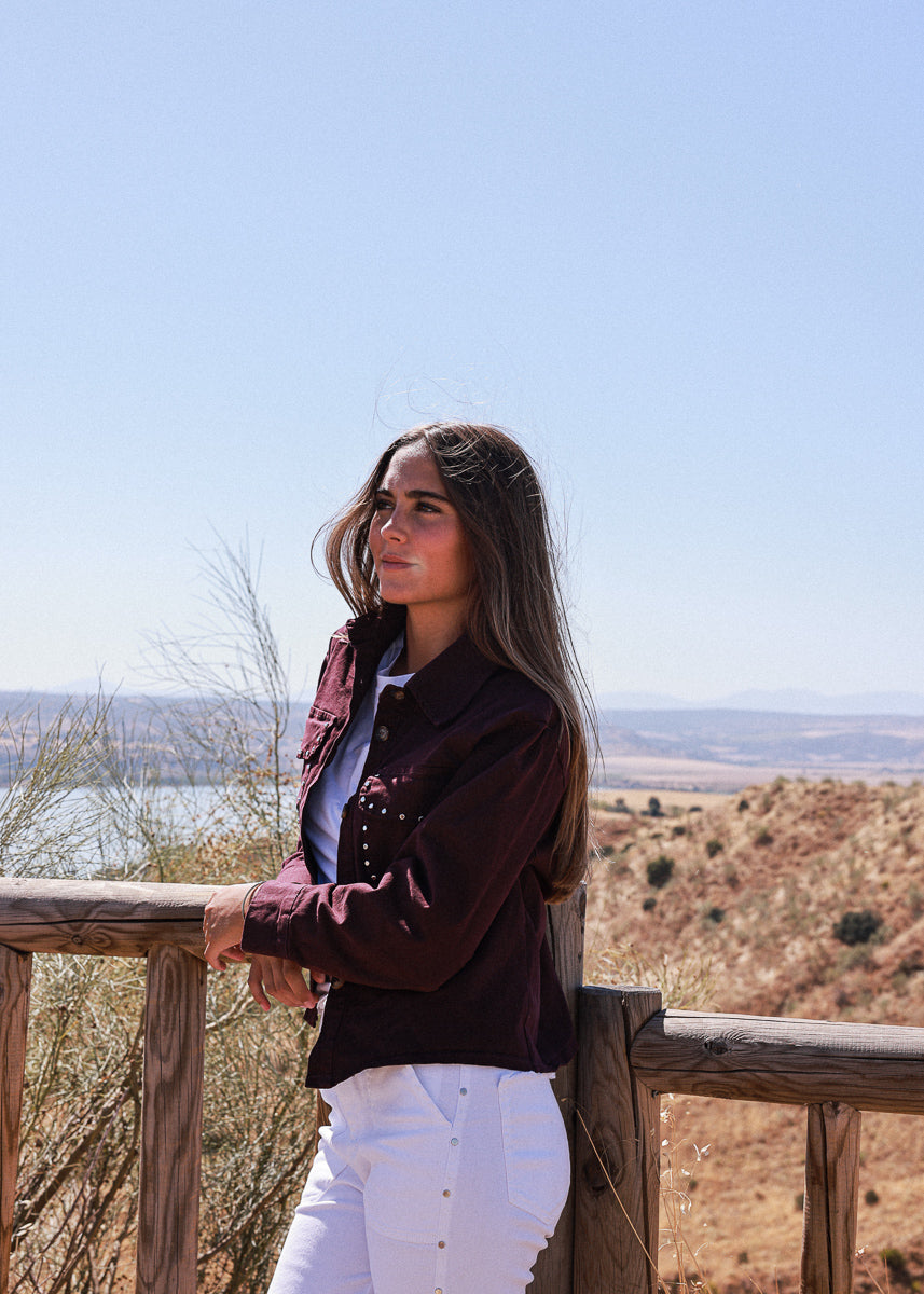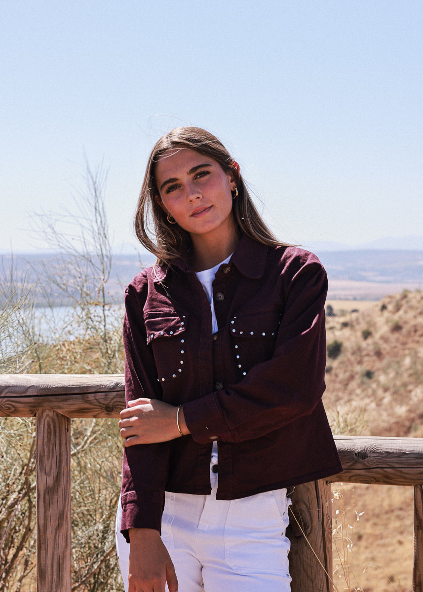 Chaqueta en color burdeos con cierre de botones y con dos bolsillos frontales decorados con tachuelas plateadas.