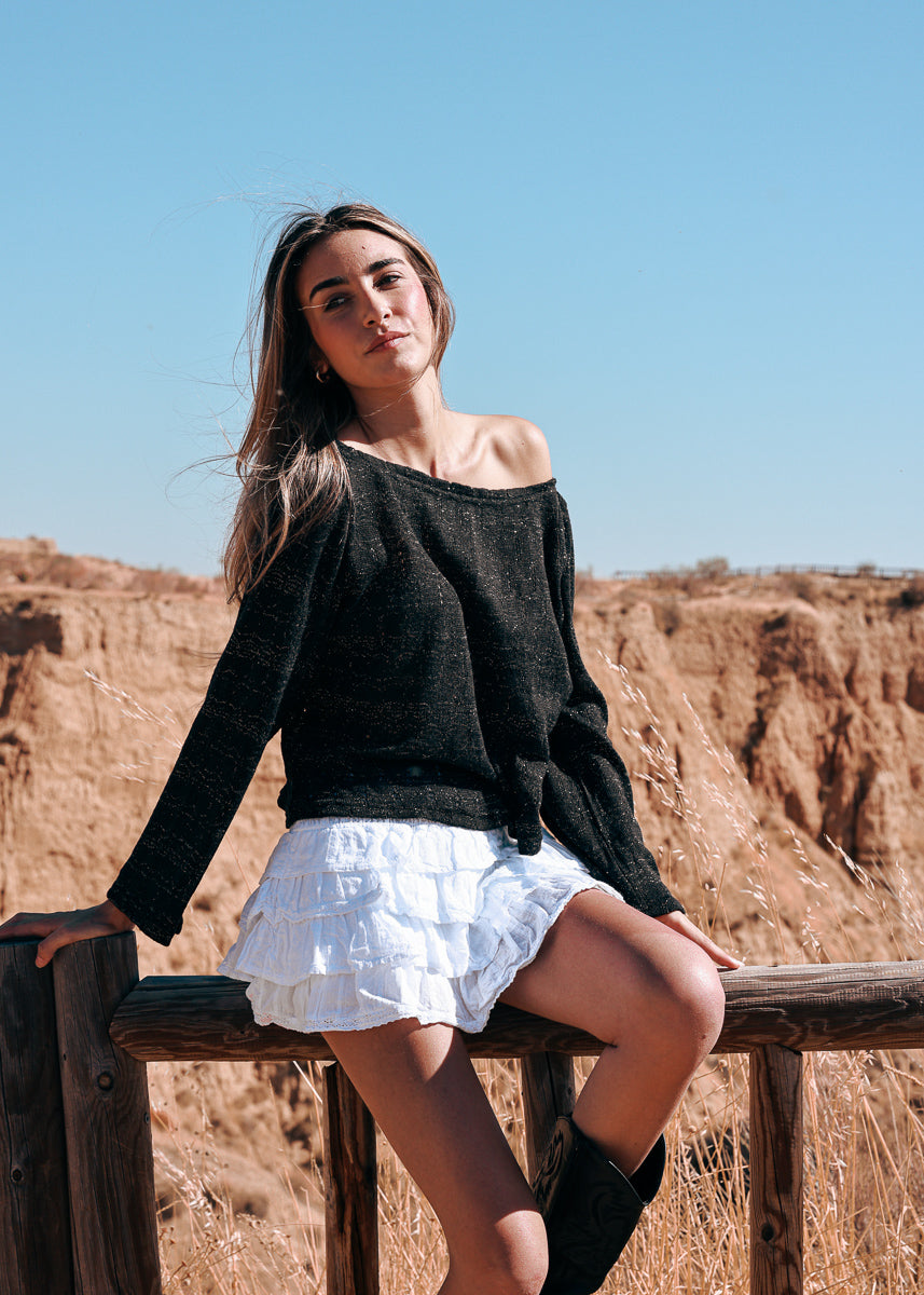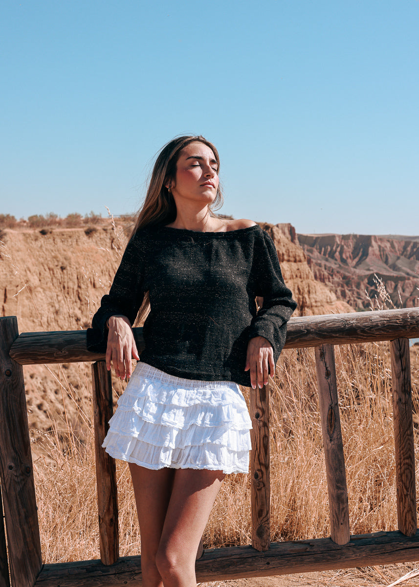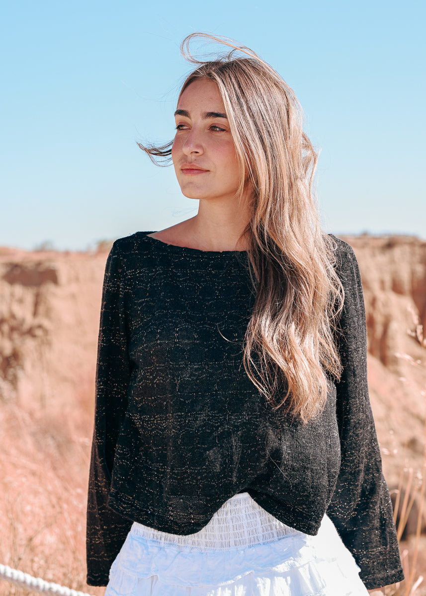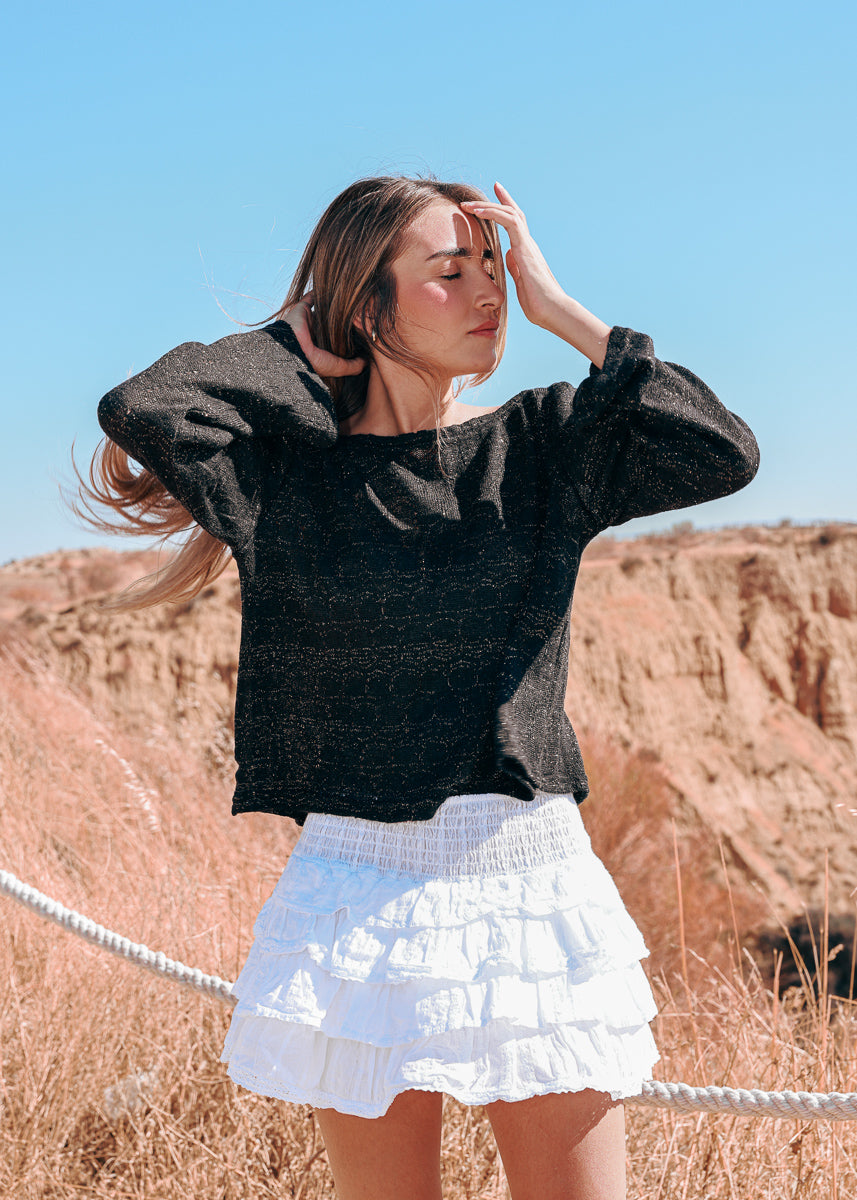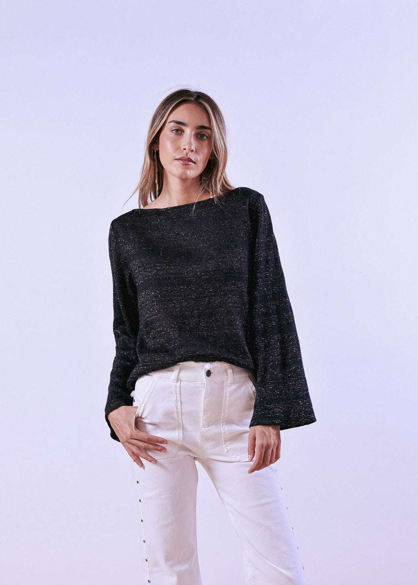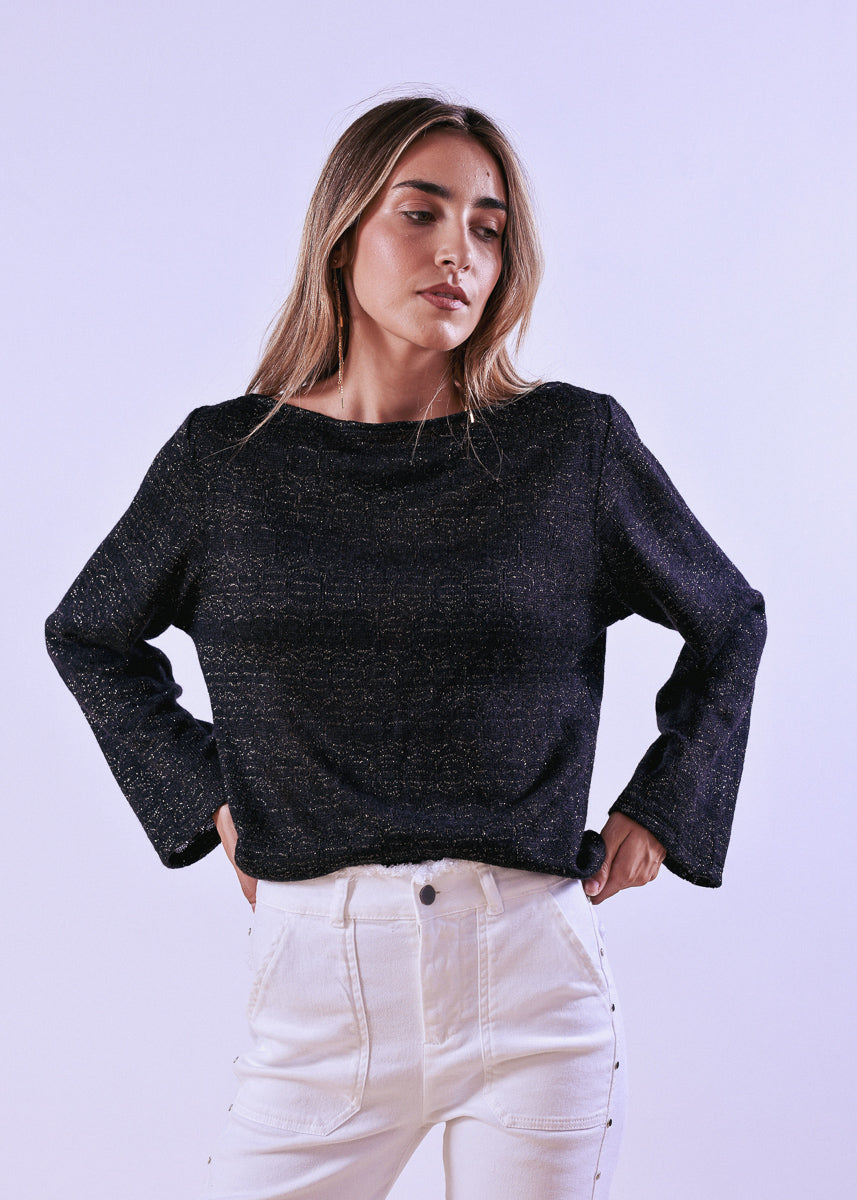 Jersey negro con brillos de cuello barco y mangas acampanadas.