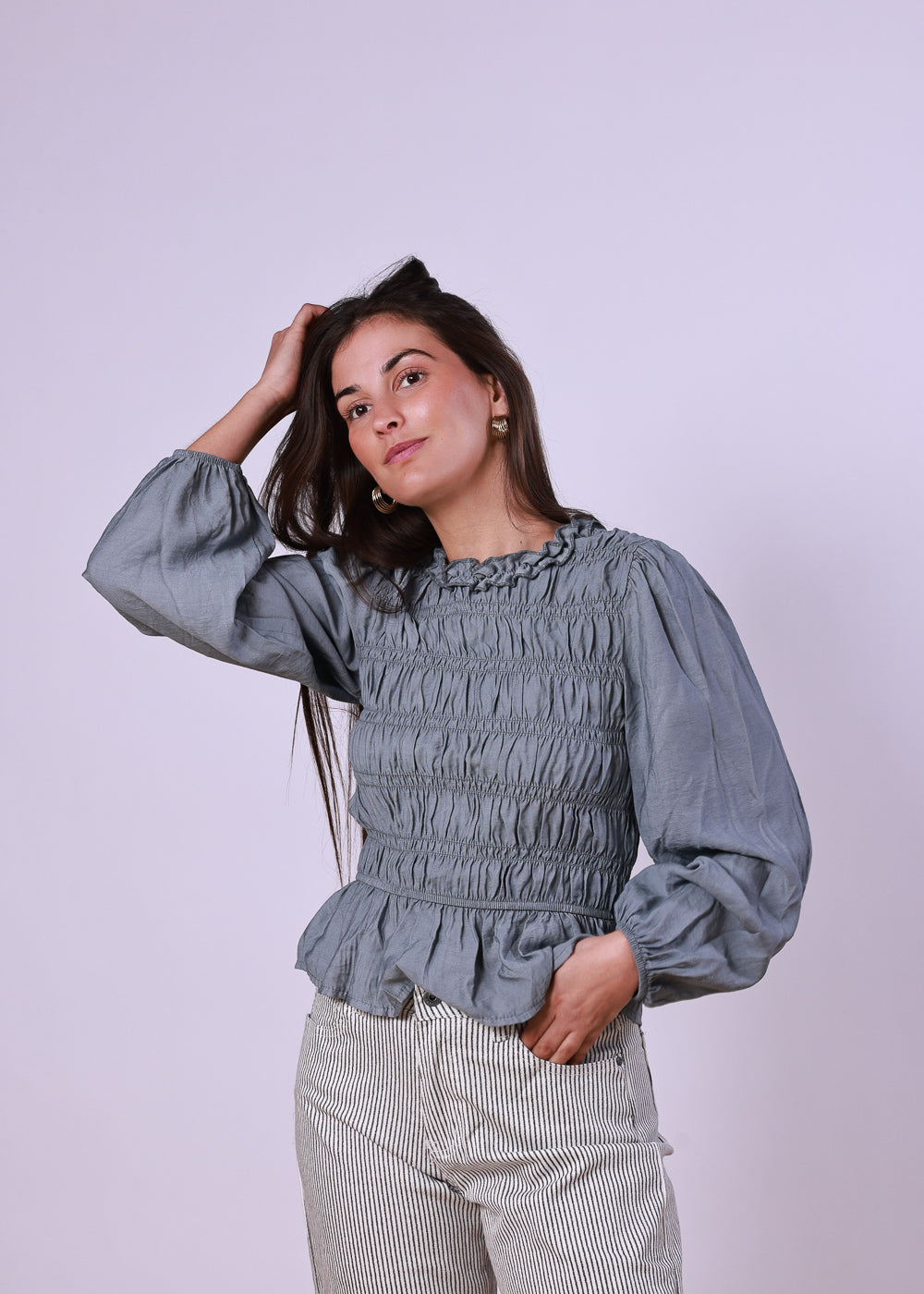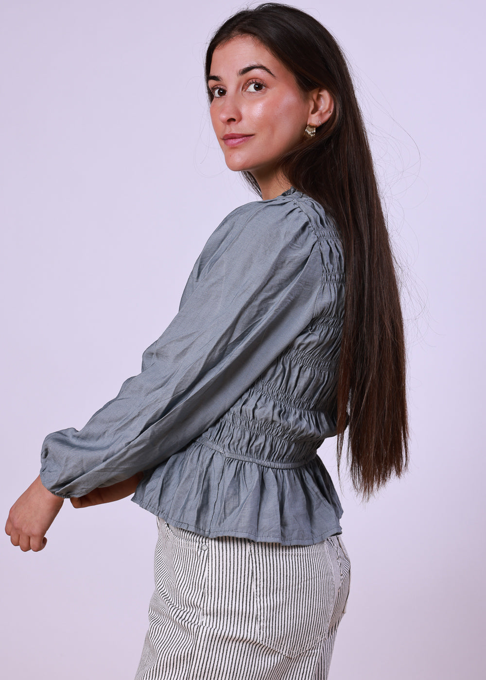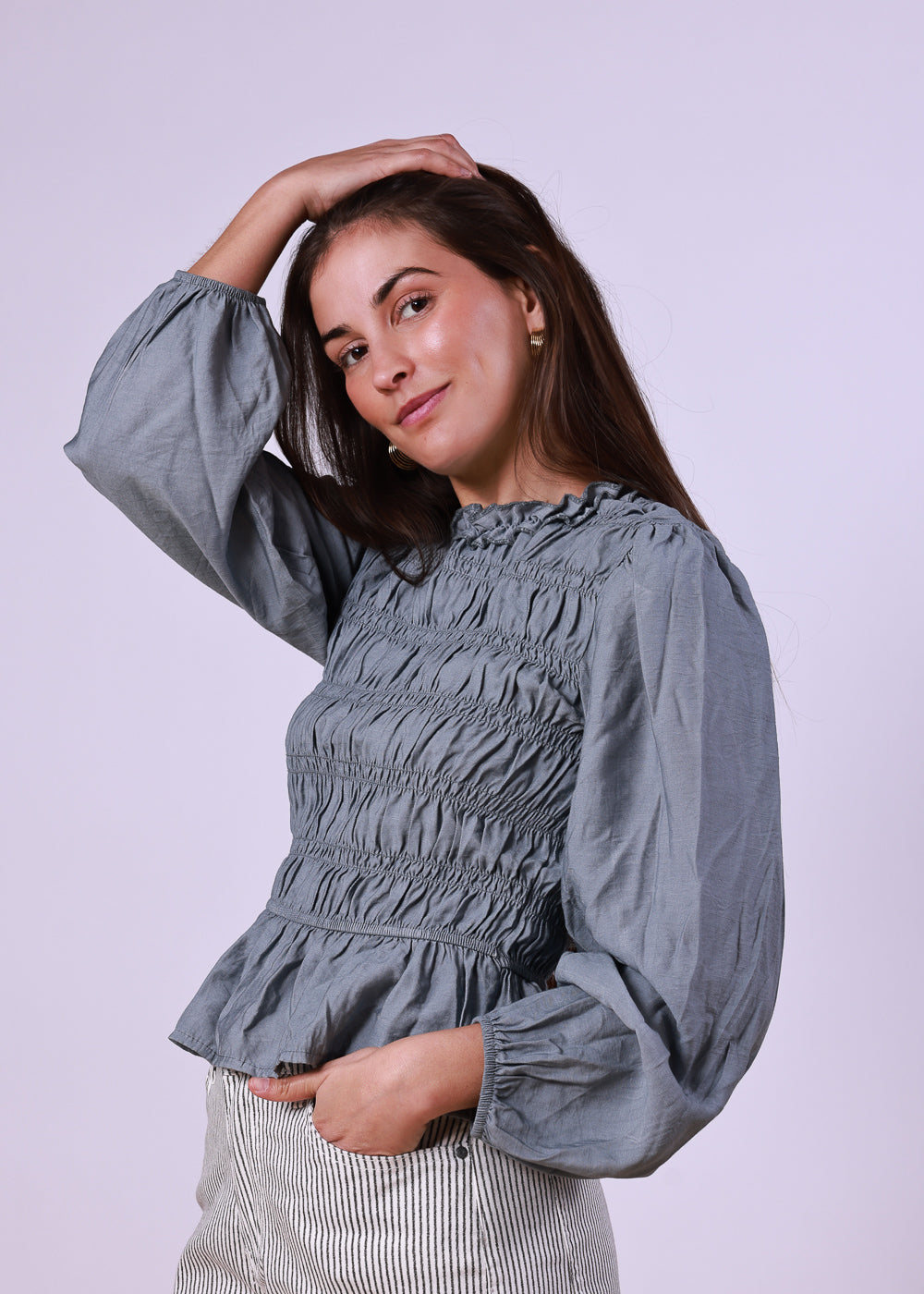 Grey gathered blouse with puffed sleeves and a closed round neck.