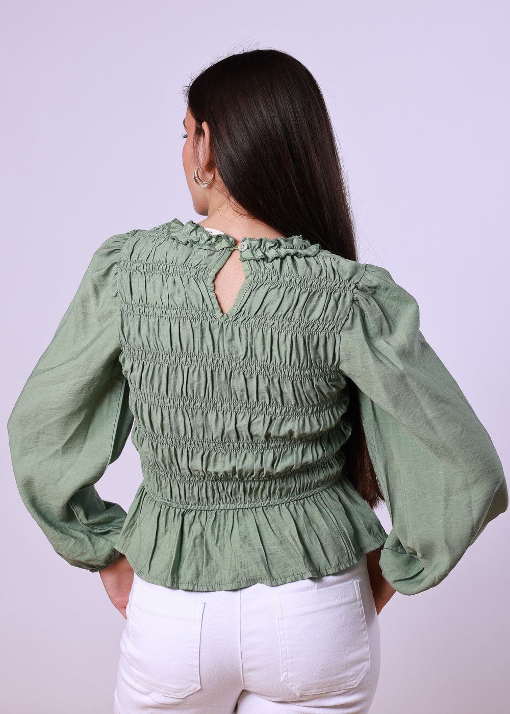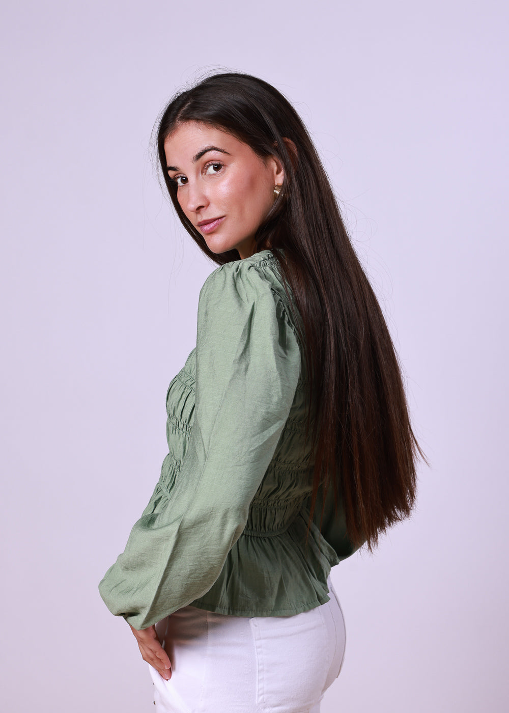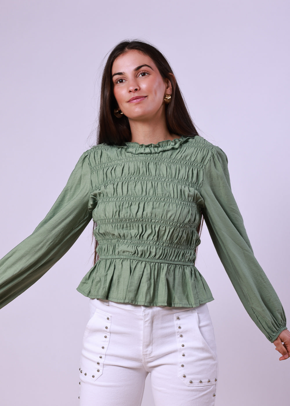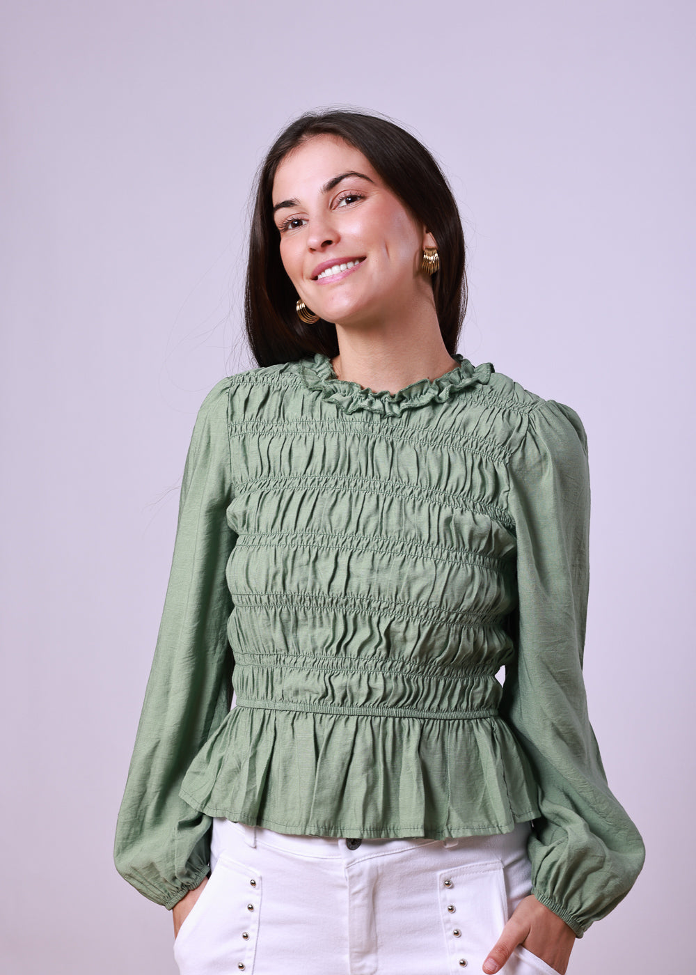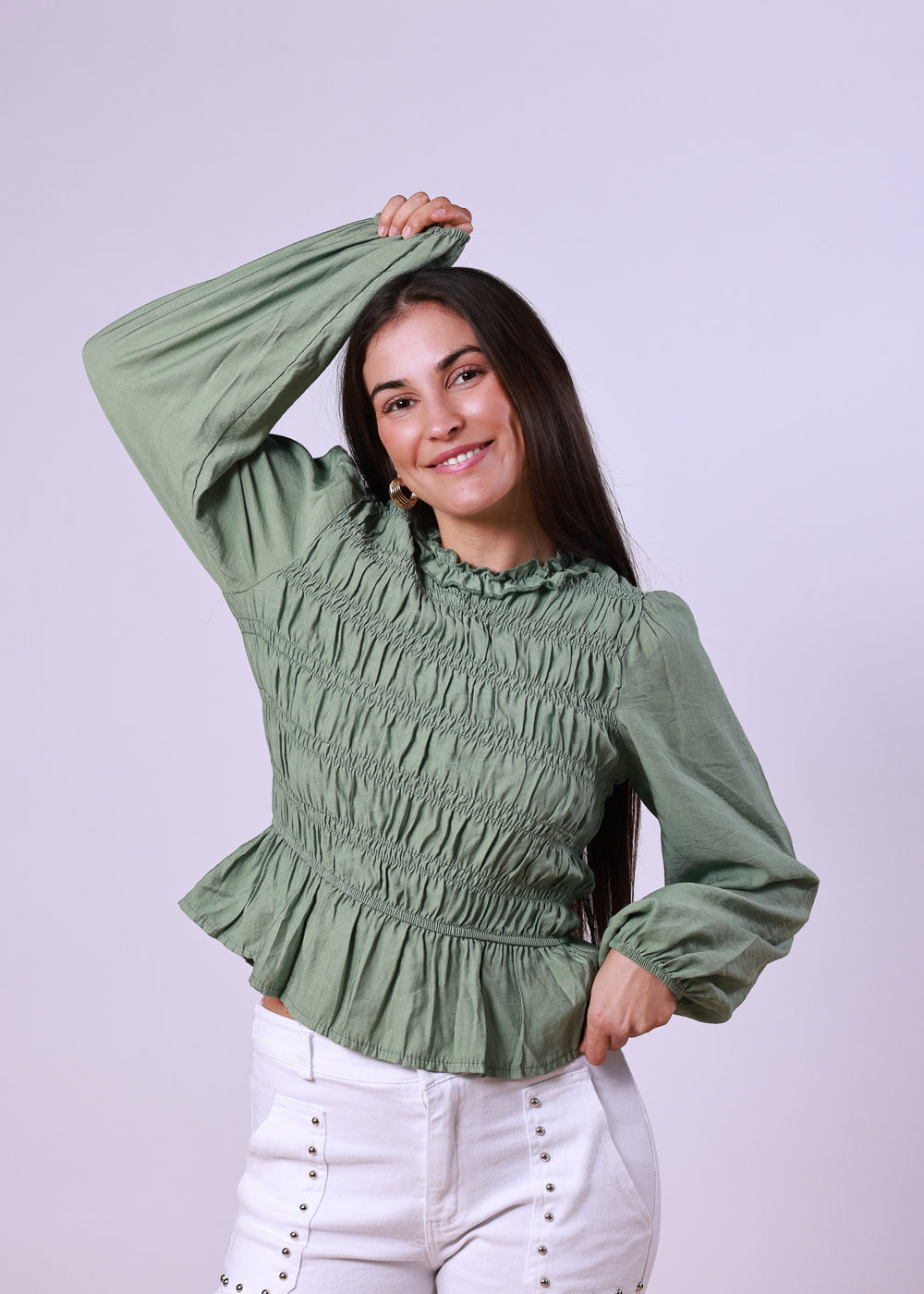 Green gathered blouse with puffed sleeves and a closed round neck.