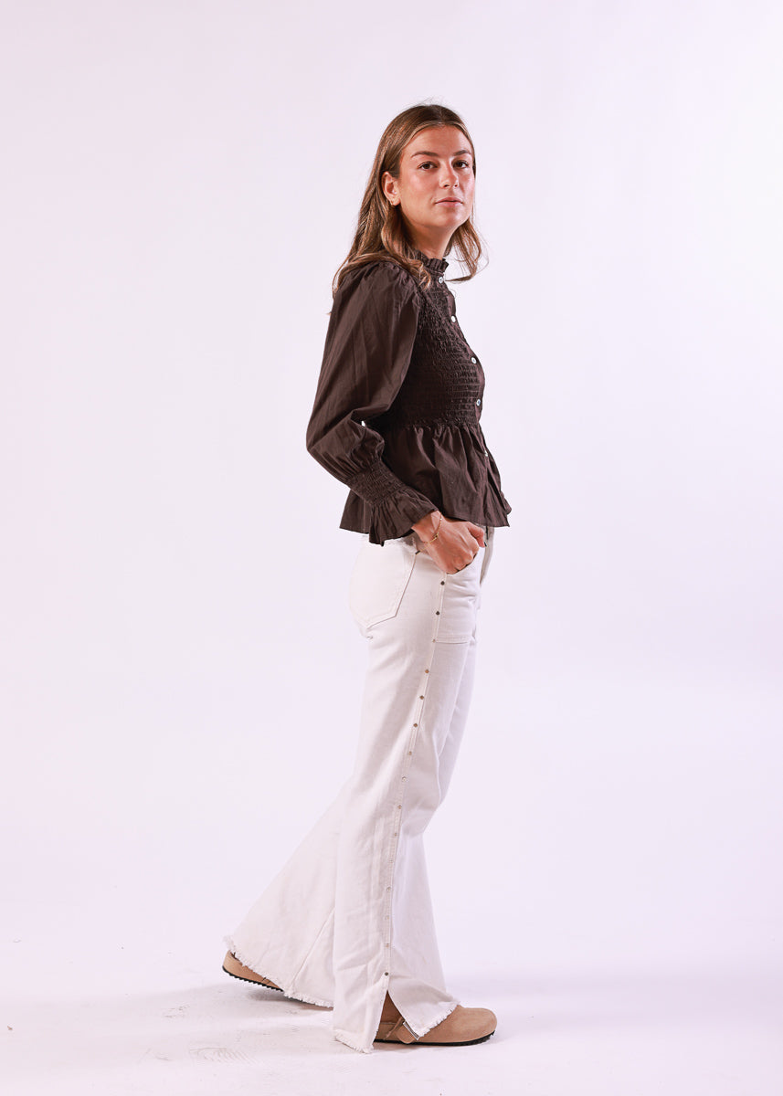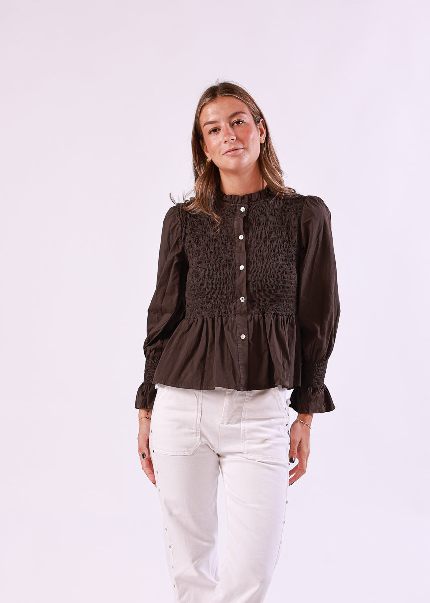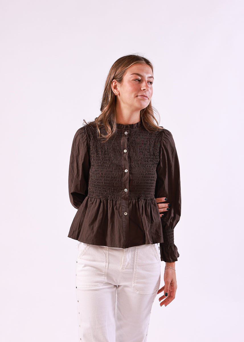 Blusa marrón chocolate con frunce frontal estilo nido de abeja, de cuello redondo con pequeño volante y cierre delantero con botones. Tiene mangas largas abullonadas con puños fruncidos.