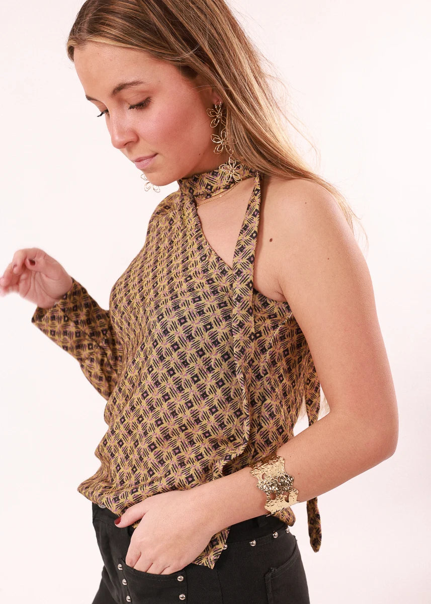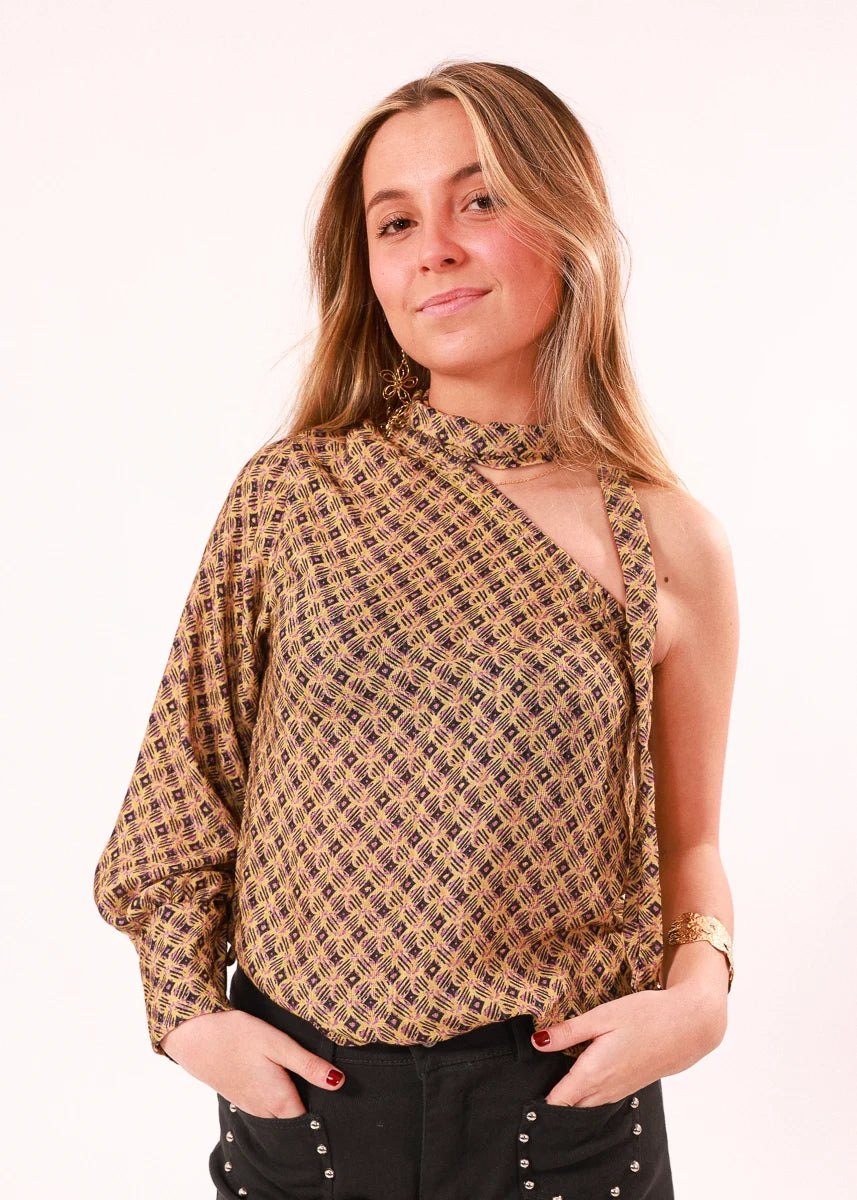 Asymmetrical printed blouse with long sleeves and a choker neckline. Neckband included.