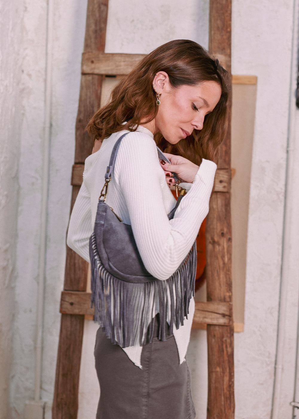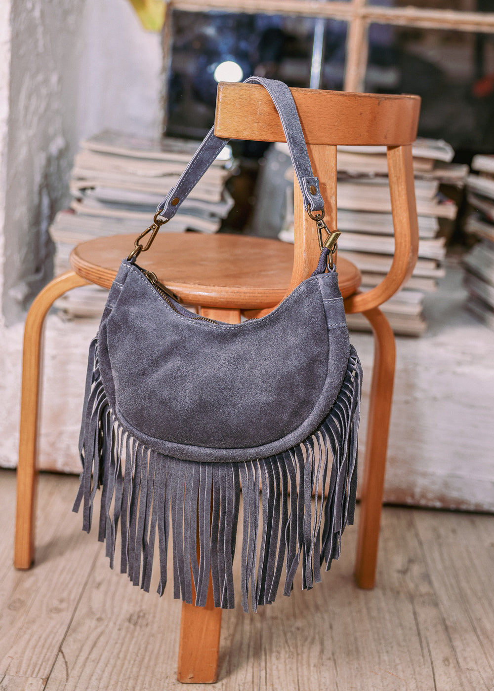 Gray suede bag with falling fringes, zipper closure, and short handle.