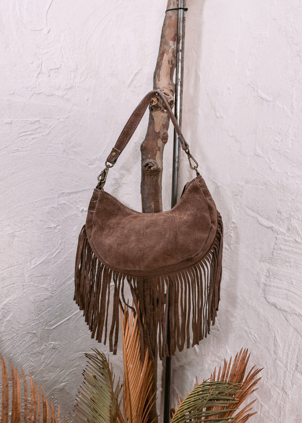 Brown suede bag with falling fringes, zipper closure, and short handle.