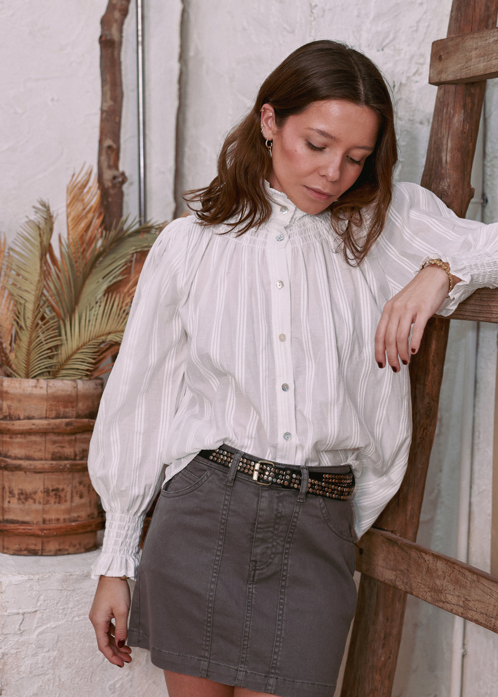 White blouse with embossed line detailing, loose fit, puffed sleeves, high neck, and gathered cuffs.