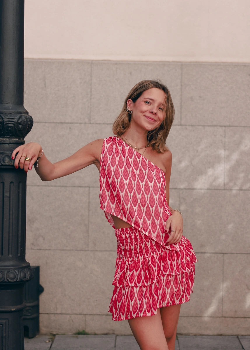 Short honeycomb-style skirt with ruffles and glitter detail in the print.
