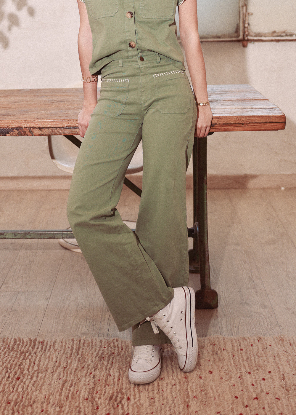 Straight-cut green trousers with front pockets decorated with cream-colored thread embroidery.