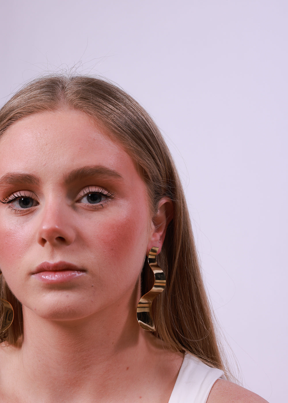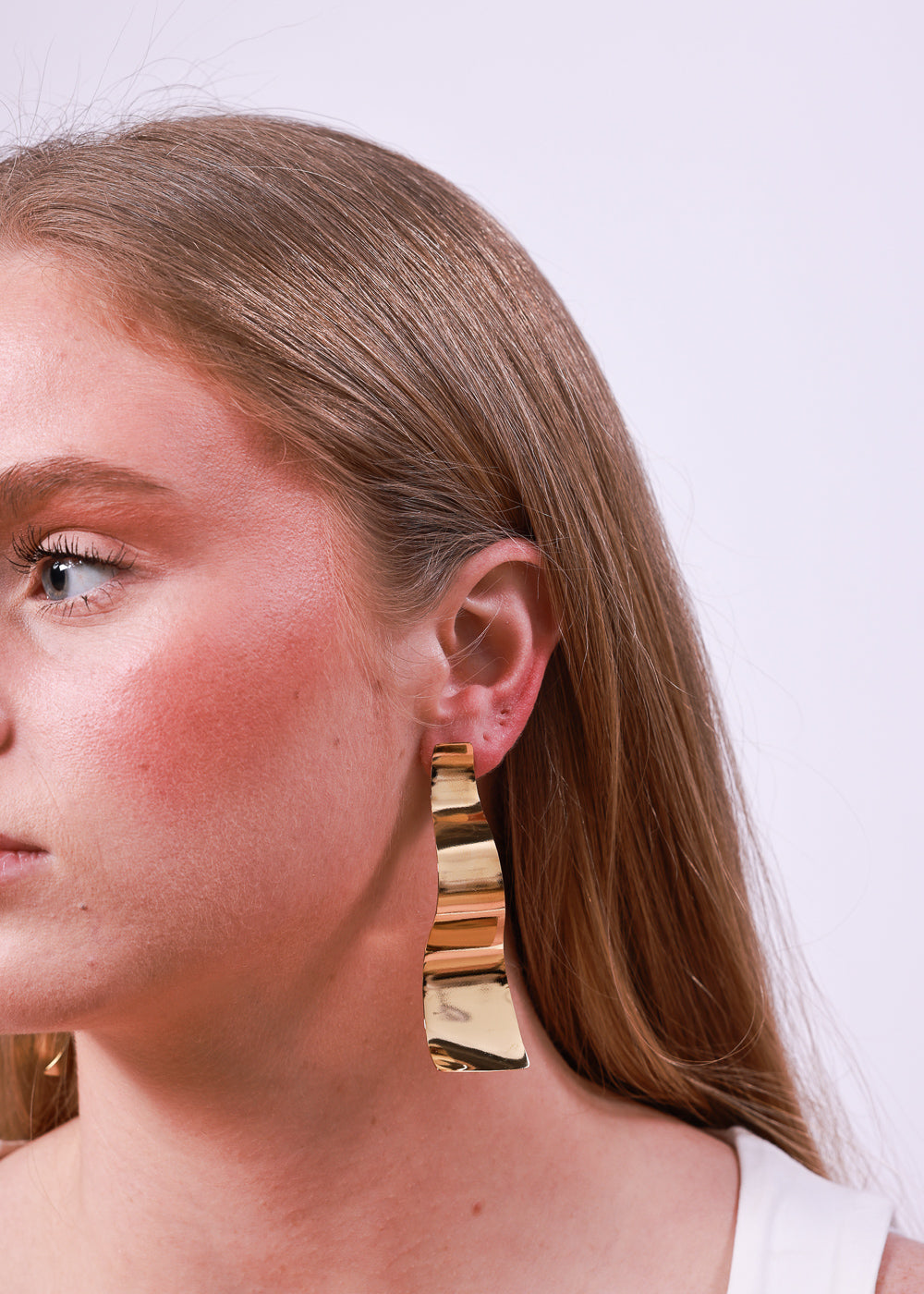 Gold-plated earrings in a wavy and elongated shape made of surgical stainless steel.