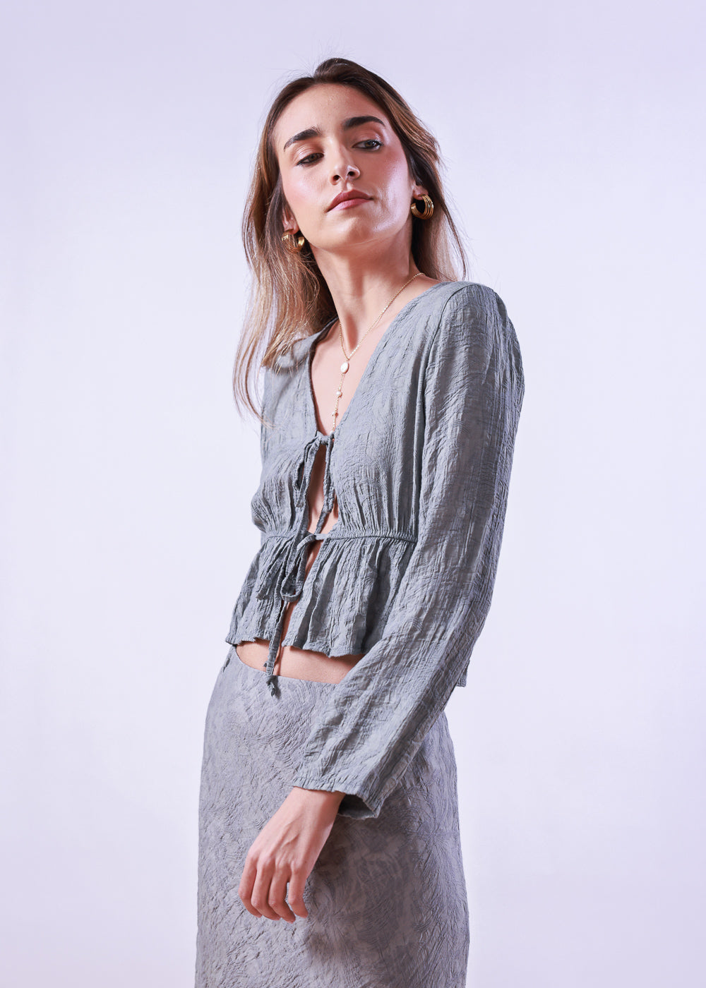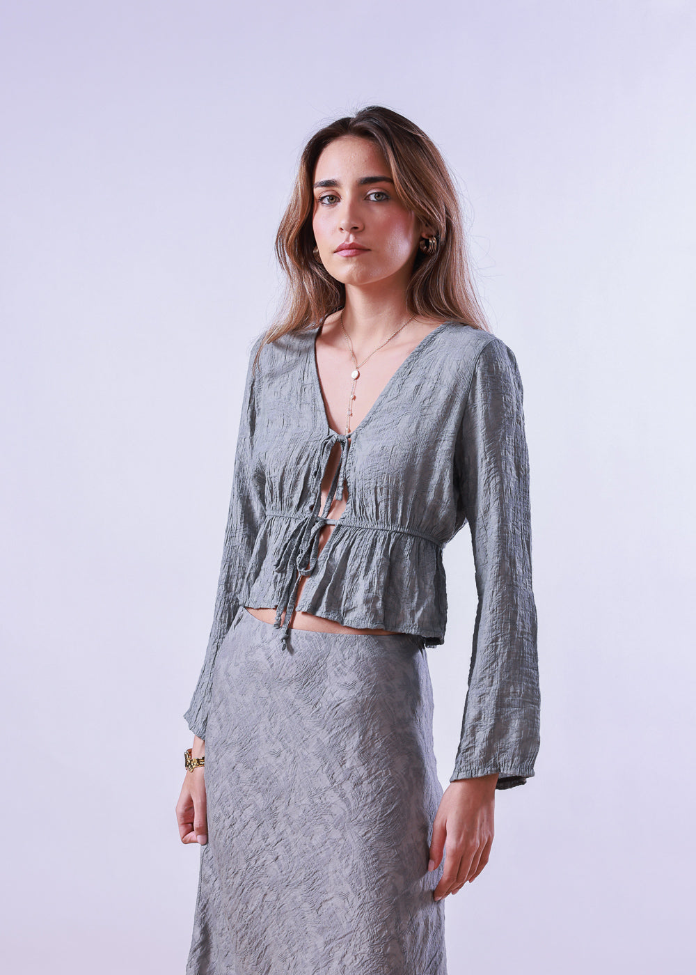 Satin gray top with textures and adjustable ties at the neckline, with long sleeves.