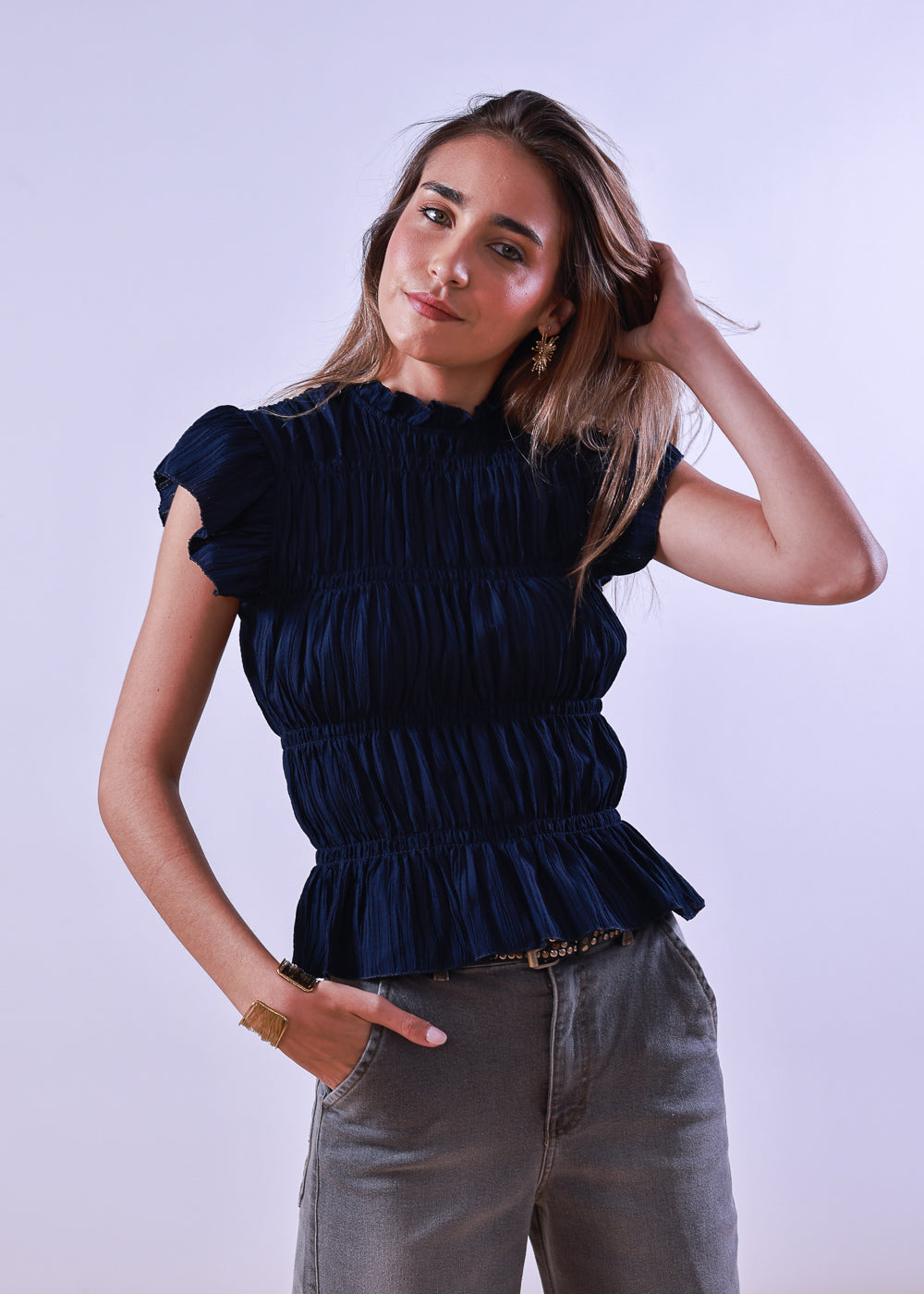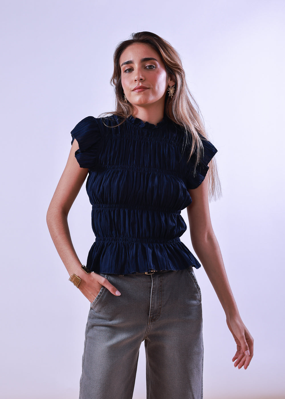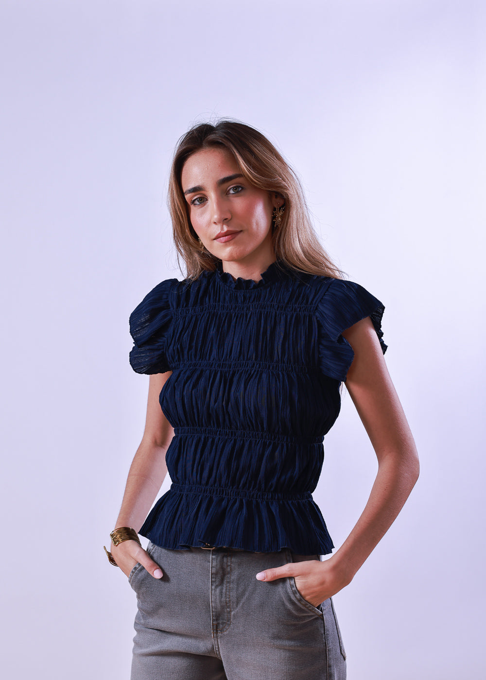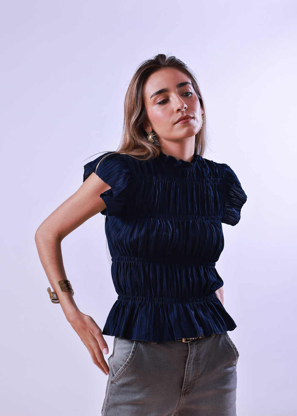 Navy blue top with gathers and ruffles on the sleeves, with a closed round neck.
