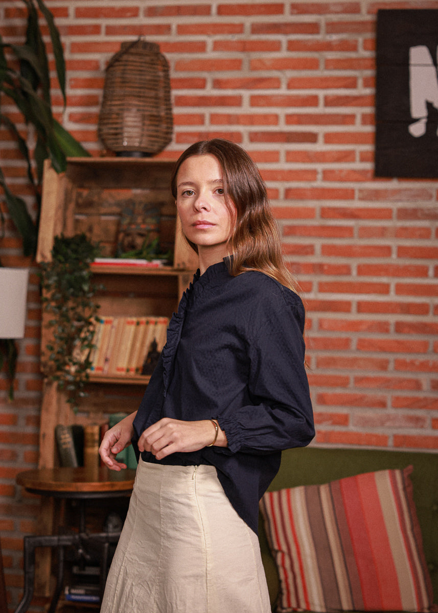 Blusa en color azul con pequeños puntos en relieve, cuello camisero y cierre frontal de botones. Corte recto y puños fruncidos.