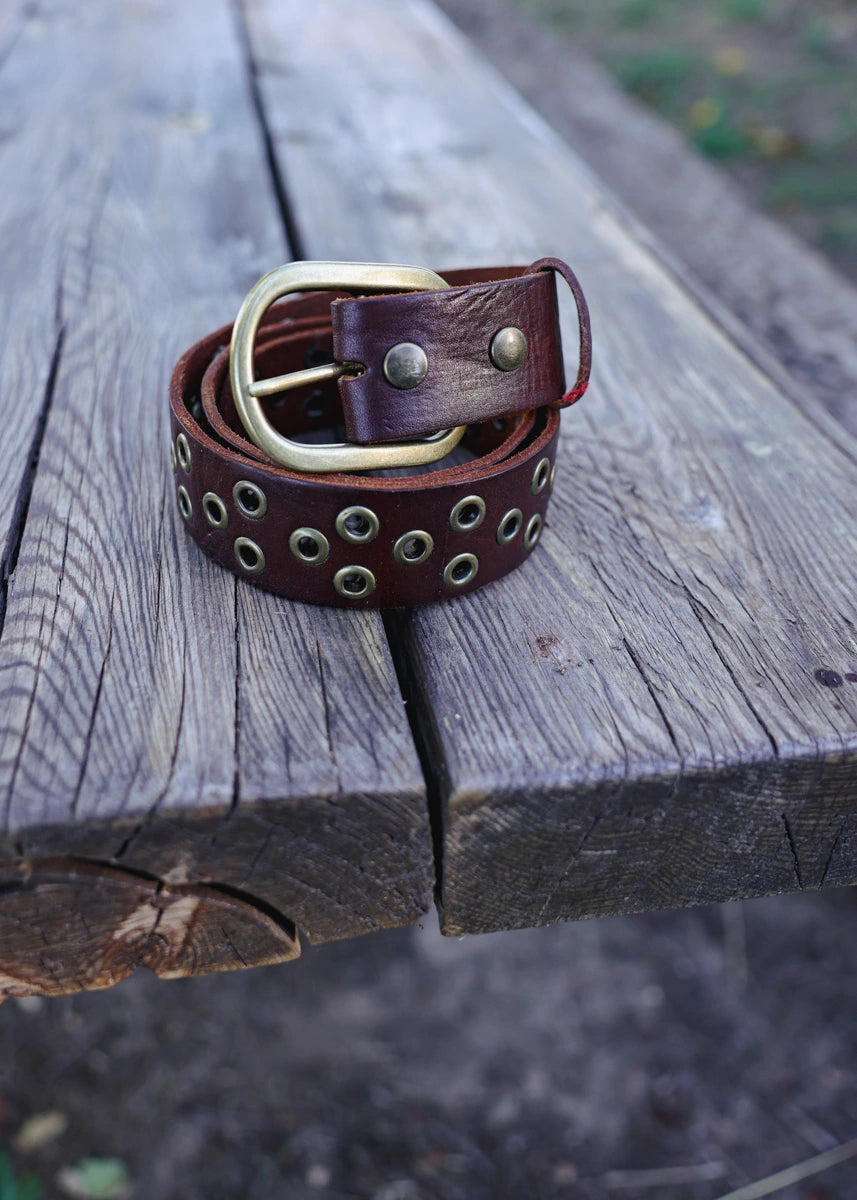 Brown leather belt with metal eyelet details and an antique bronze buckle.