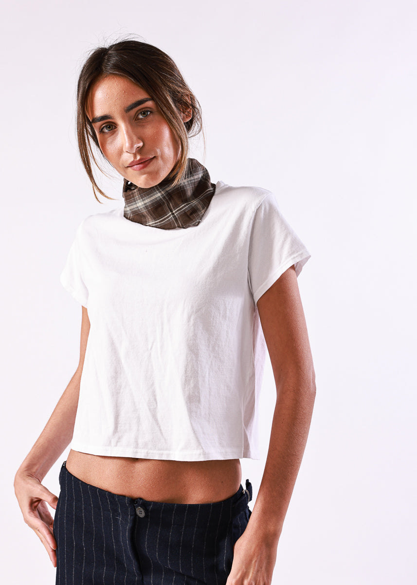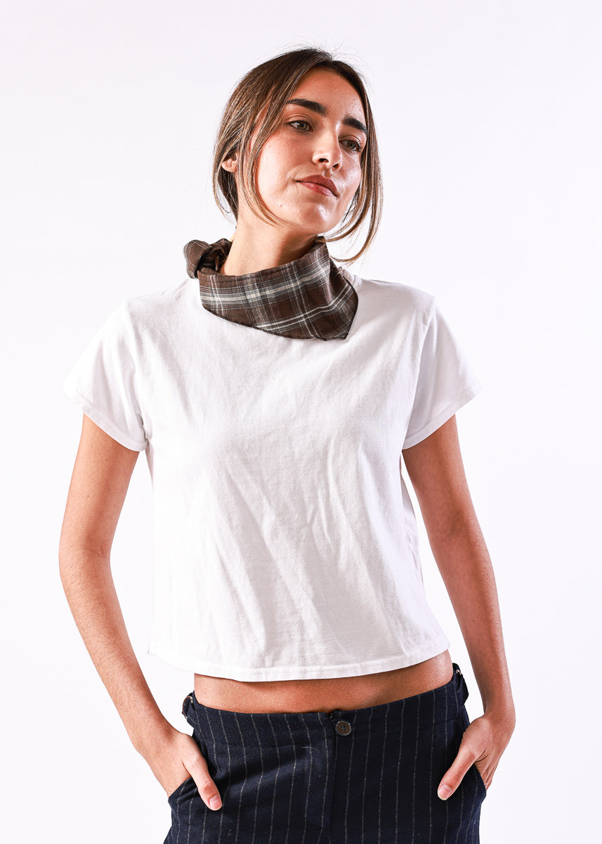 Pañuelo corto de cuello con estampado de cuadros en tonos marrones. Fácil de combinar.