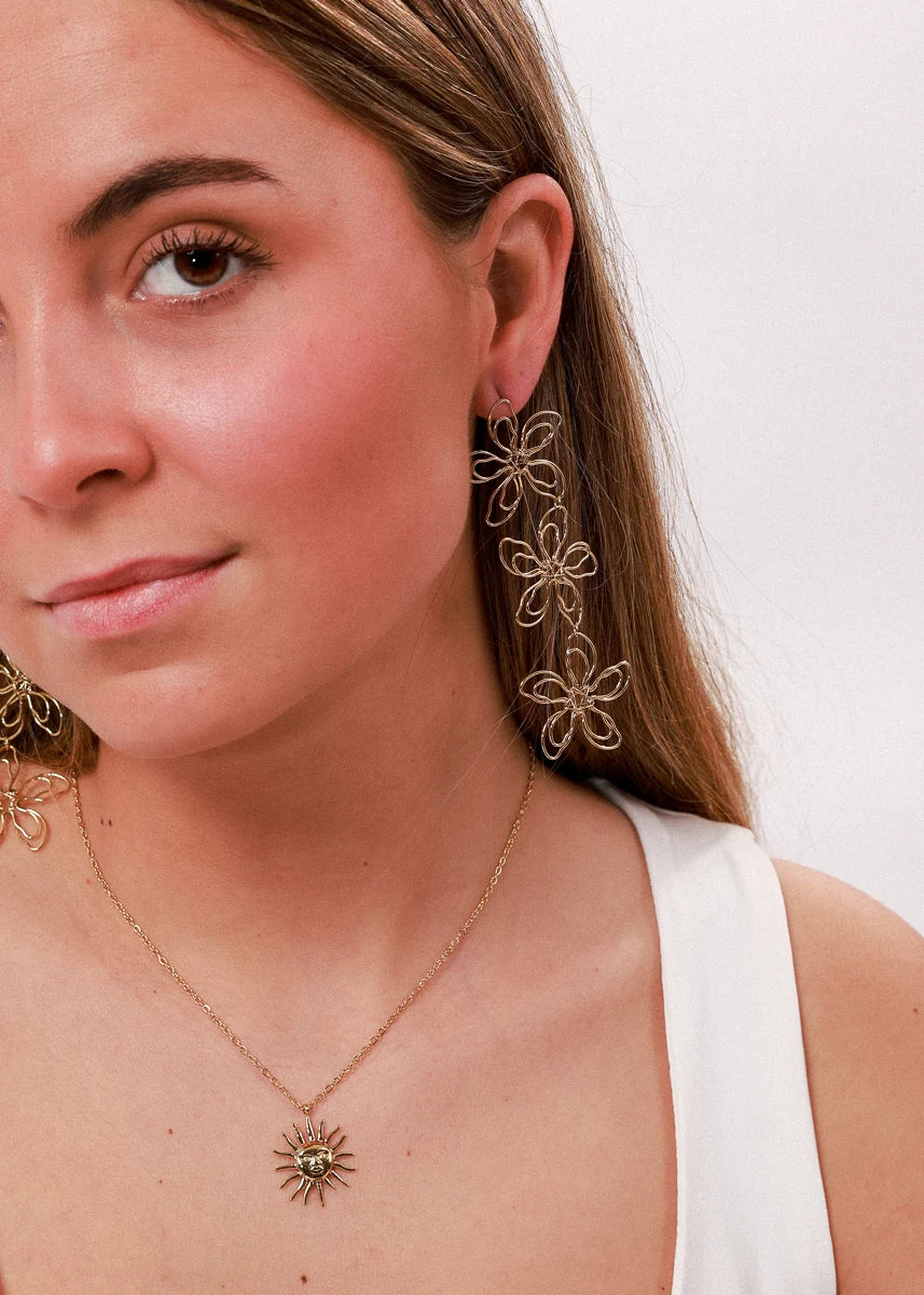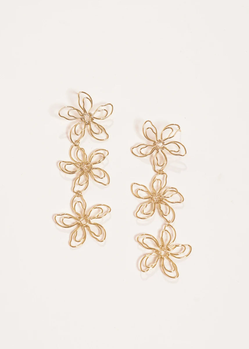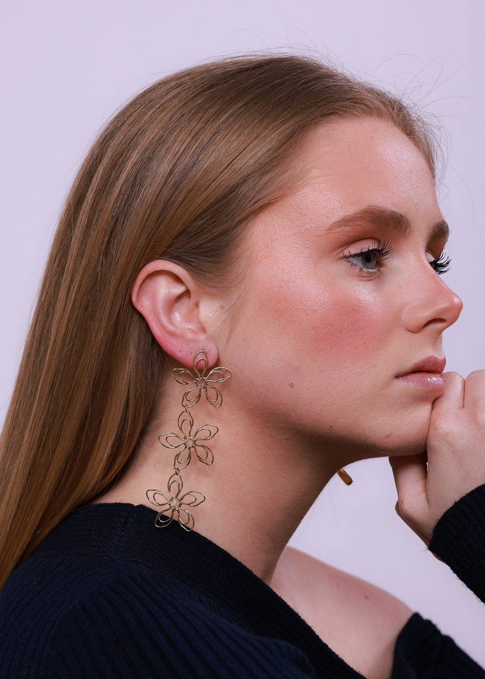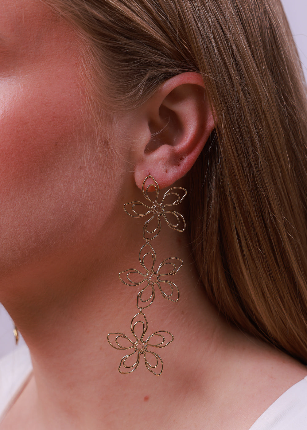 Long earrings with three flower figures in gold color and surgical stainless steel.