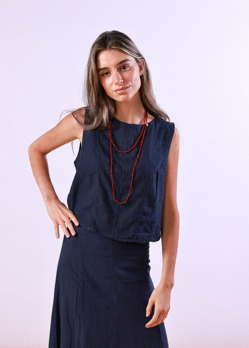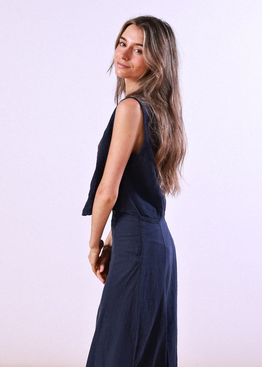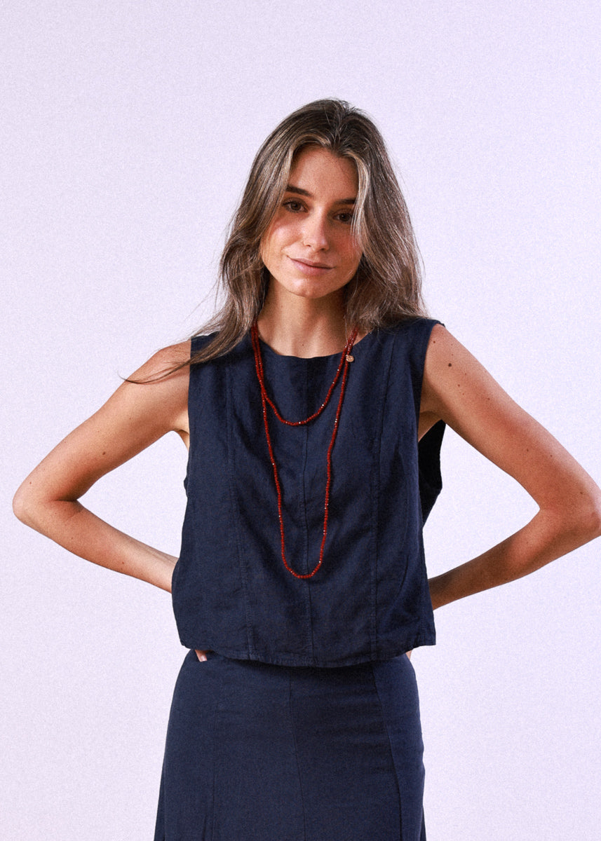 Navy blue linen top with wide straps and a round neck.