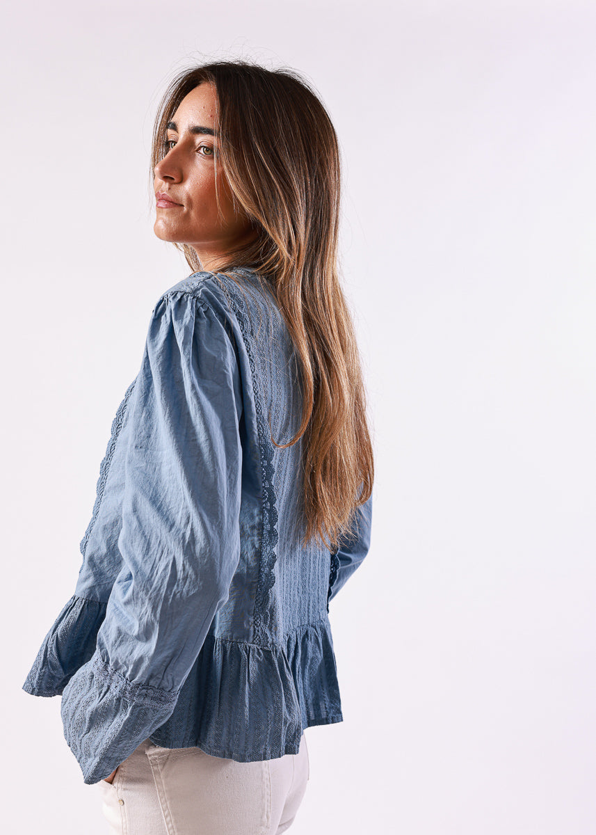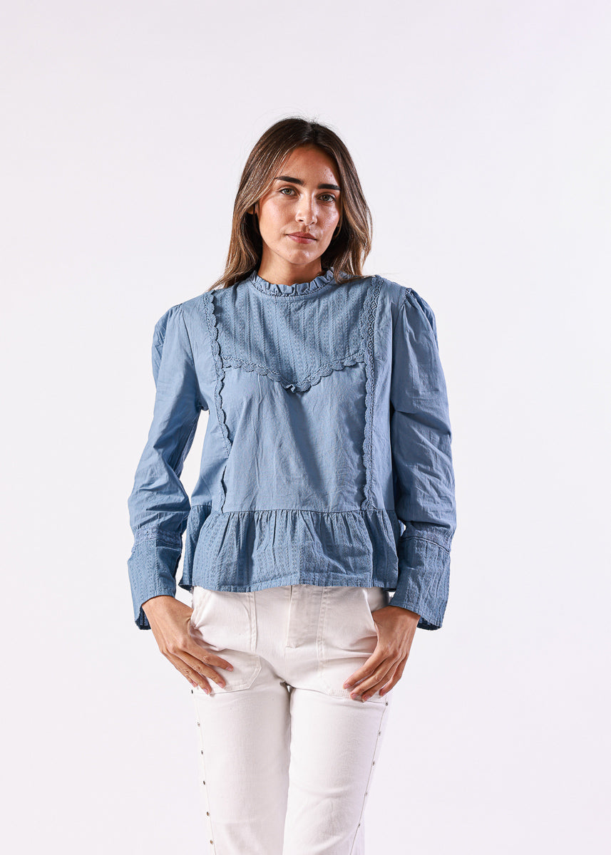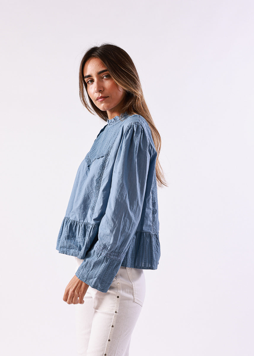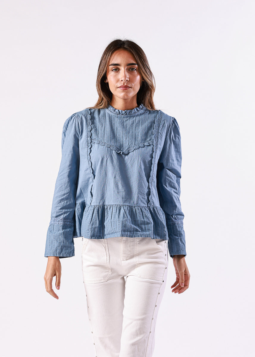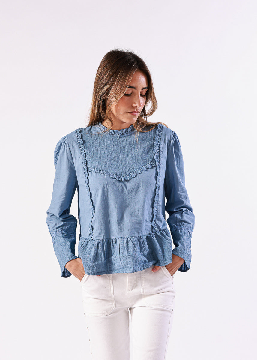 Blusa en color azul de manga larga, con cuello alto fruncido y detalles de encaje en la zona frontal, de corte recto con volantes en el bajo.