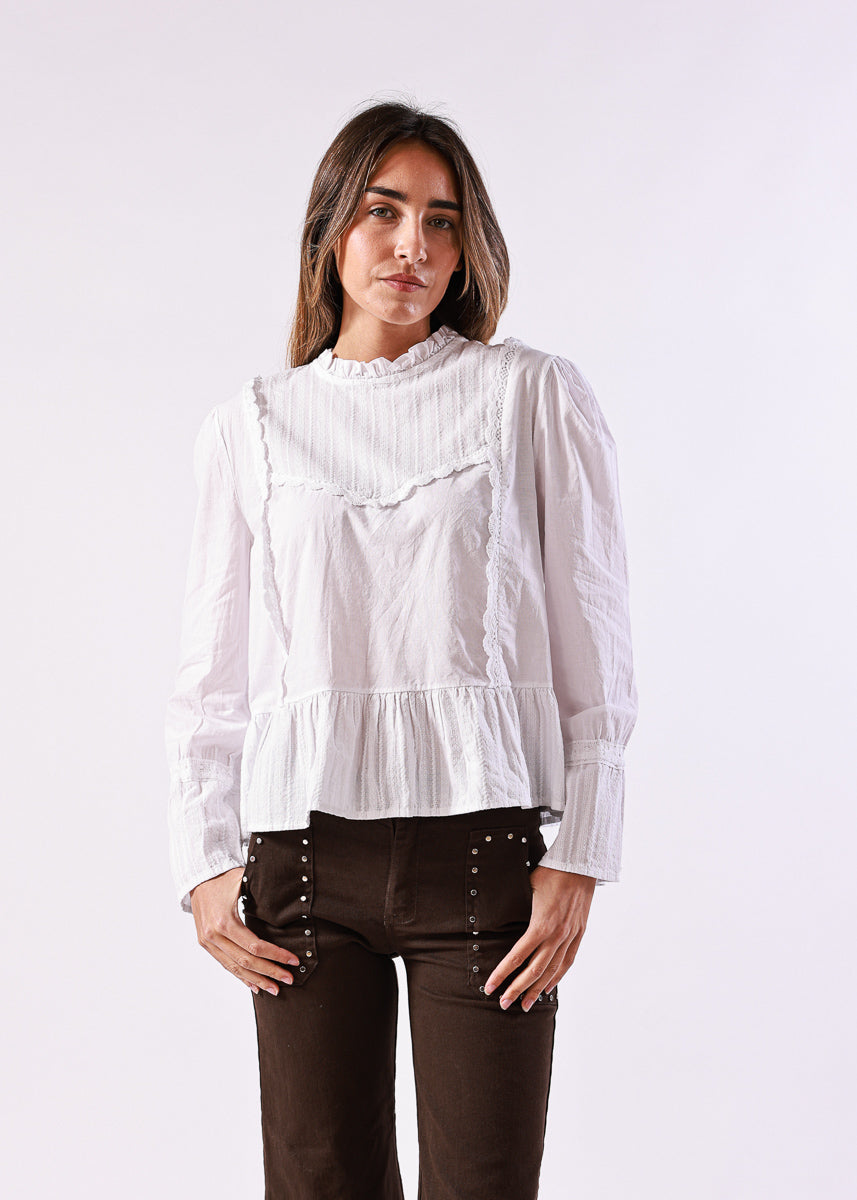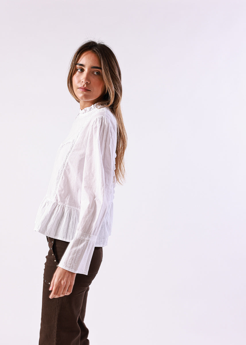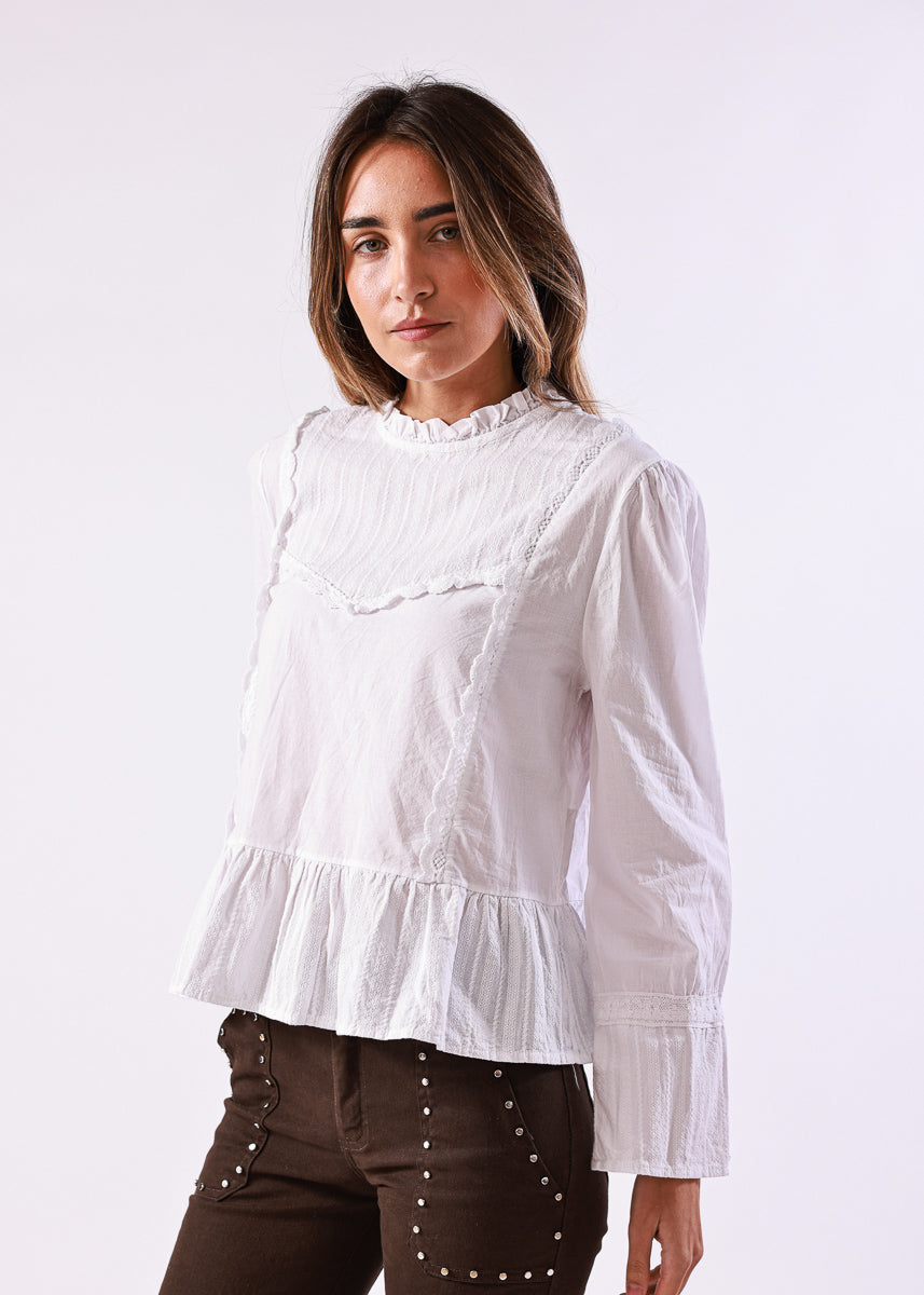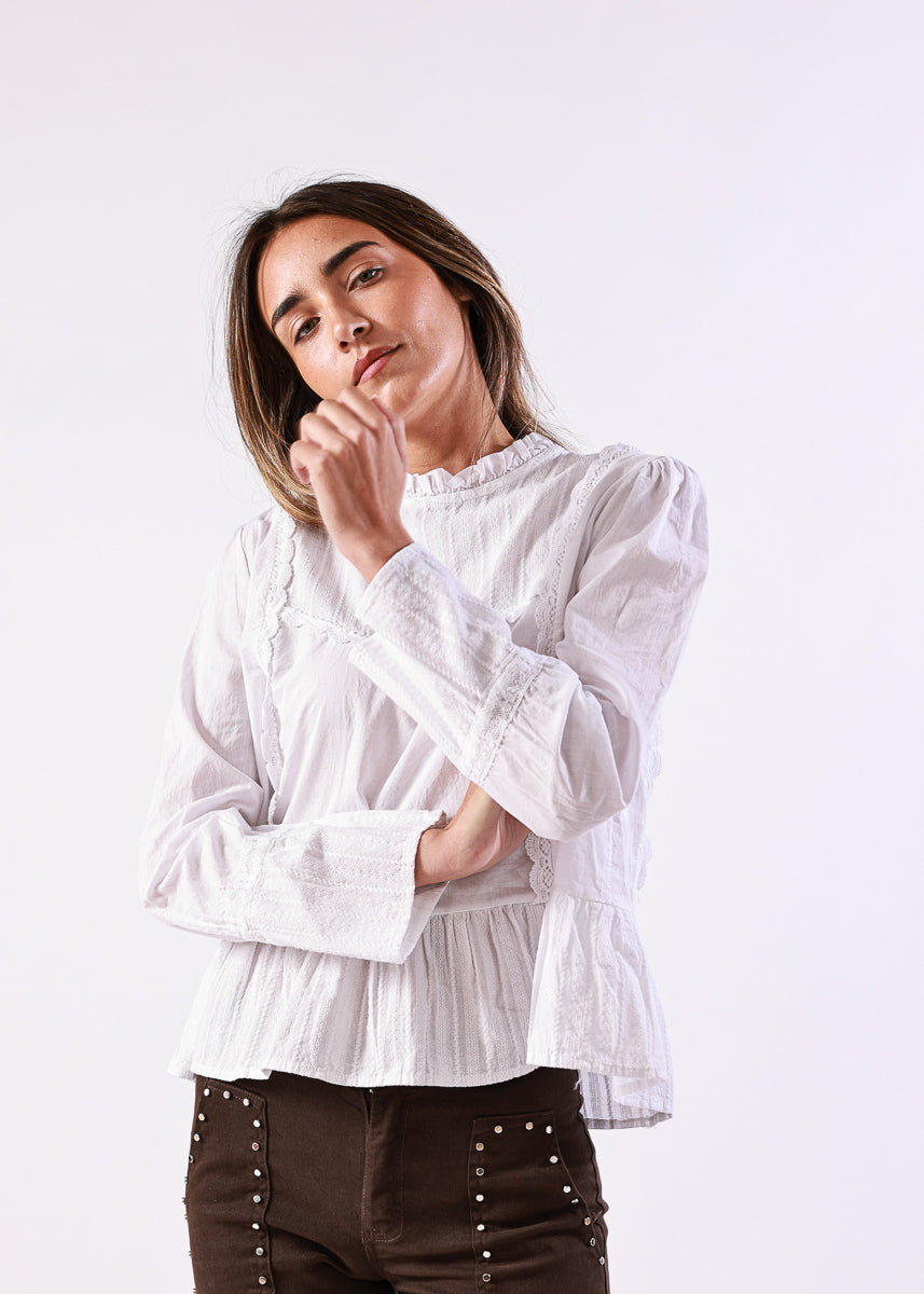 Blusa en color blanco de manga larga, con cuello alto fruncido y detalles de encaje en la zona frontal, de corte recto con volantes en el bajo.
