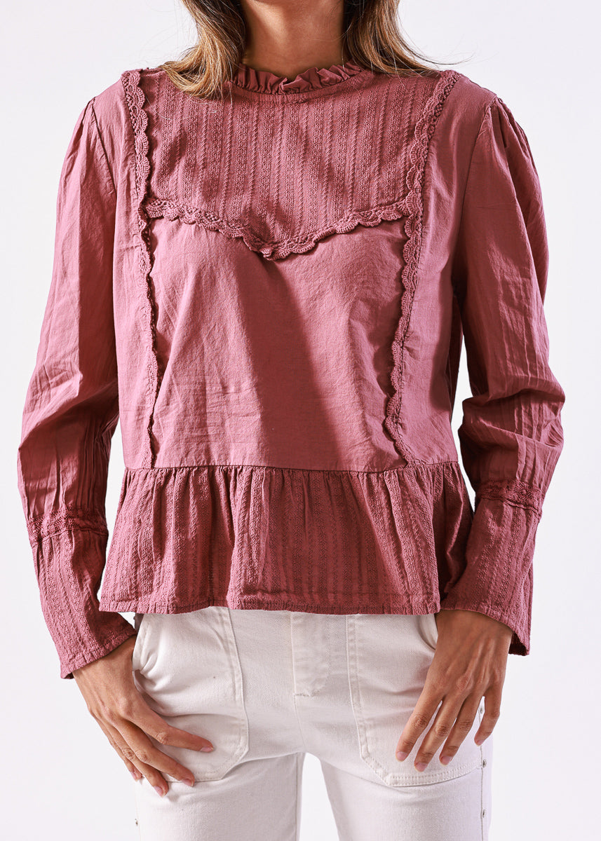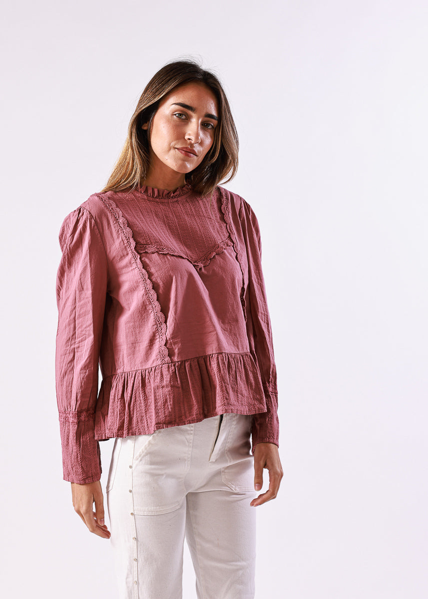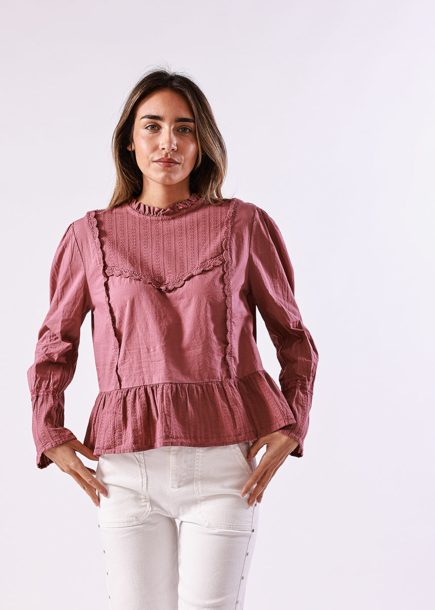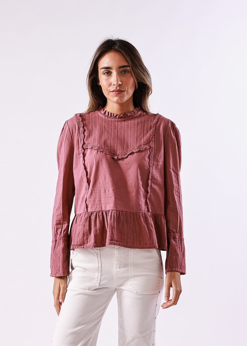 Blusa en color rosa de manga larga, con cuello alto fruncido y detalles de encaje en la zona frontal, de corte recto con volantes en el bajo.