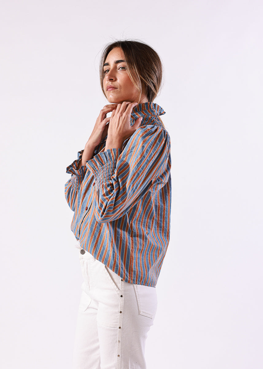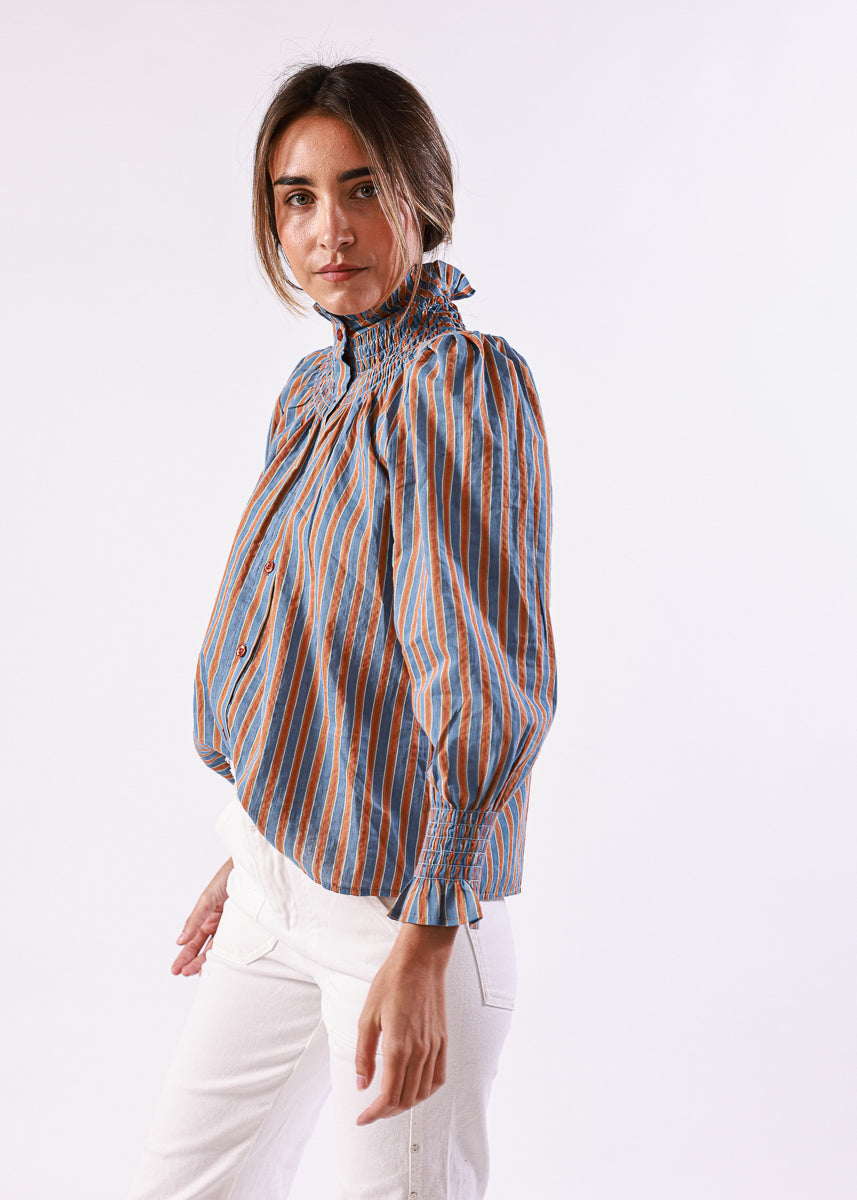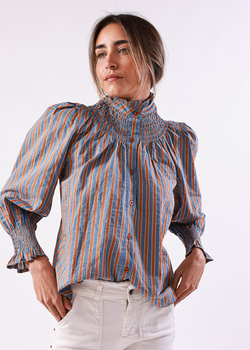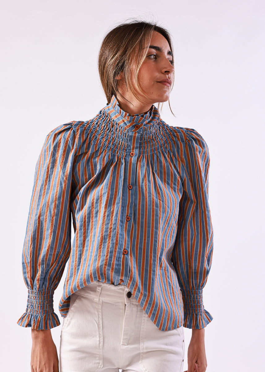 Blusa de rayas verticales en tonos azul y naranja, con cuello alto fruncido y cierre de botones. Mangas largas abullonadas con puños fruncidos.
